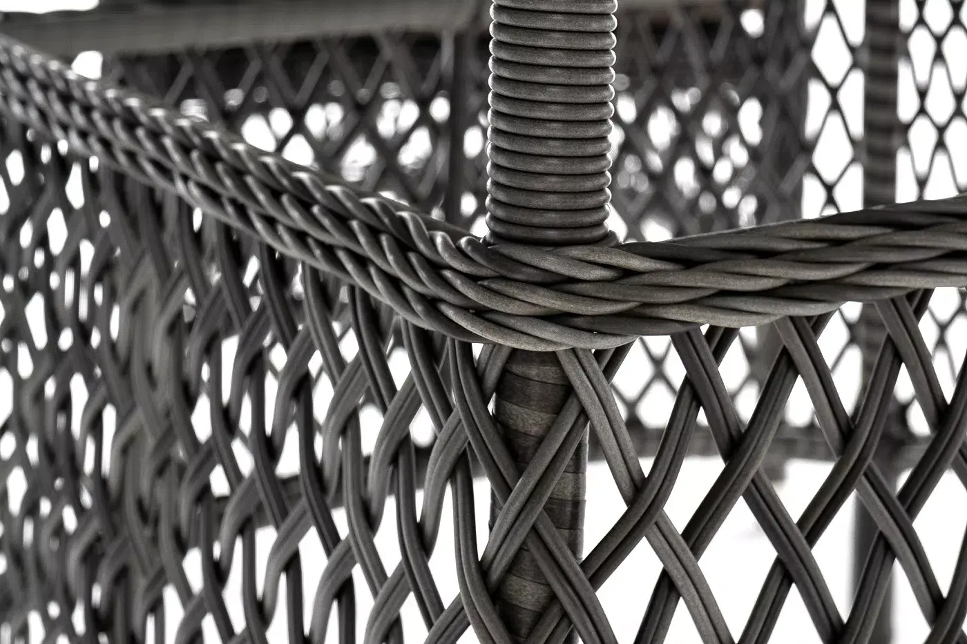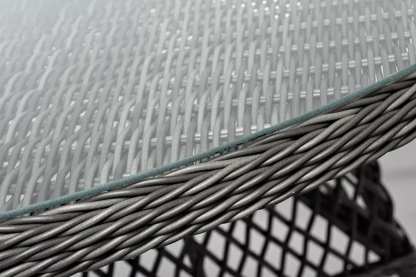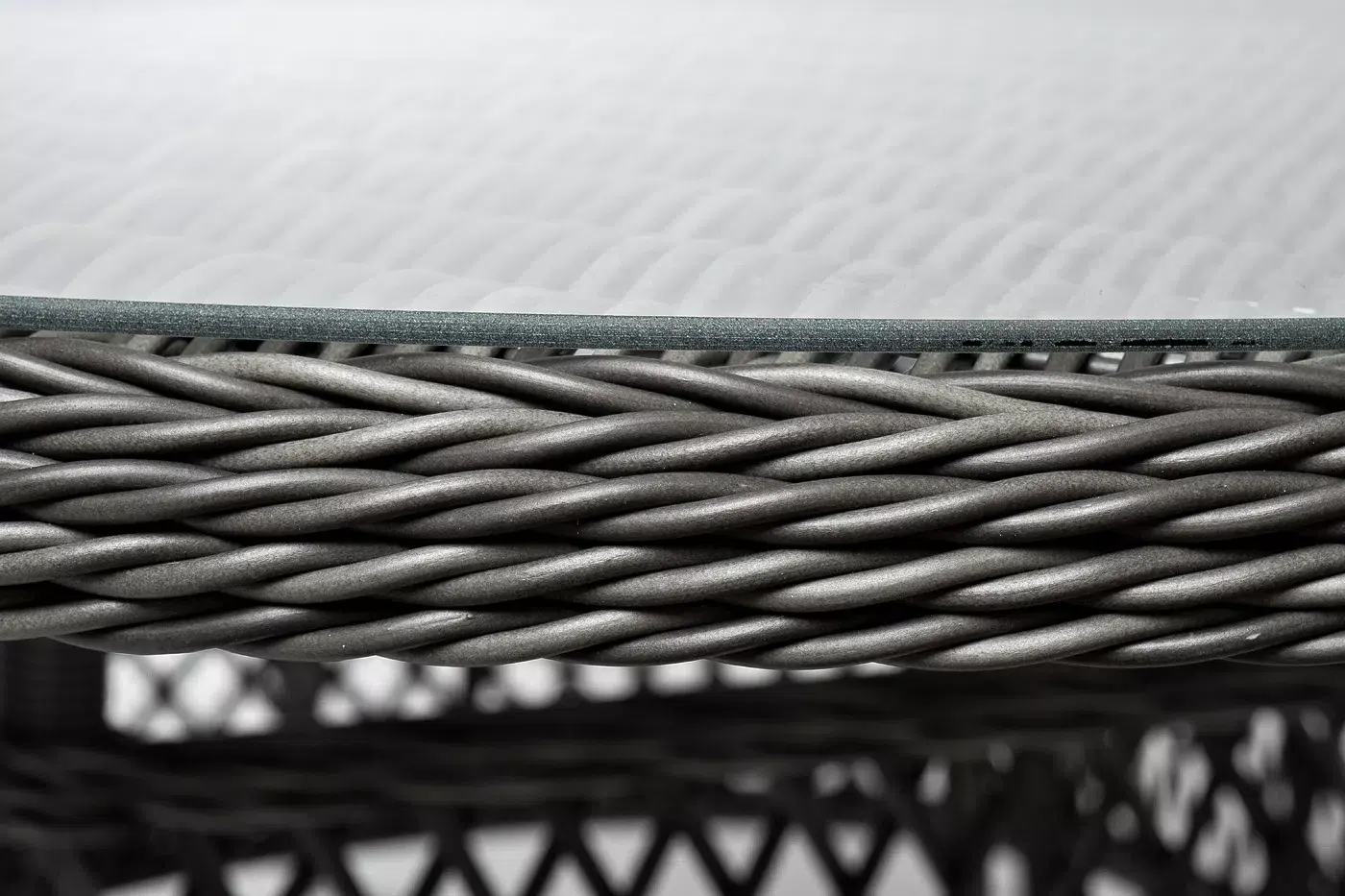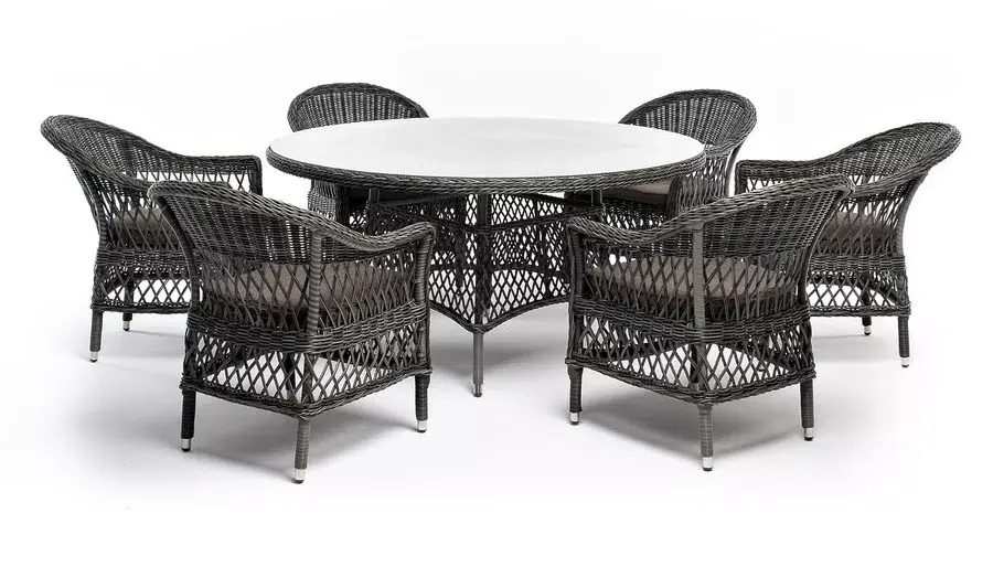 Вся мебель изготовлена из долговечного и легкого алюминия, обтянутого синтетическим ротангом. На столе для удобства эксплуатации предусмотрена столешница из ударопрочного закаленного стекла 5 мм. Стулья укомплектованы подушками на сидениях.