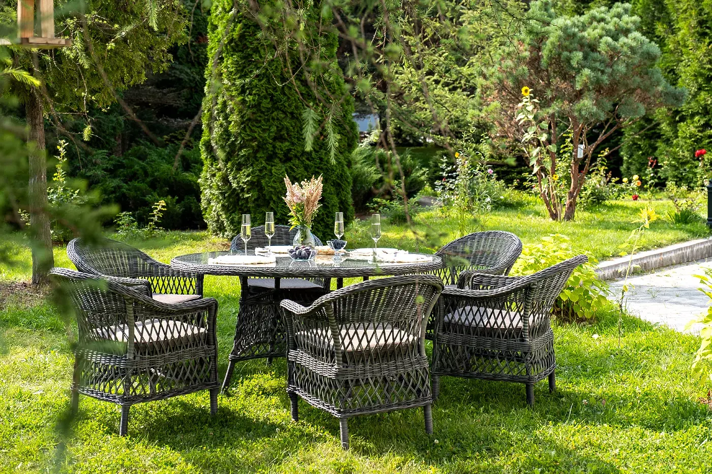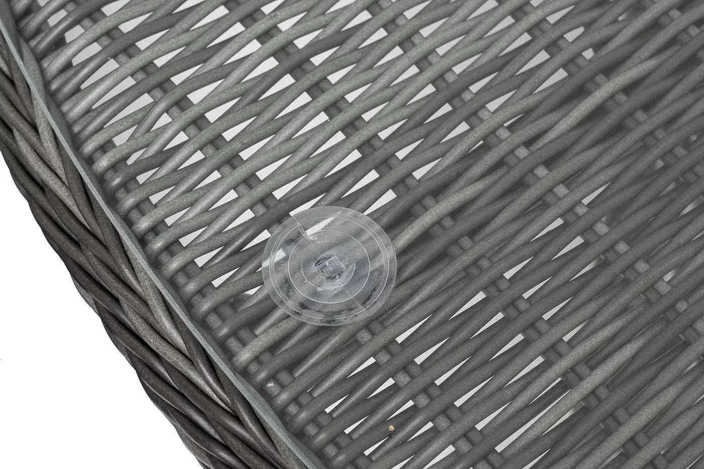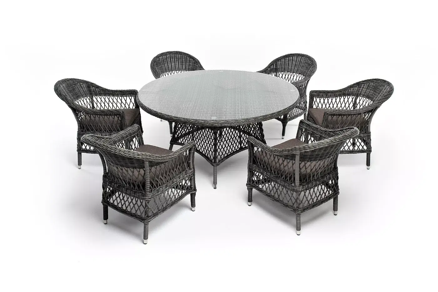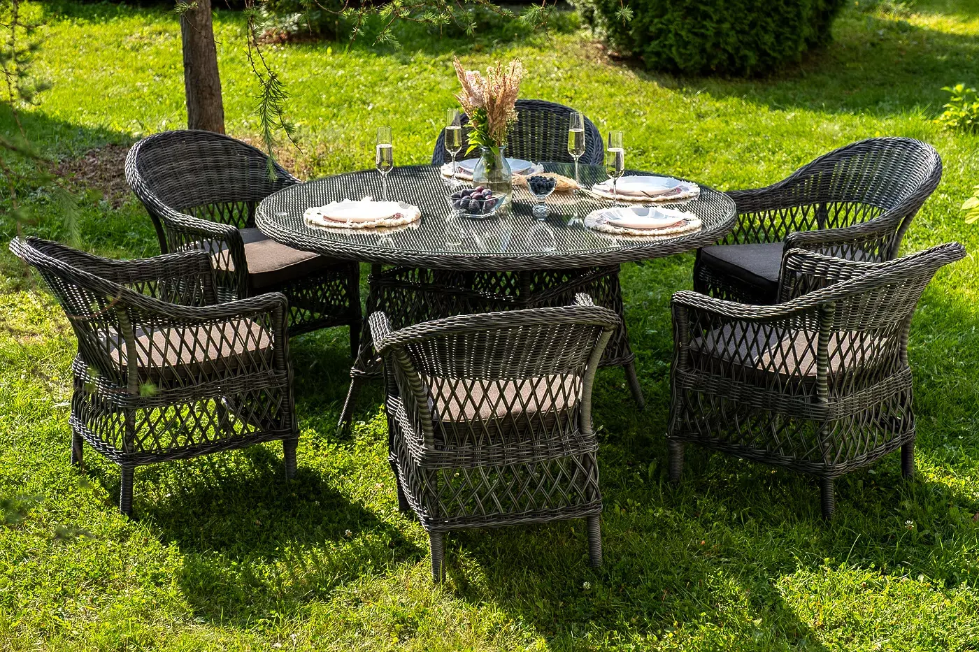 Вся мебель изготовлена из долговечного и легкого алюминия, обтянутого синтетическим ротангом. На столе для удобства эксплуатации предусмотрена столешница из ударопрочного закаленного стекла 5 мм. Стулья укомплектованы подушками на сидениях.