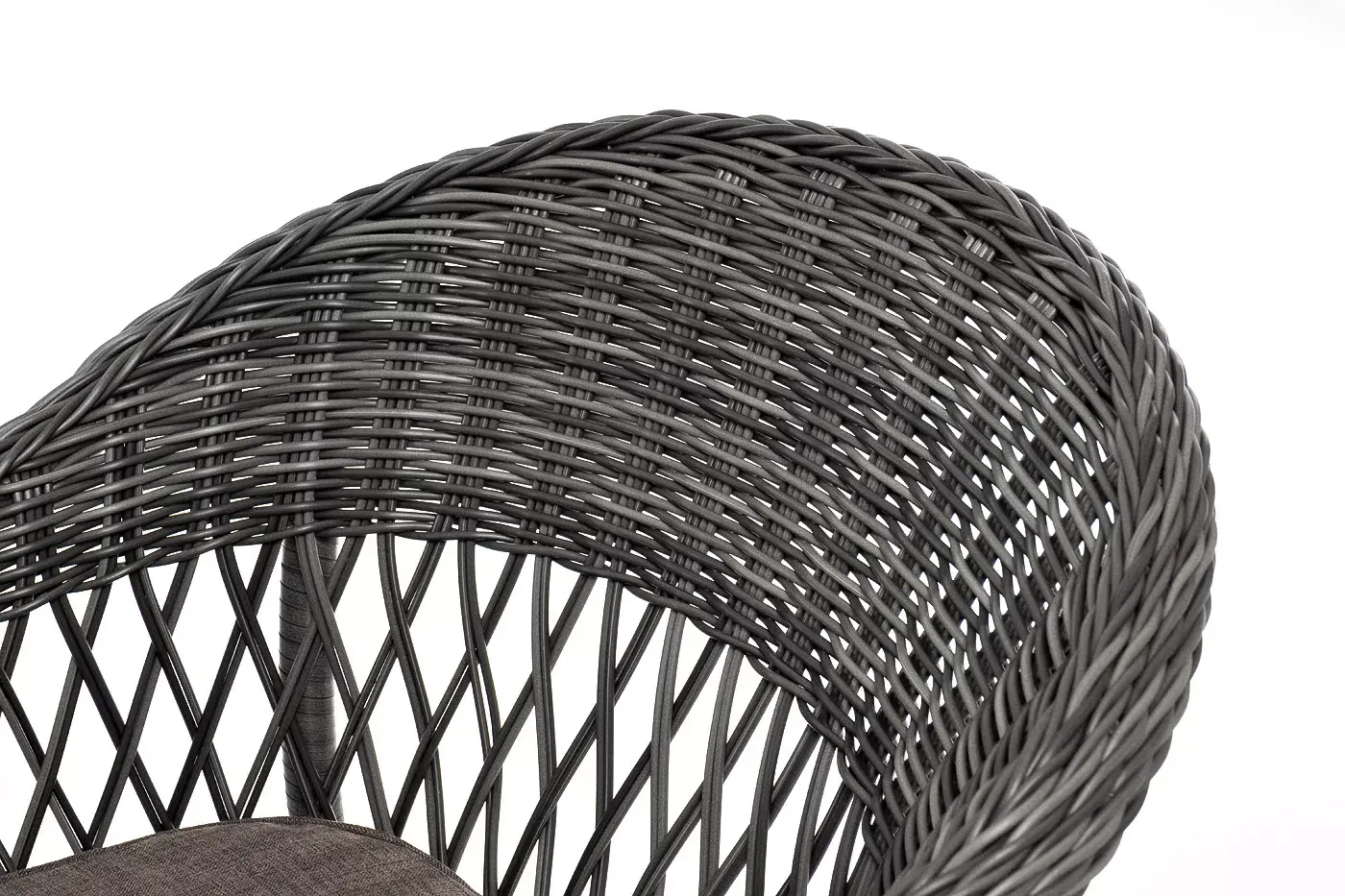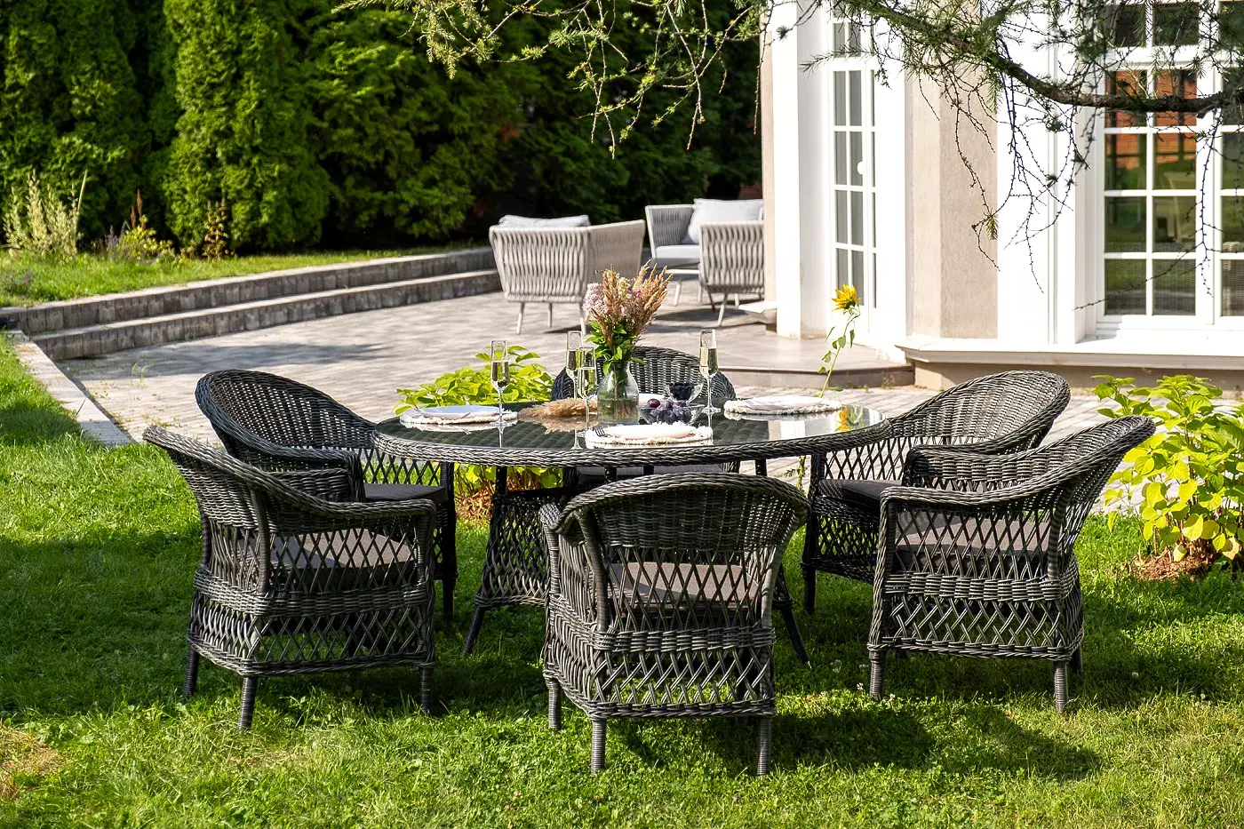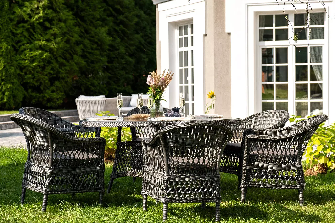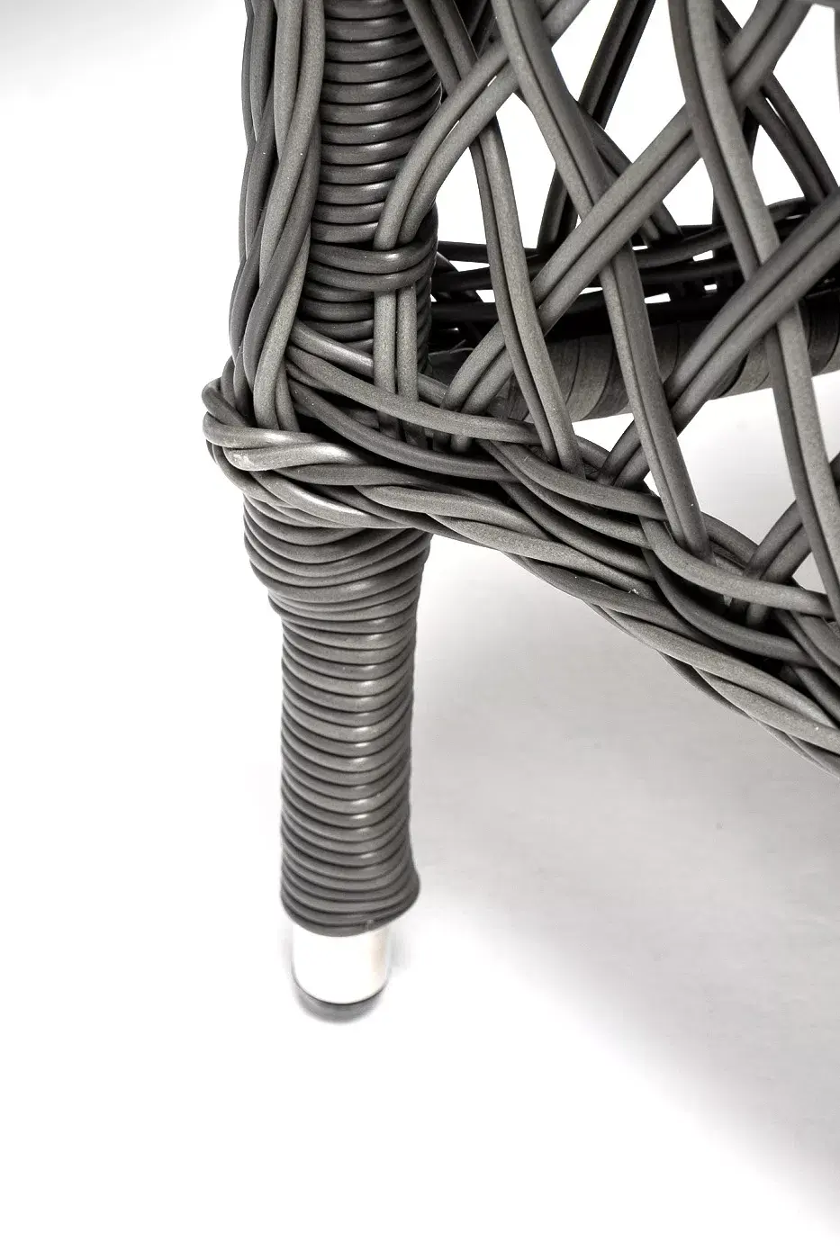 Вся мебель изготовлена из долговечного и легкого алюминия, обтянутого синтетическим ротангом. На столе для удобства эксплуатации предусмотрена столешница из ударопрочного закаленного стекла 5 мм. Стулья укомплектованы подушками на сидениях.