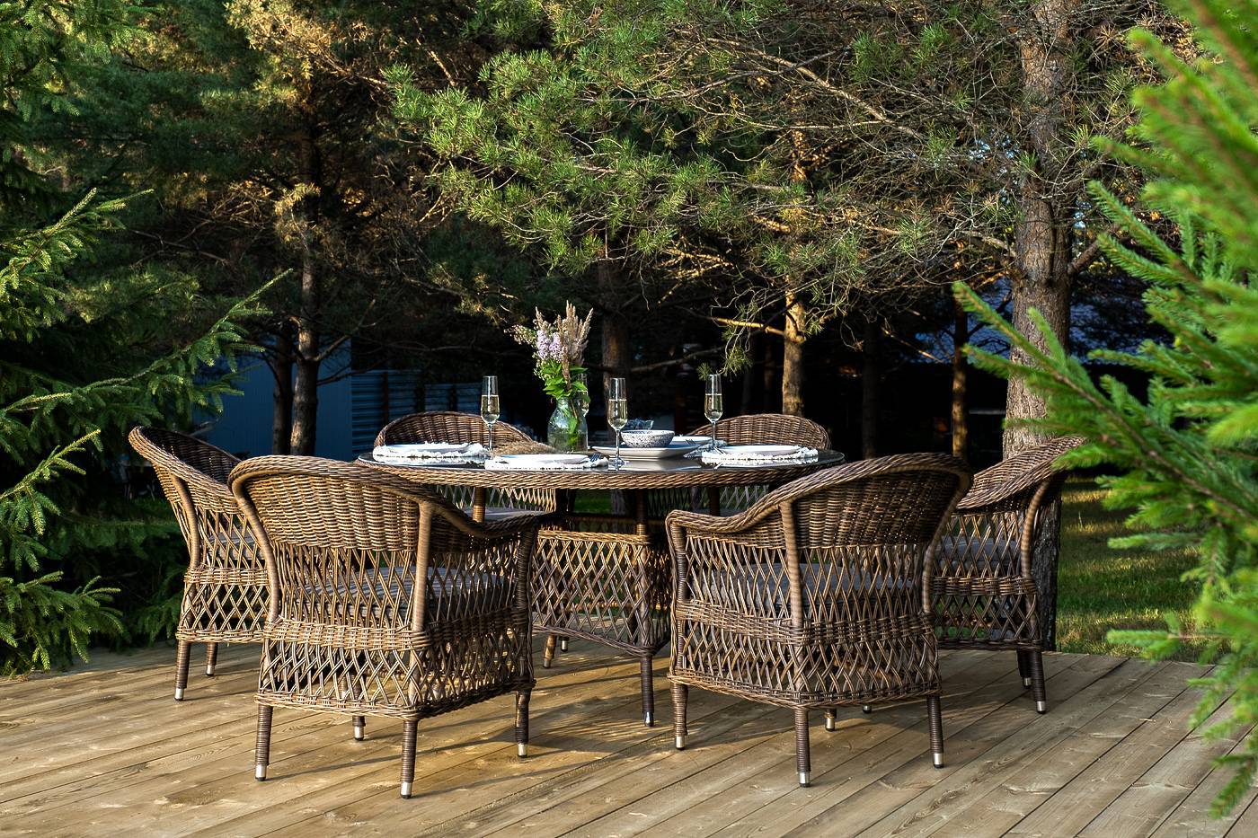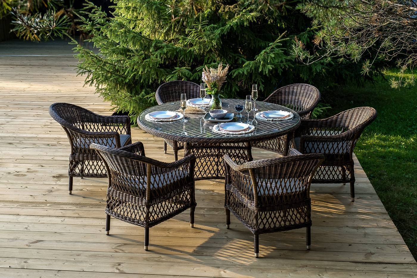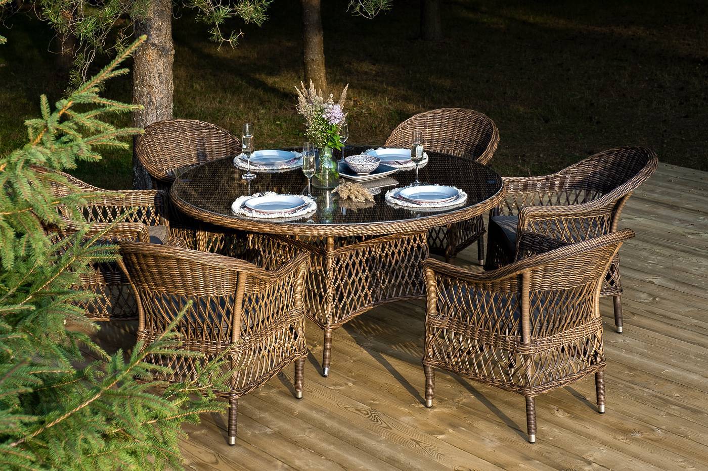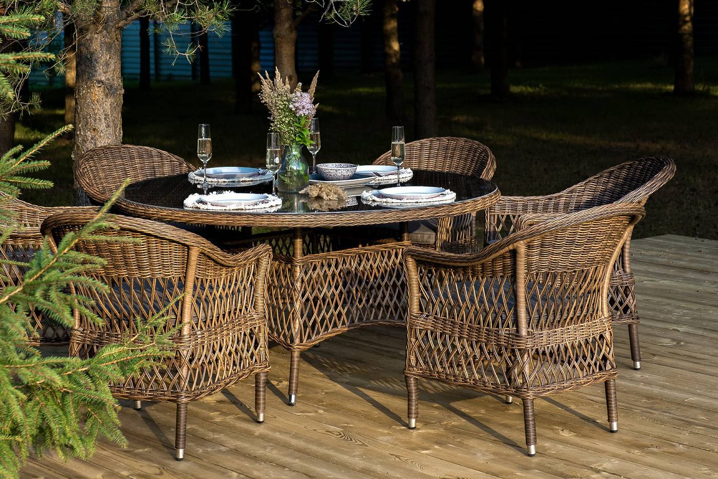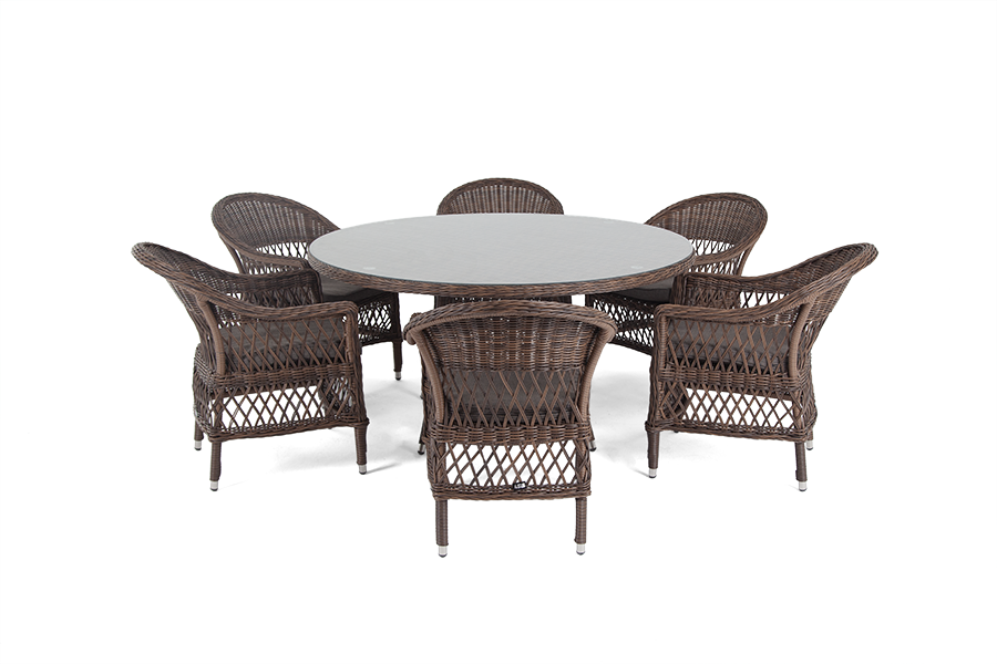 Вся мебель изготовлена из долговечного и легкого алюминия, обтянутого синтетическим ротангом. На столе для удобства эксплуатации предусмотрена столешница из ударопрочного закаленного стекла 5 мм. Стулья укомплектованы подушками на сидениях.