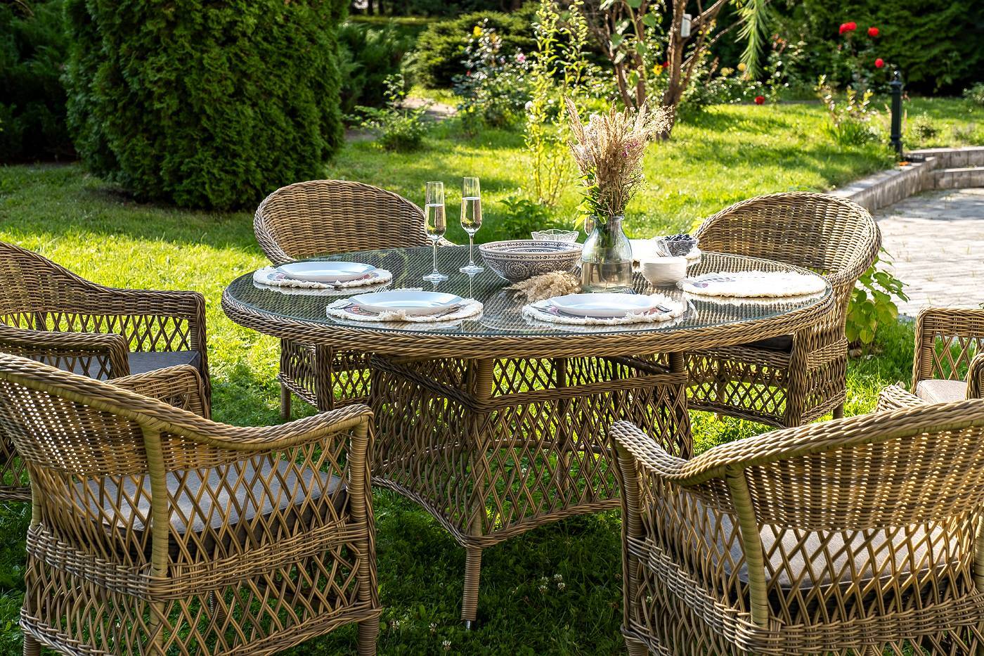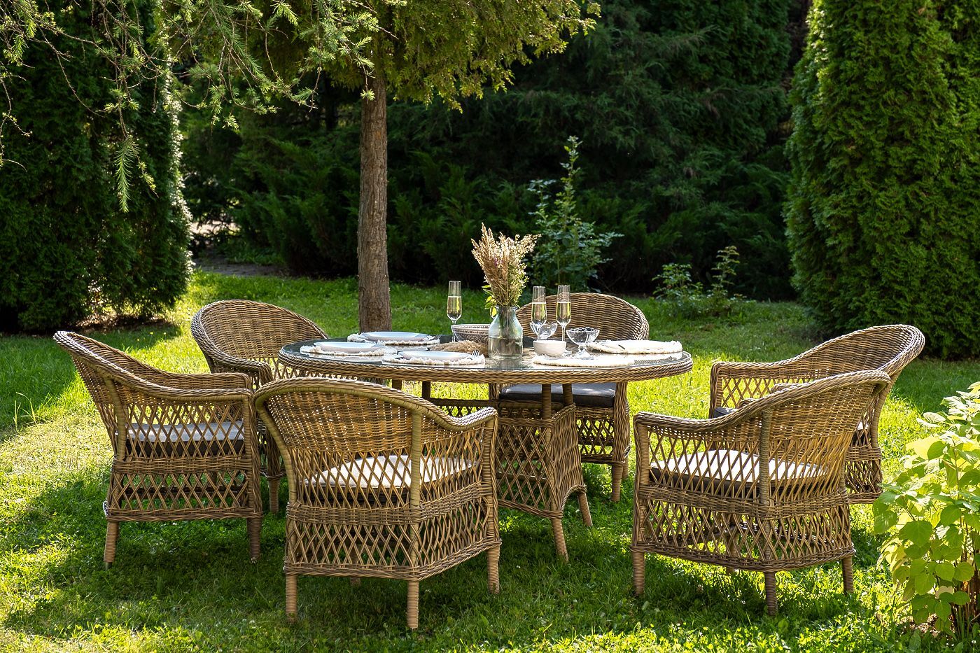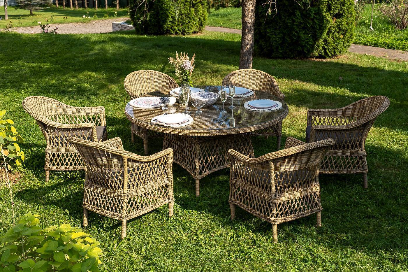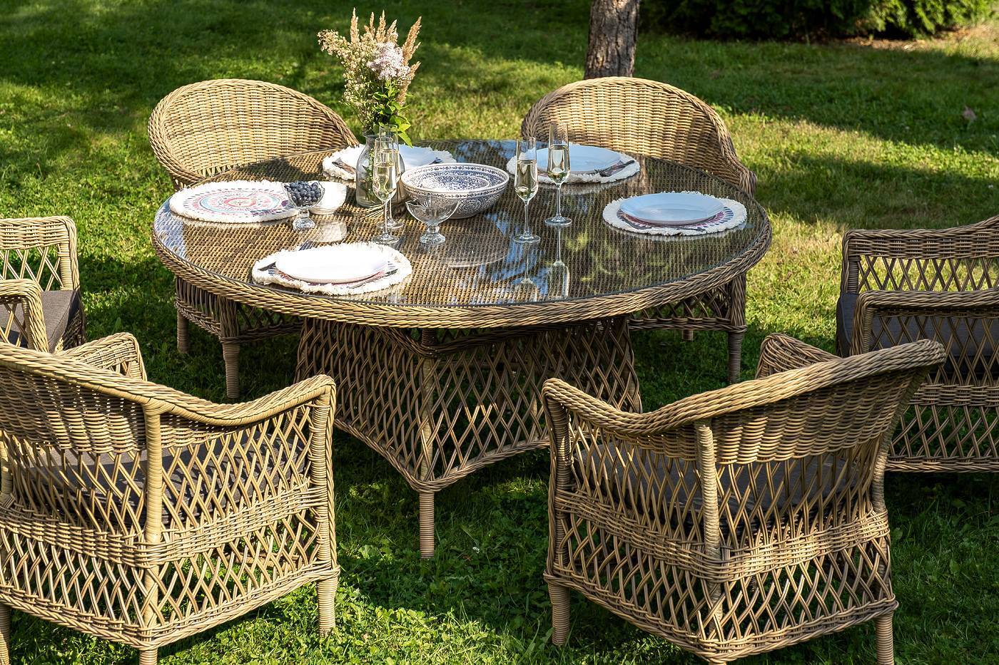 Вся мебель изготовлена из долговечного и легкого алюминия, обтянутого синтетическим ротангом. На столе для удобства эксплуатации предусмотрена столешница из ударопрочного закаленного стекла 5 мм. Стулья укомплектованы подушками на сидениях.