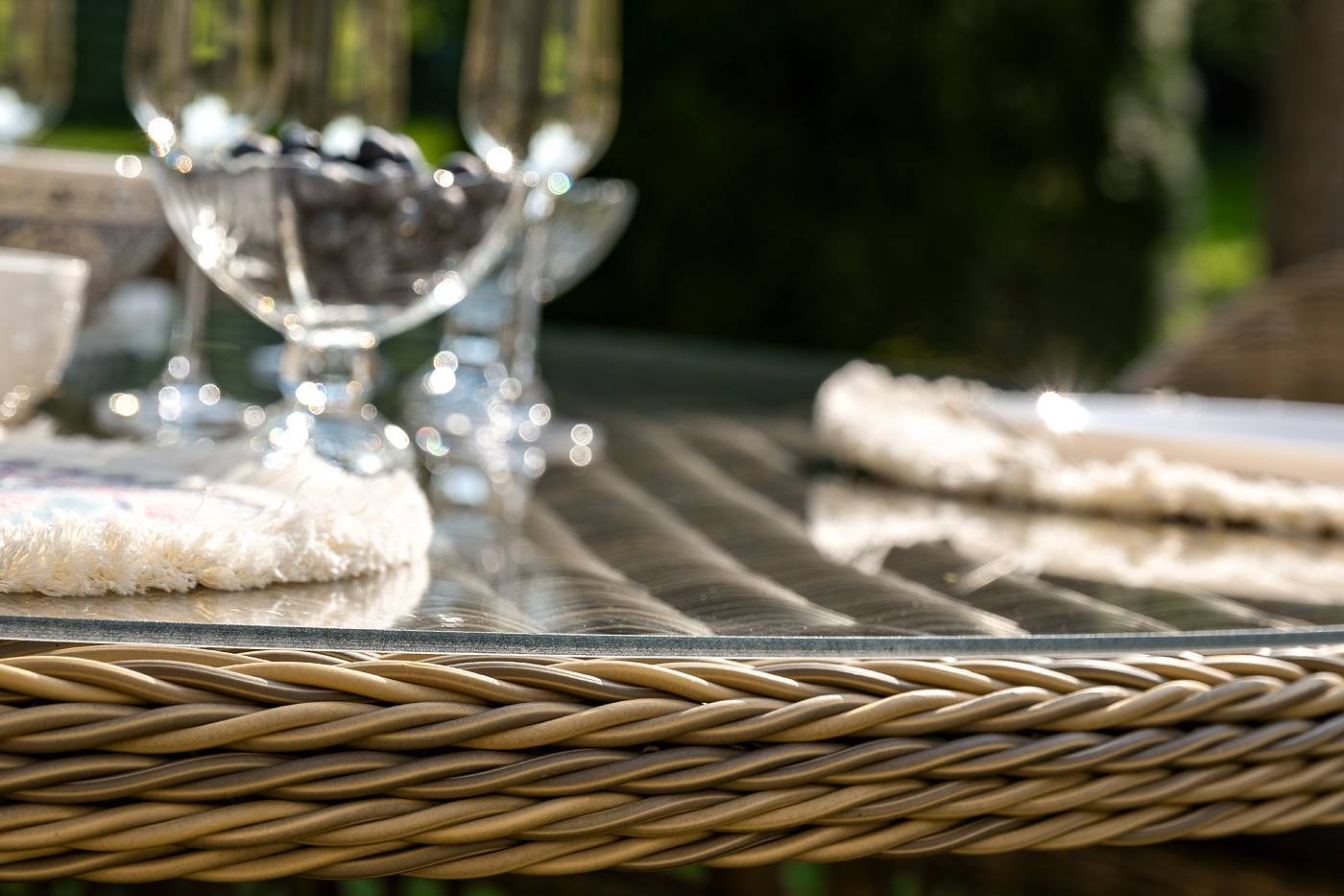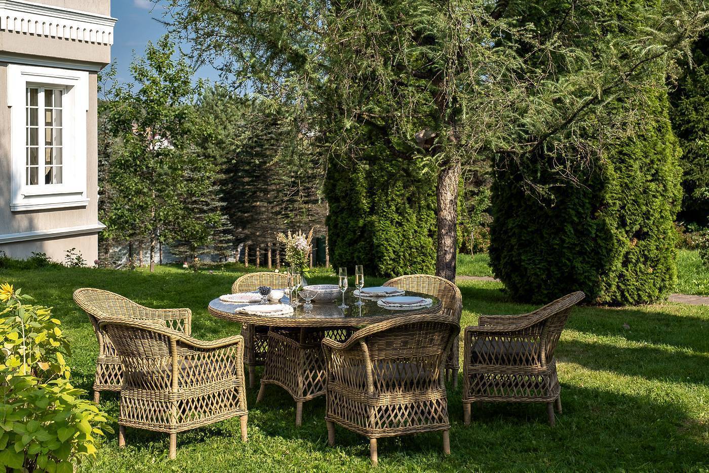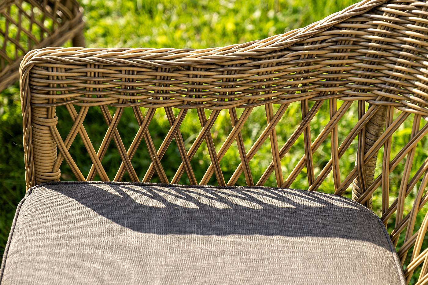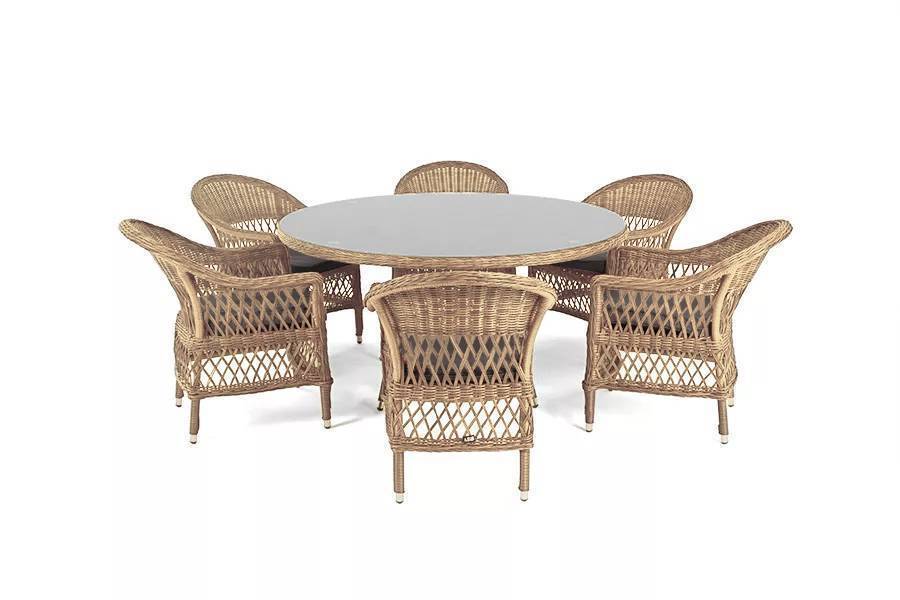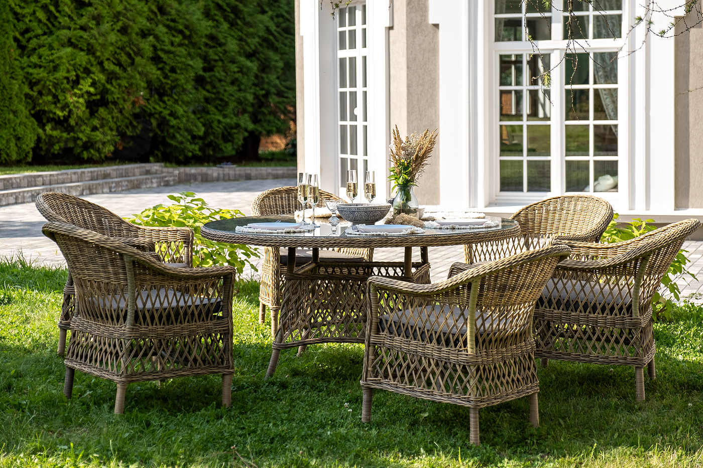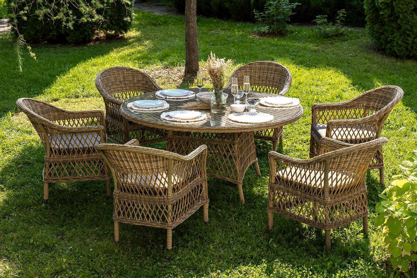 Вся мебель изготовлена из долговечного и легкого алюминия, обтянутого синтетическим ротангом. На столе для удобства эксплуатации предусмотрена столешница из ударопрочного закаленного стекла 5 мм. Стулья укомплектованы подушками на сидениях.