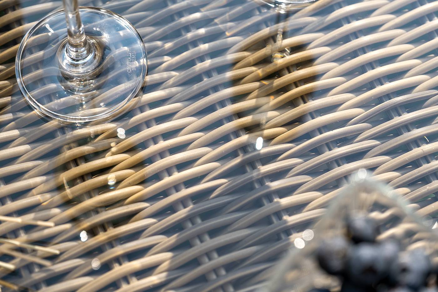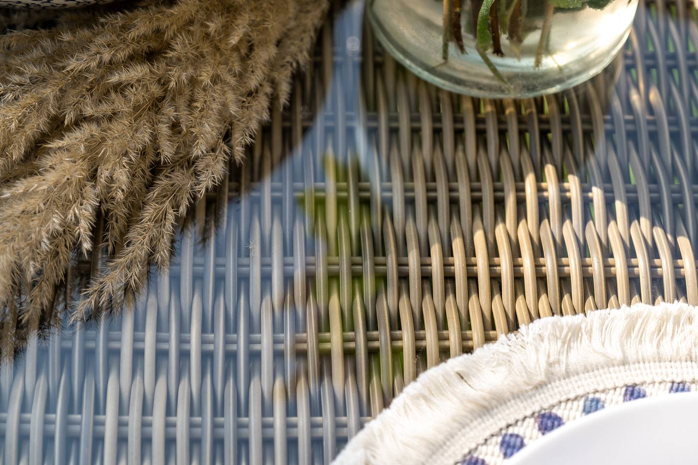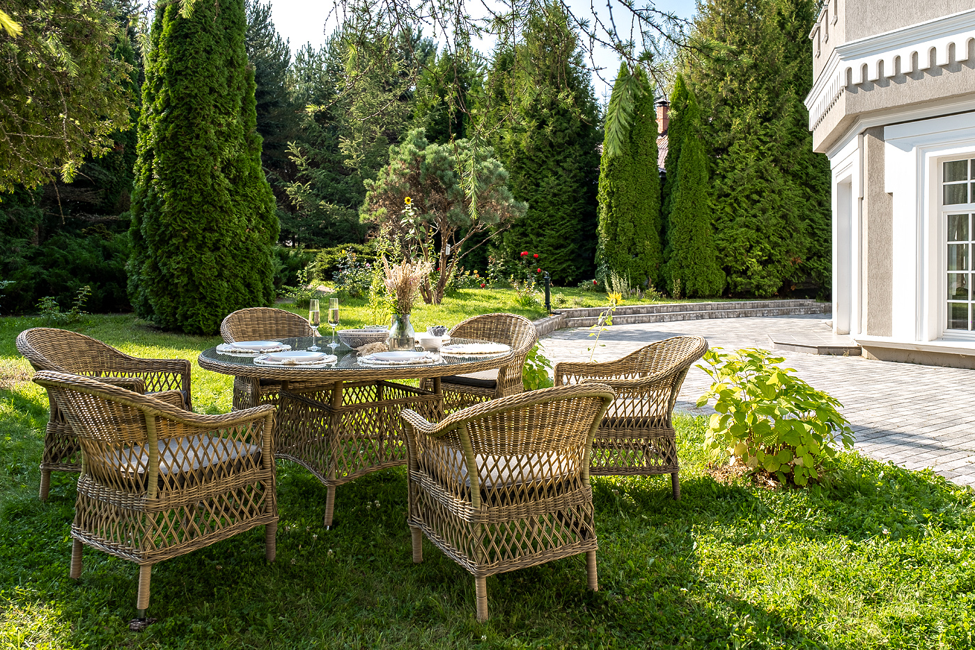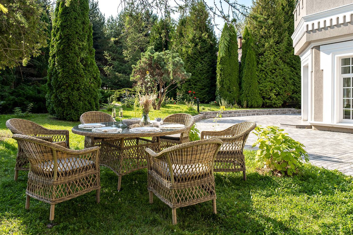 Вся мебель изготовлена из долговечного и легкого алюминия, обтянутого синтетическим ротангом. На столе для удобства эксплуатации предусмотрена столешница из ударопрочного закаленного стекла 5 мм. Стулья укомплектованы подушками на сидениях.