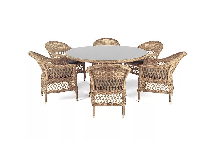 В комплект входит круглый обеденный стол «Эспрессо» (1500×1500×750 мм) с ударопрочной стеклянной столешницей и 6 кресел коллекции «Сицилия» (590×640×820 мм).