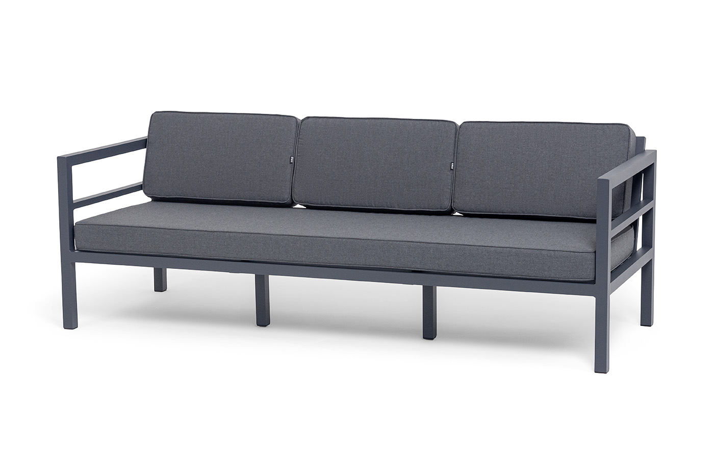 Трехместный диван «Эстелья». Каркас из алюминия, окрашенный в темно-серый (RAL7024) цвет, мягкие подушки на сидениях и спинках со съёмными чехлами цвета серый гранит.
