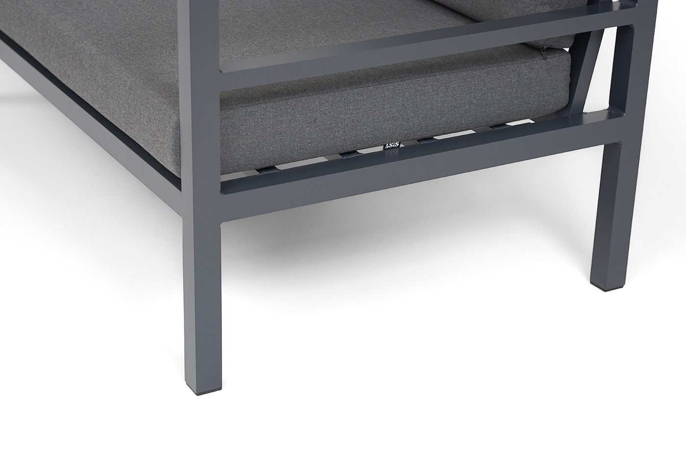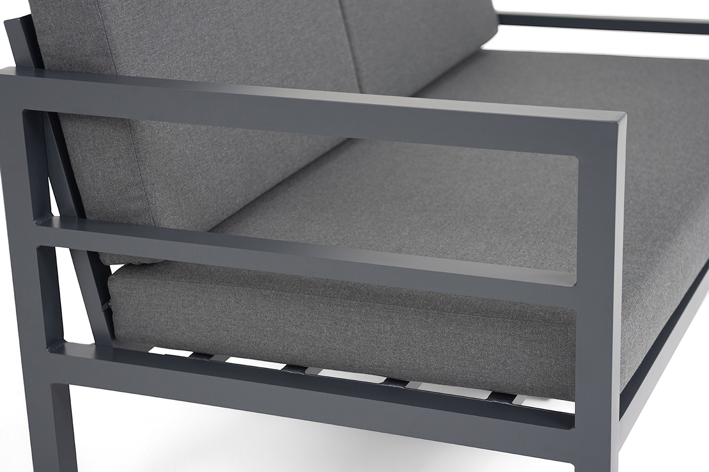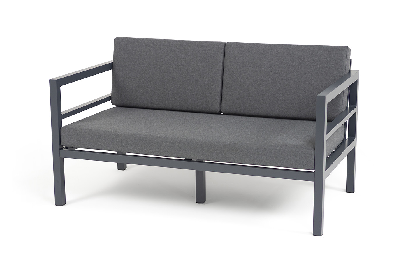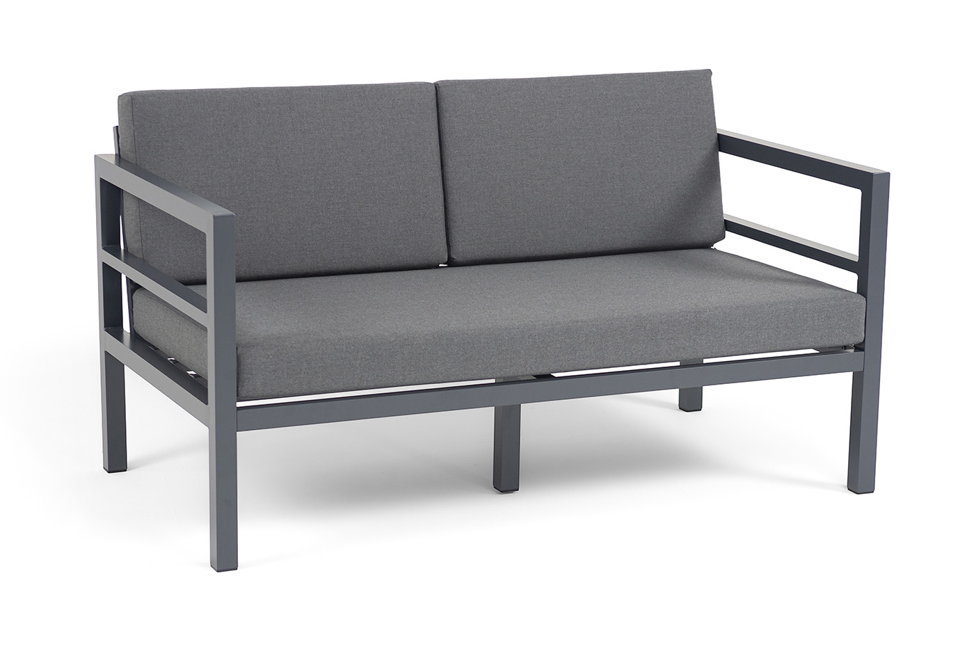 Стильный металлический диван разборный «Эстелья» рассчитан на две персоны. Каркас изготовлен из легкого, но прочного алюминия, окрашенного в темно-серый цвет порошковой краской. В копмлекте предусмотрены подушки темно-серого цвета со съемными чехлами с влагоотталкивающей пропиткой.