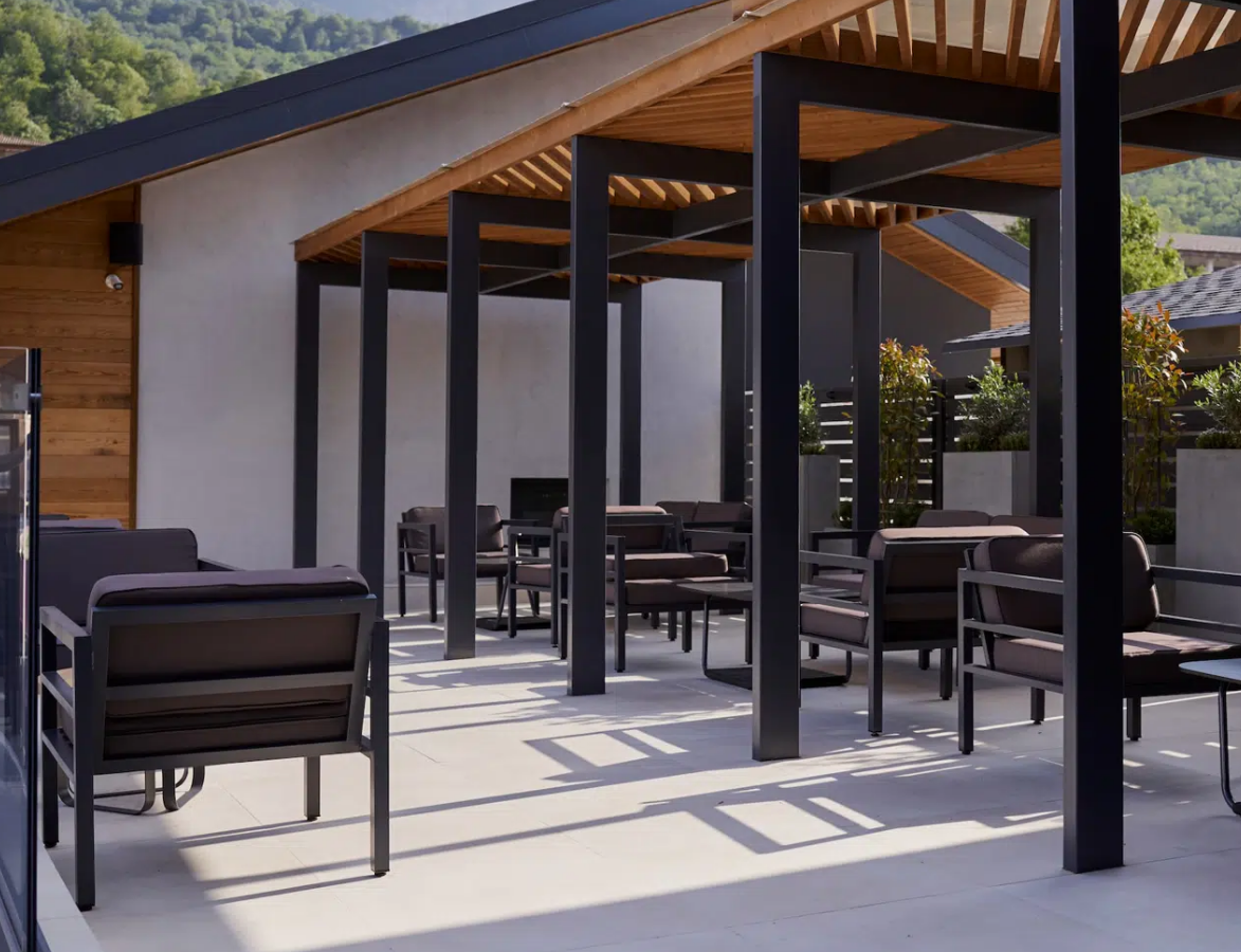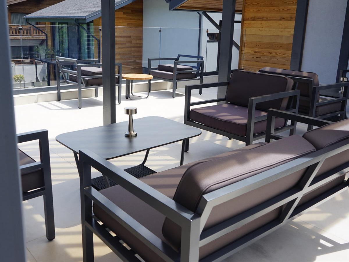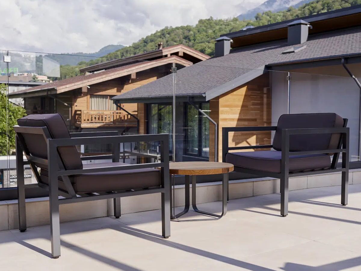 Металлическое садовое кресло в минималистическом стиле «Эстелья». Каркас выполнен из легкого прочного алюминия, который окрашен порошковой высокостойкой краской темно-серого цвета.