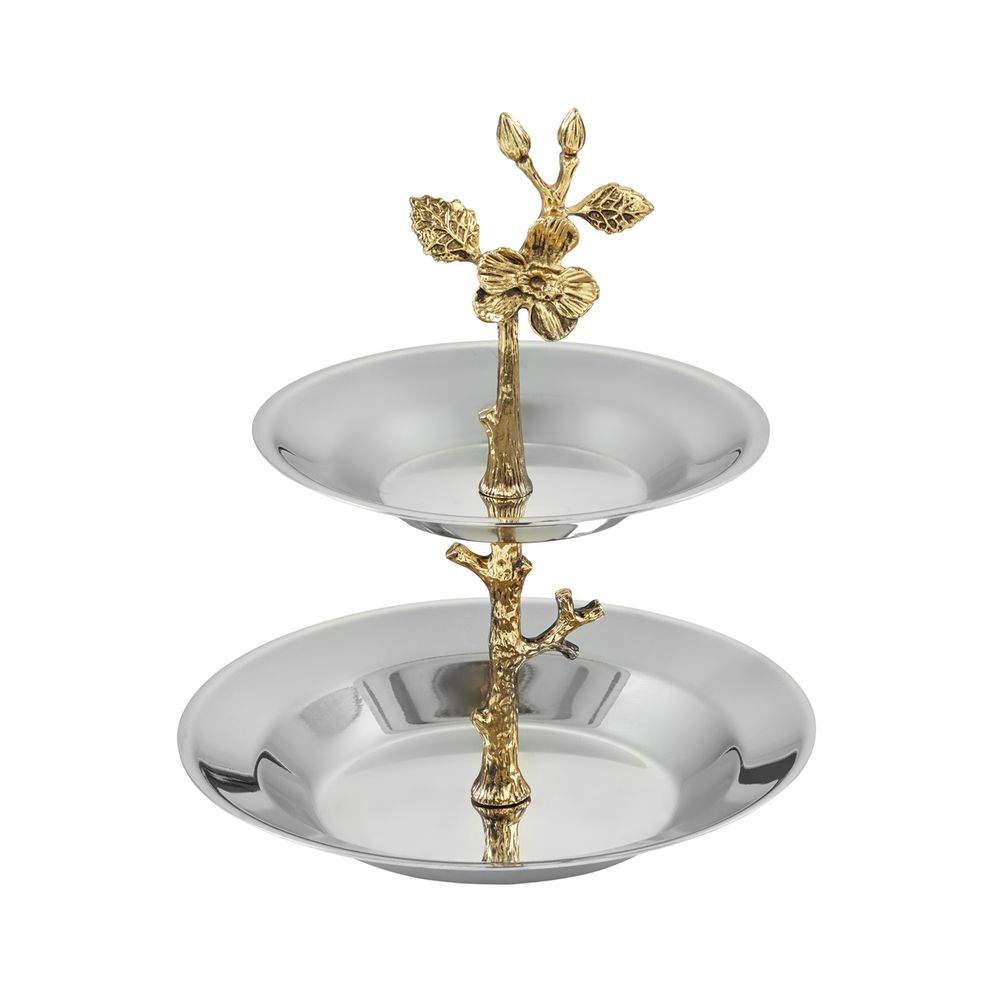 Этажерка GIPFEL FIORITA 41159 двухъярусная. Нижний ярус диаметром 18 см, верхний ярус диаметром 14,5 см. Размер этажерки 18х21,5см. Каркас этажерки выполнен в виде ствола дерева и смотрится очень эффектно на сервированном столе. Ручка в виде золотой цветочной ветви удобна для переноски и гармонично сочетается с двумя серебристыми тарелочками из нержавеющей стали.