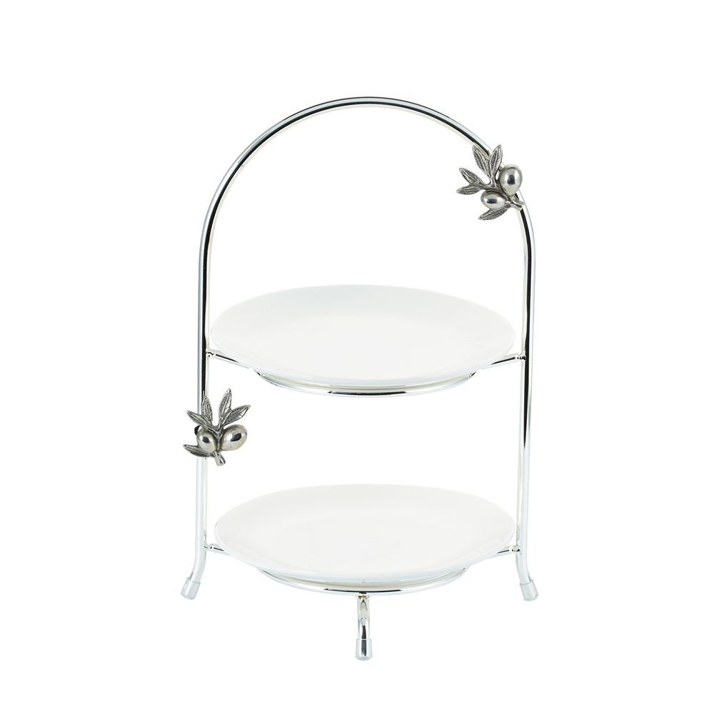 Этажерка GIPFEL OLIVETA 41157. Двухъярусная этажерка с фарфоровыми тарелками диаметром 20 см. Высота этажерки 35 см. Каркас с декоративными элементами в виде оливковых ветвей сделан из цинкового сплава.