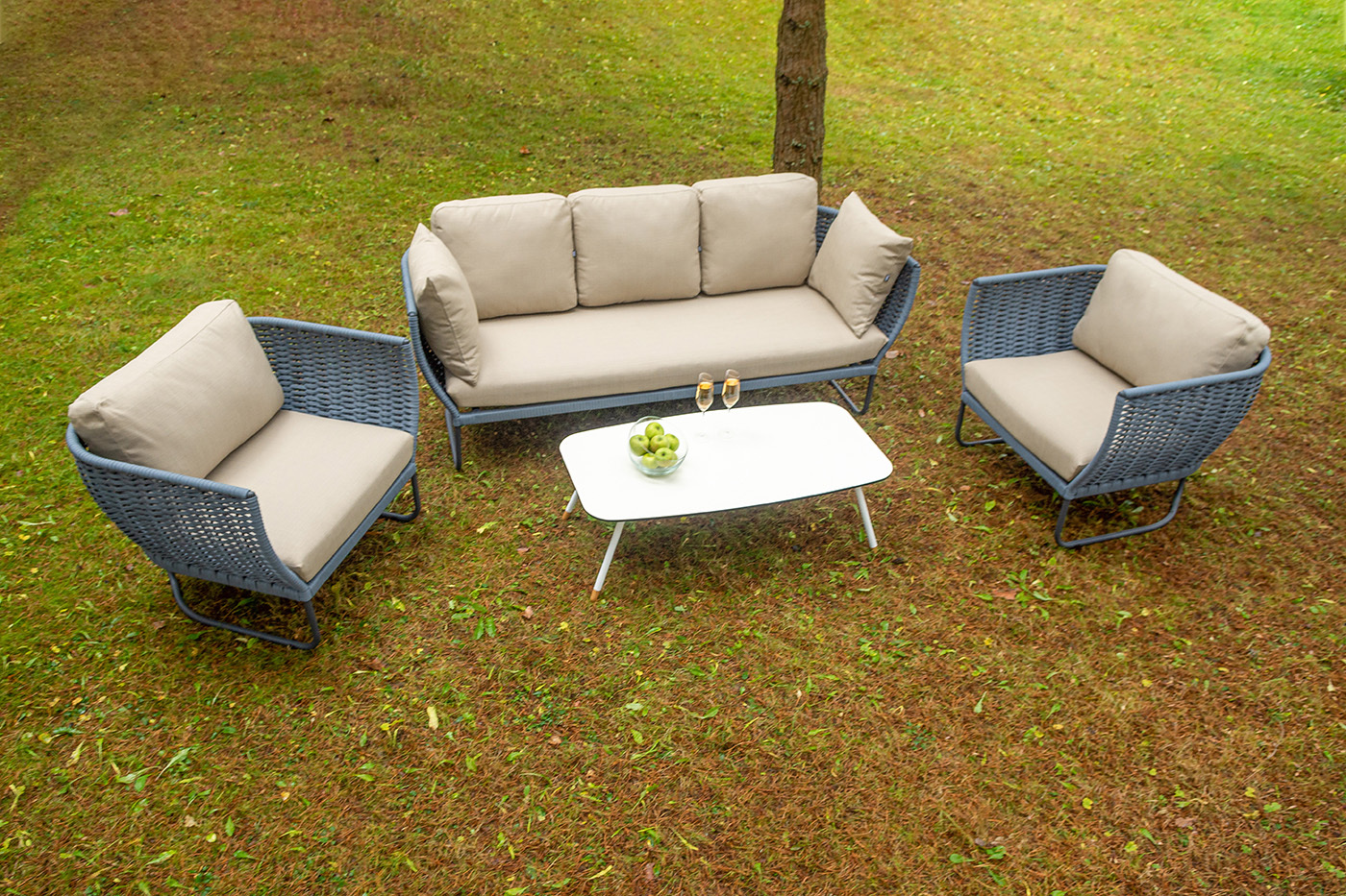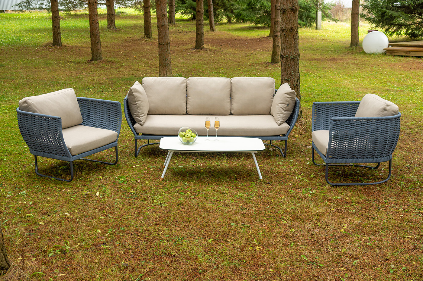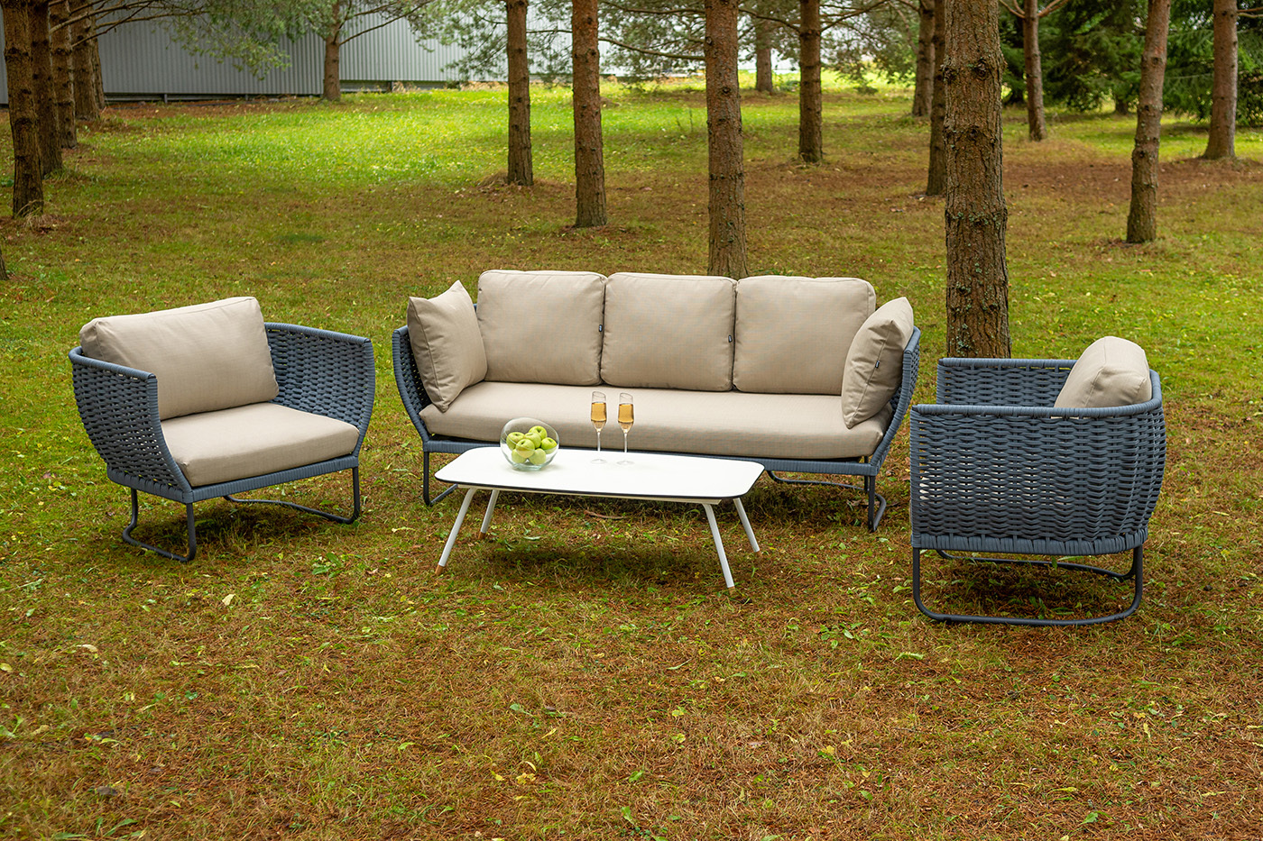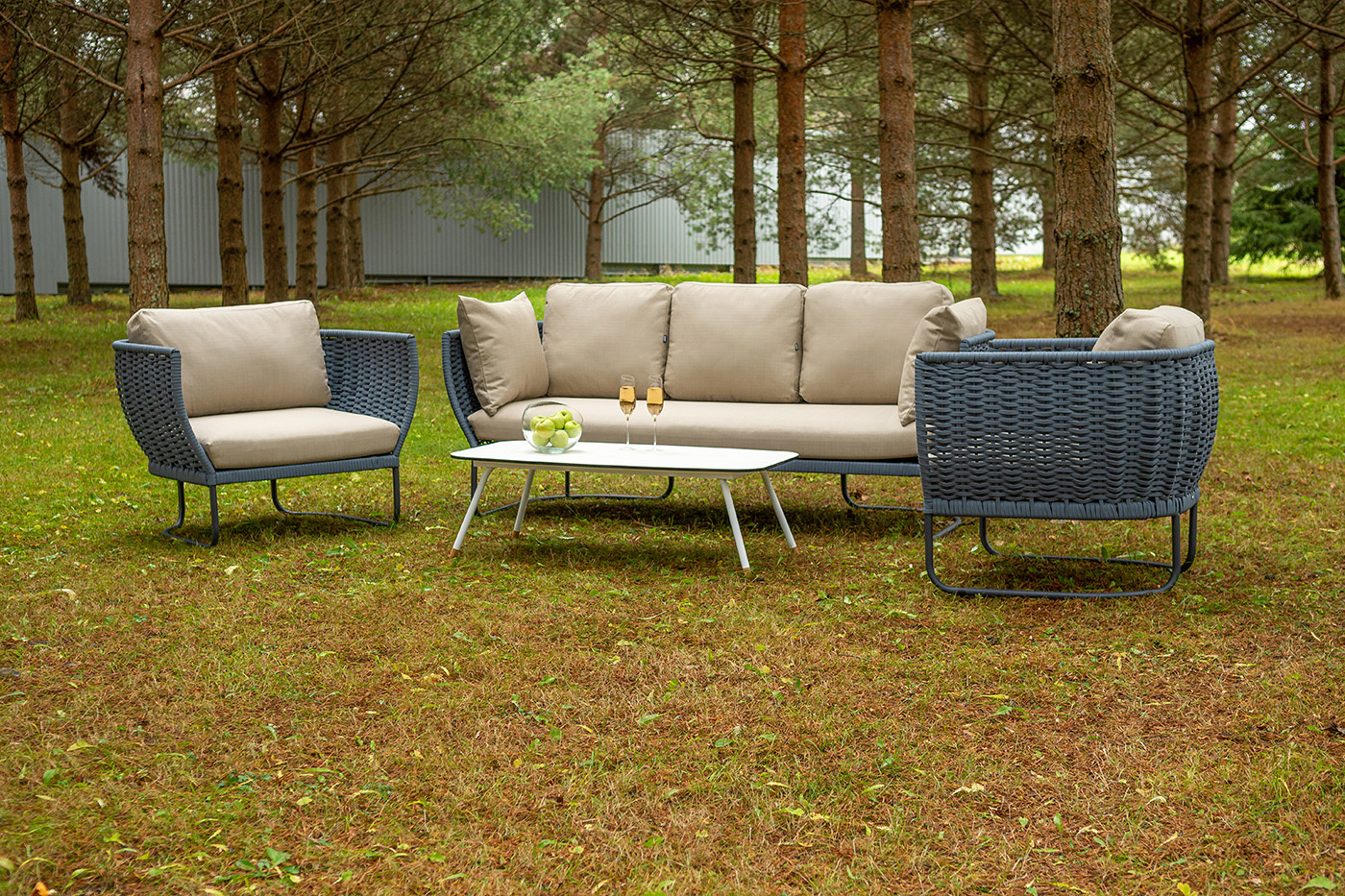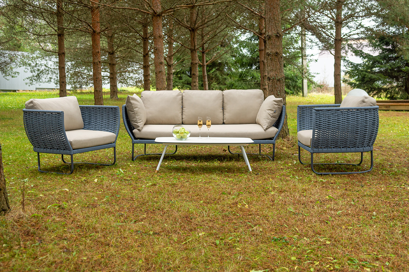 Боковины дивана и кресел вручную оплетены синими синтетическими лентами из высокопрочных полиэфирных волокон. Плетение придает мебели выразительный облик и удачно дополняет цвет каркаса.