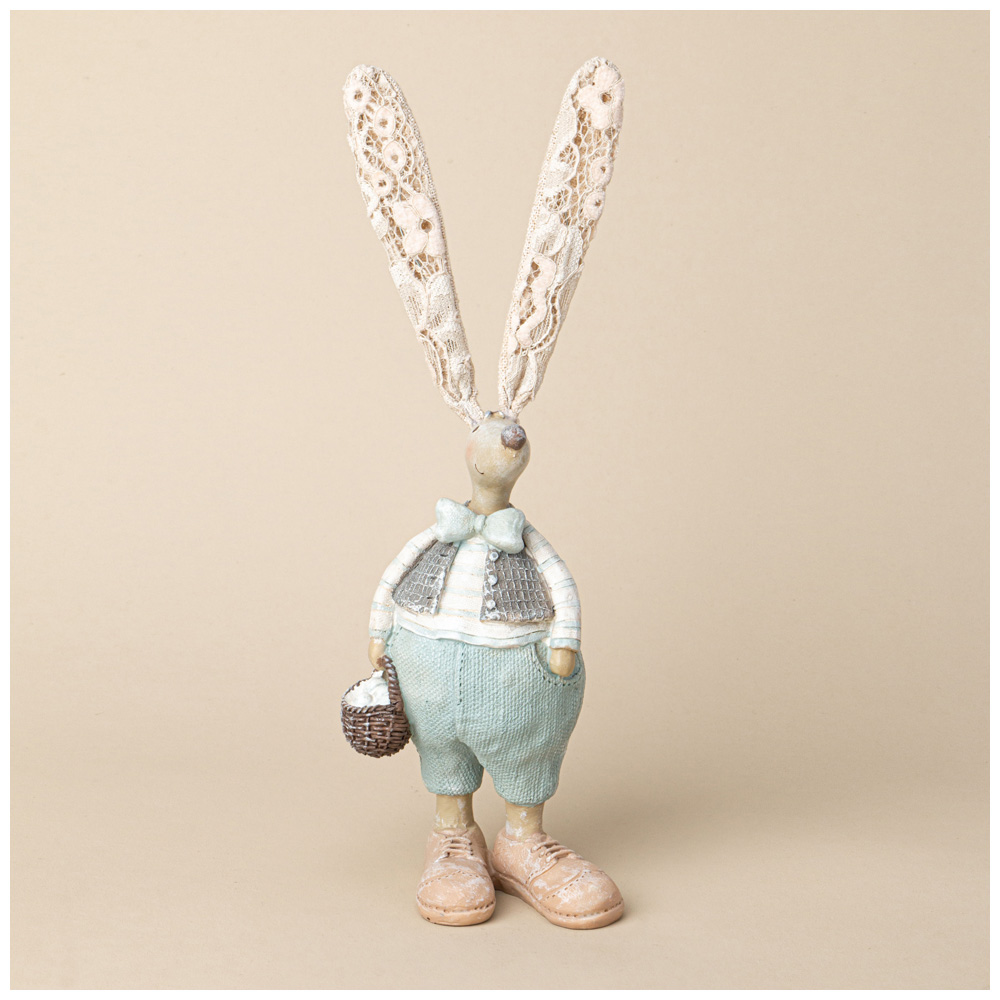 Его длинные, изящные уши, обрамленные кружевом, добавляют особого очарования и делают фигурку ещё более уникальной. В одной лапке заяц уверенно держит маленькую корзинку, которая словно приглашает на сказочное приключение. Этот забавный персонаж станет прекрасным акцентом в любом интерьере, вызывая улыбки и создавая атмосферу праздника.