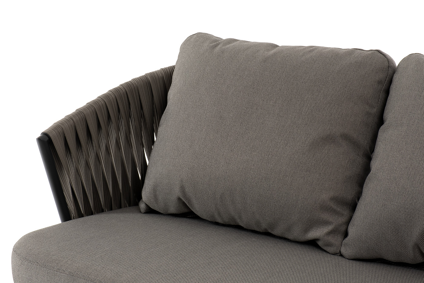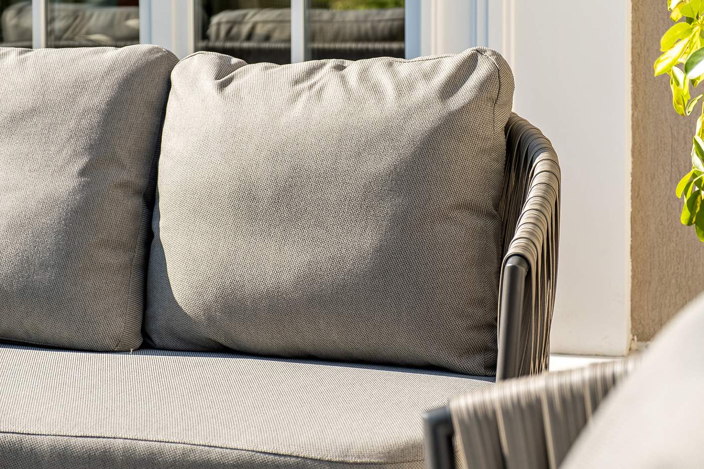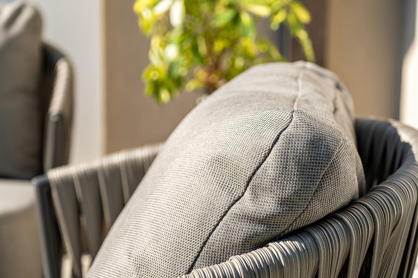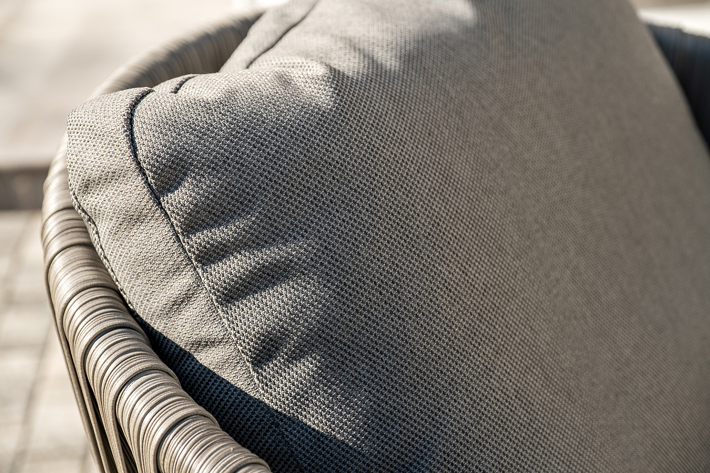 Плетеная мебель дополнена удобными подушками в графитовых чехлах. При их изготовлении используют полиэстер, плотность – 300гр/м2. Он обрабатывается влагоотталкивающей пропиткой для повышения защитных свойств материала.