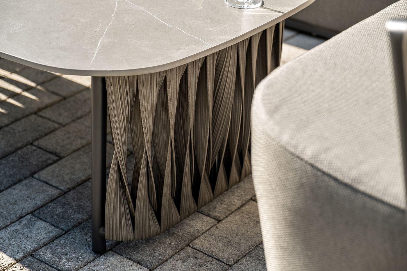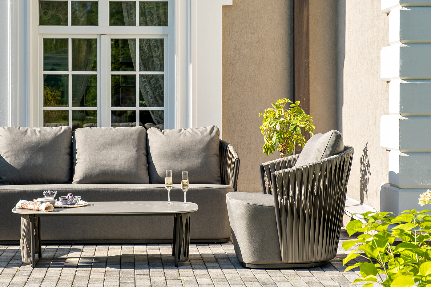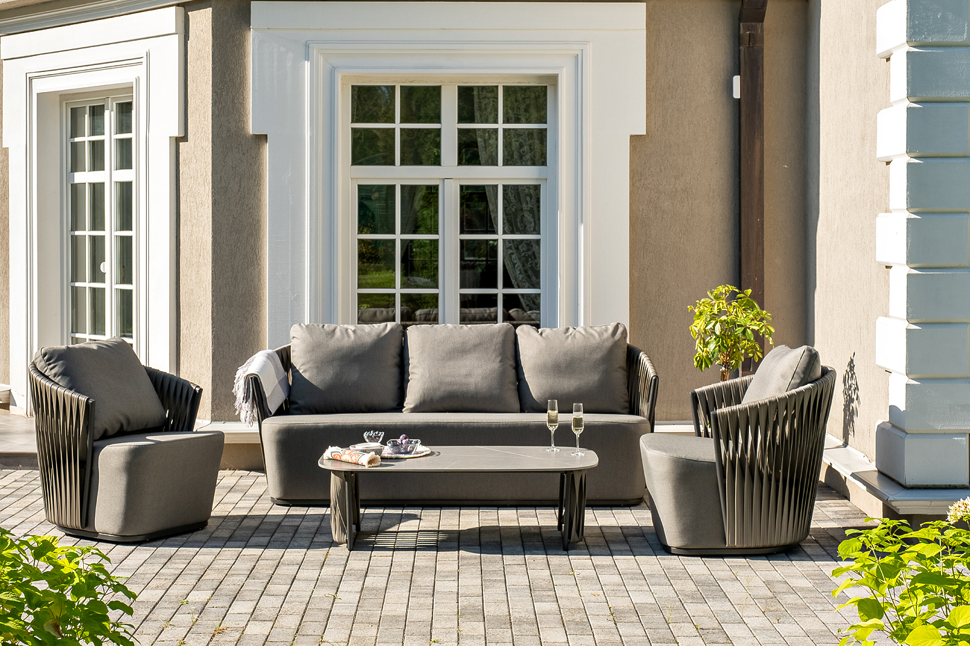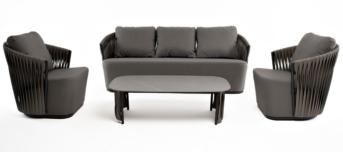Из алюминия сделан устойчивый каркас мебели. Ее поверхность дополнена искусственным ротангом, из которого сделано ручное плетение - 50×3 мм, цвет графит.