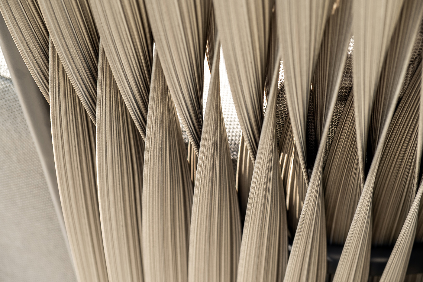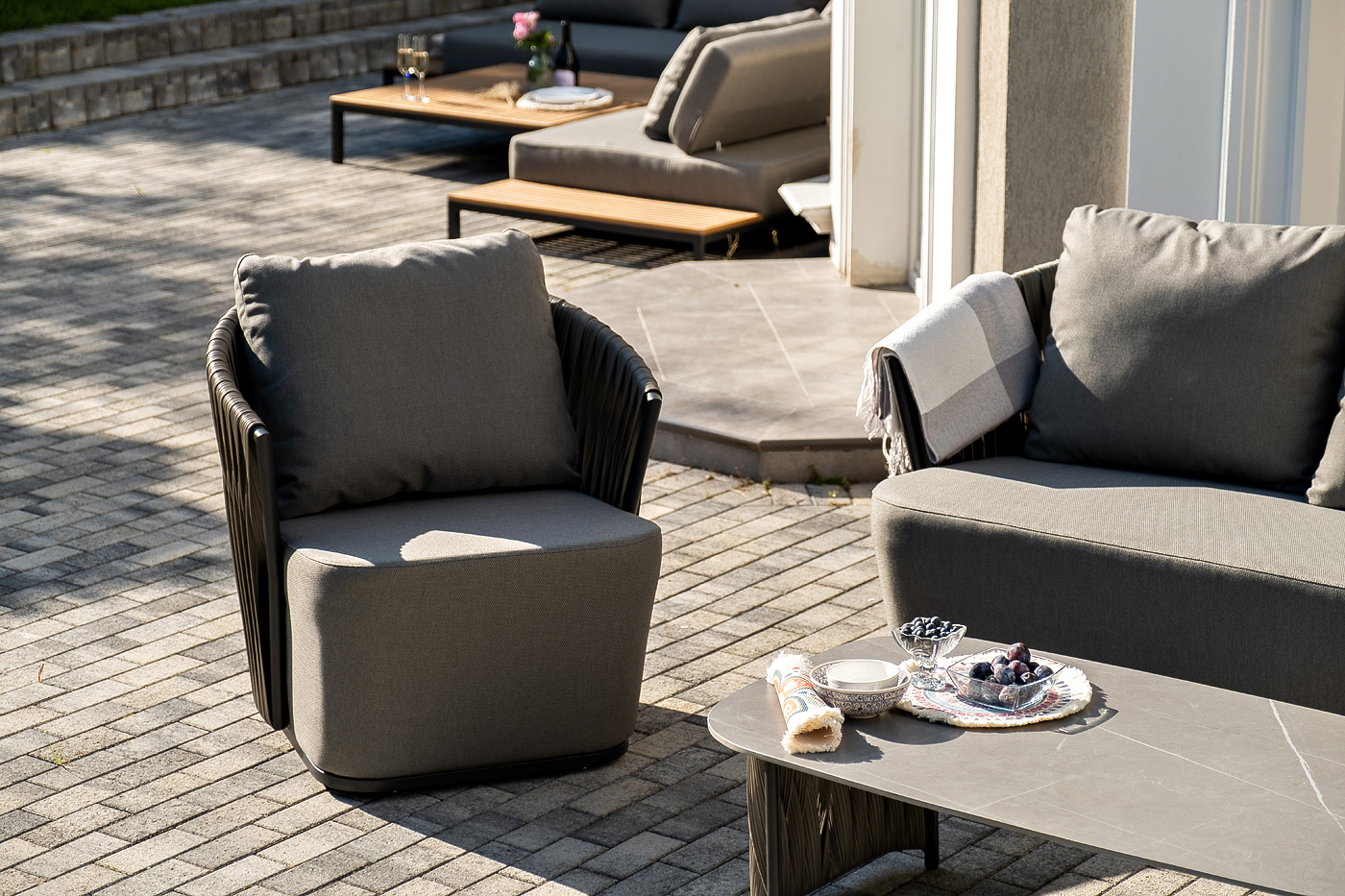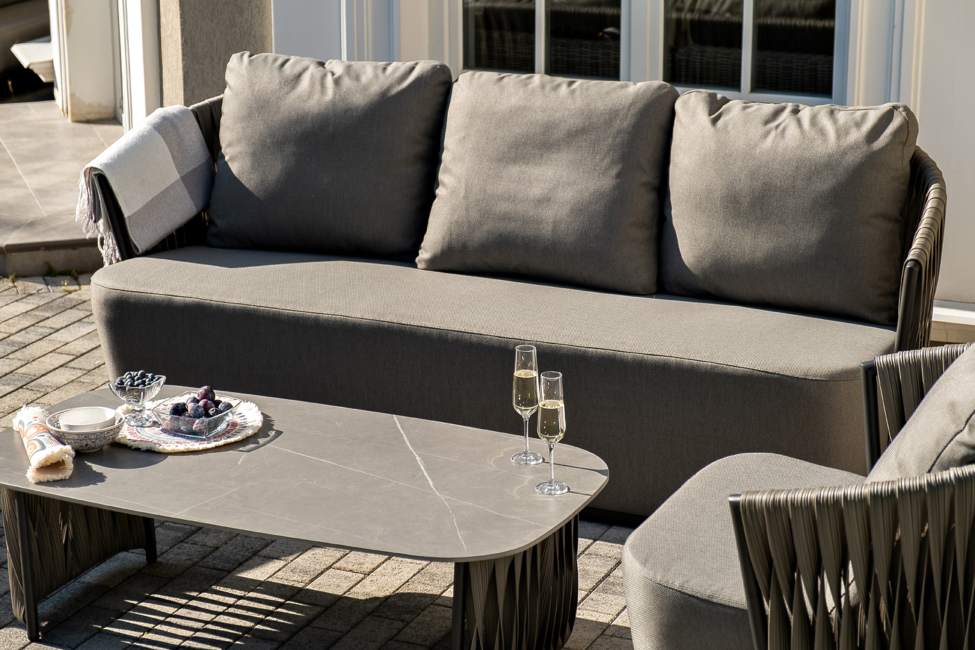 Из алюминия сделан устойчивый каркас мебели. Ее поверхность дополнена искусственным ротангом, из которого сделано ручное плетение - 50×3 мм, цвет графит.