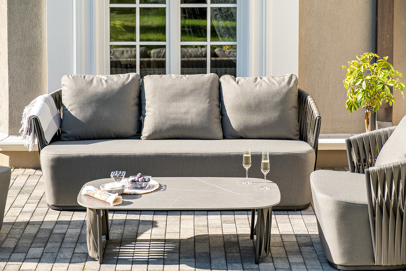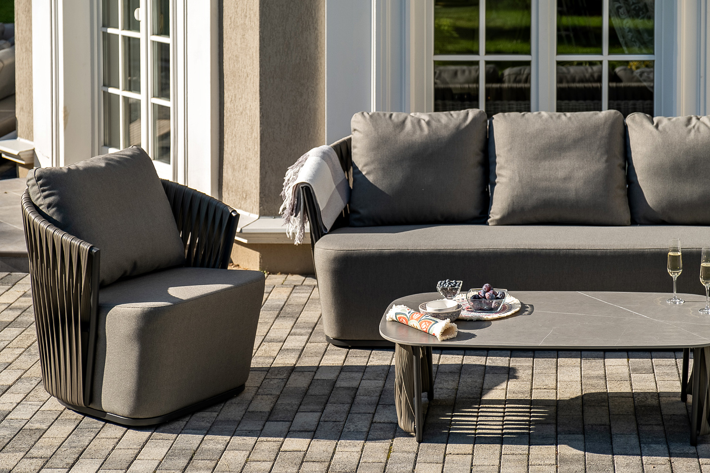 Журнальный столик выполнен из алюминия, окрашенного износостойкой краской графитового цвета. Столешница - овальная, выполнена из искусственного камня графитового цвета.