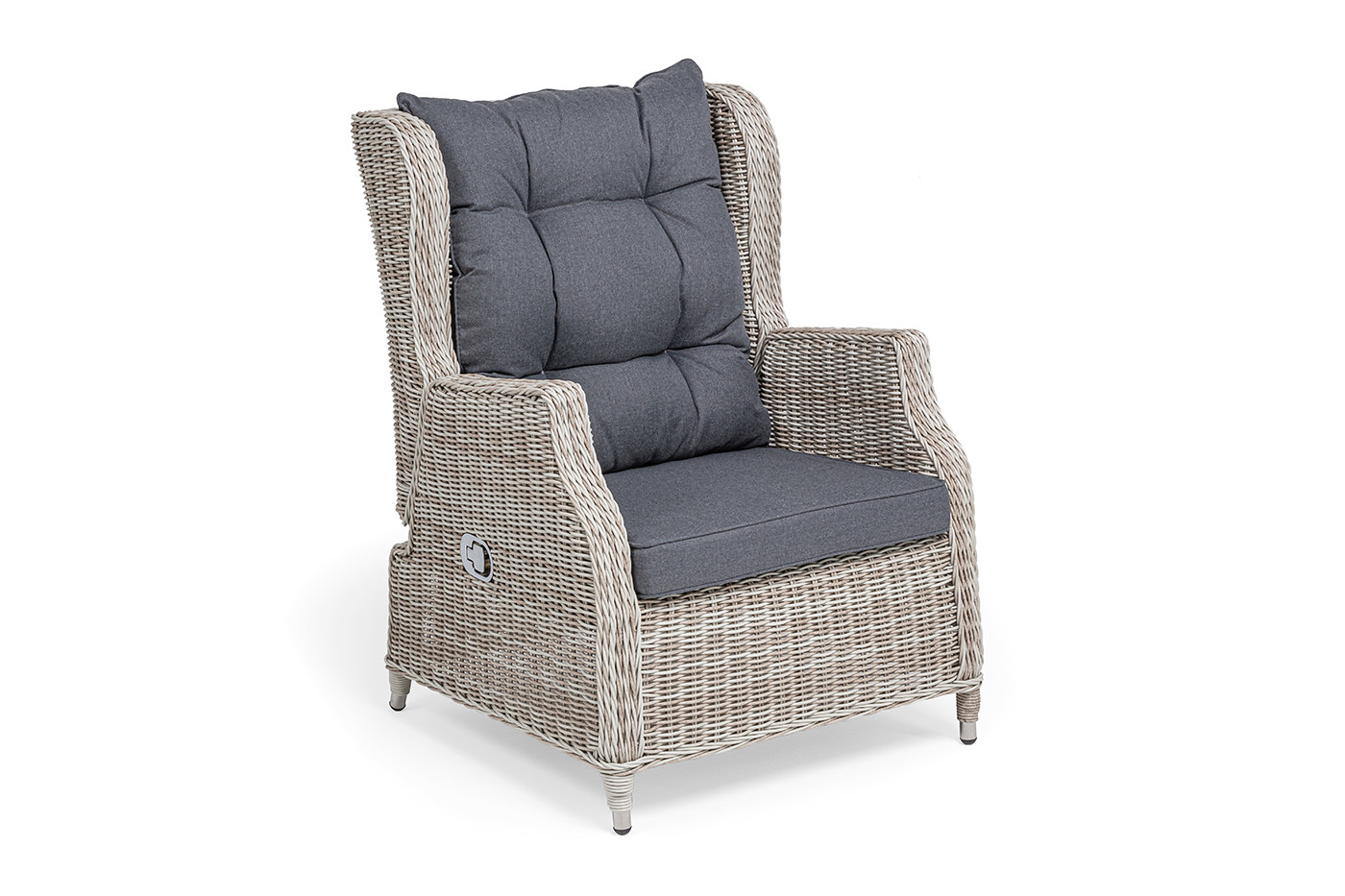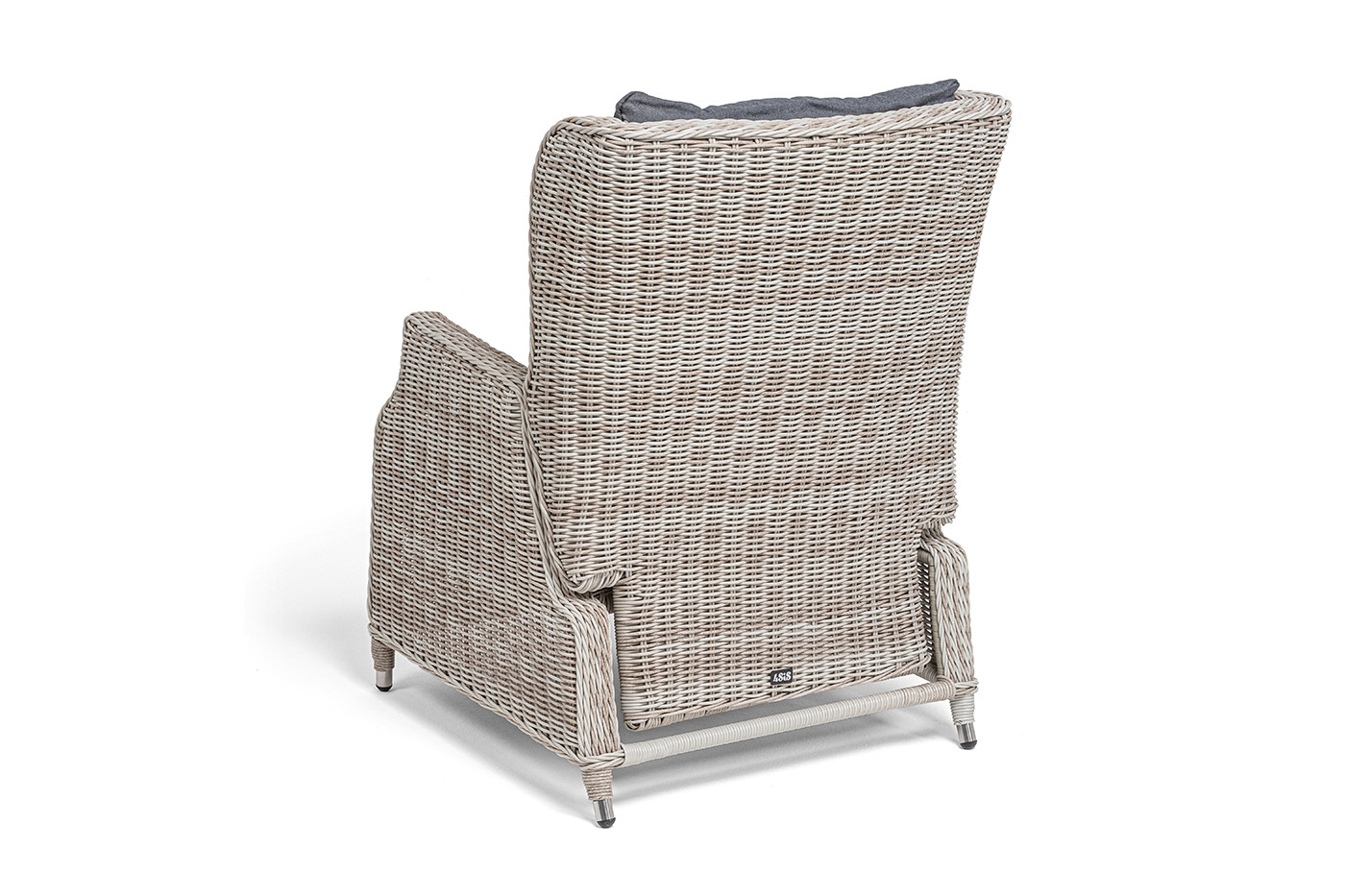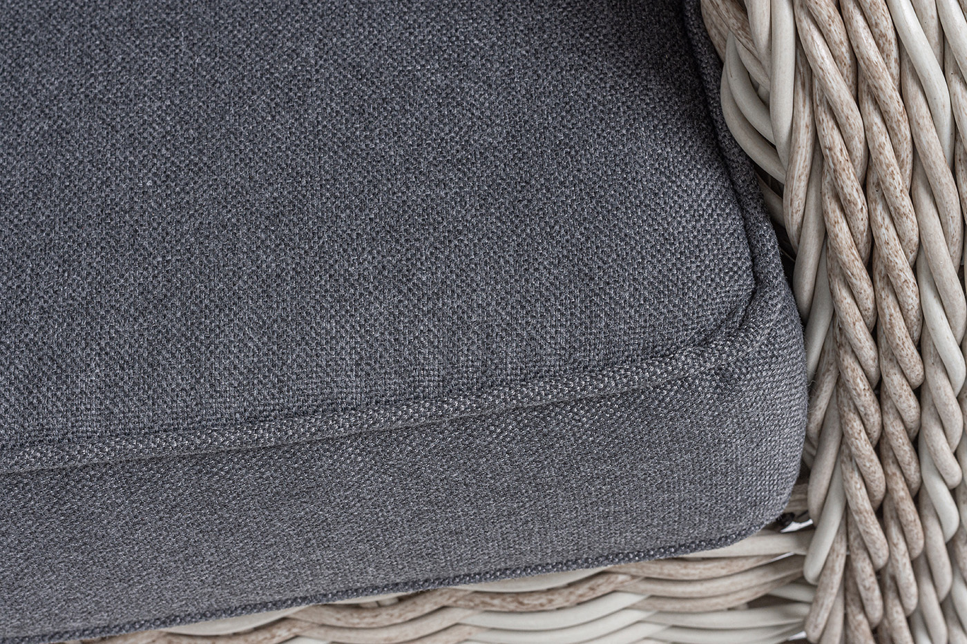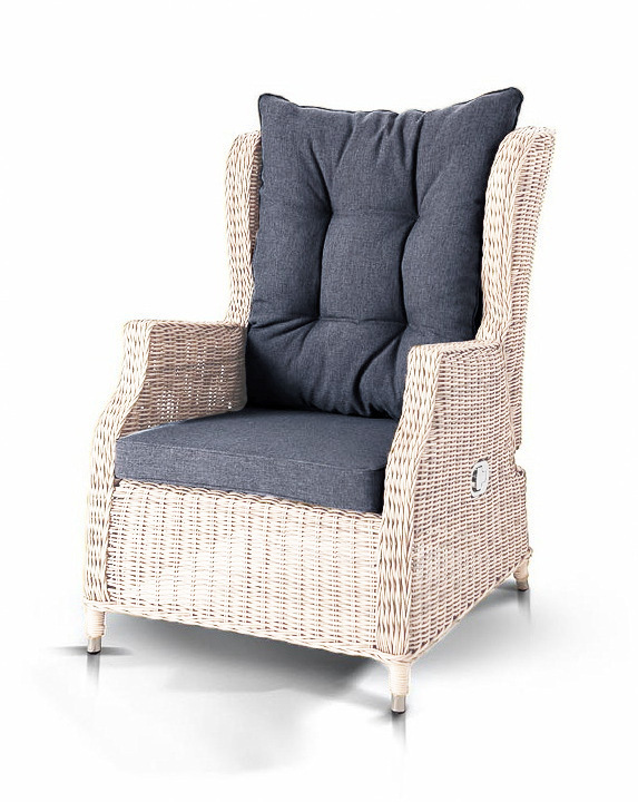 Садовое кресло дополнено практичными подушками для комфортного размещения. Они выполнены в сером цвете из полиэстера, плотность которого достигает 300гр/м2. Материал имеет влагоотталкивающую пропитку.