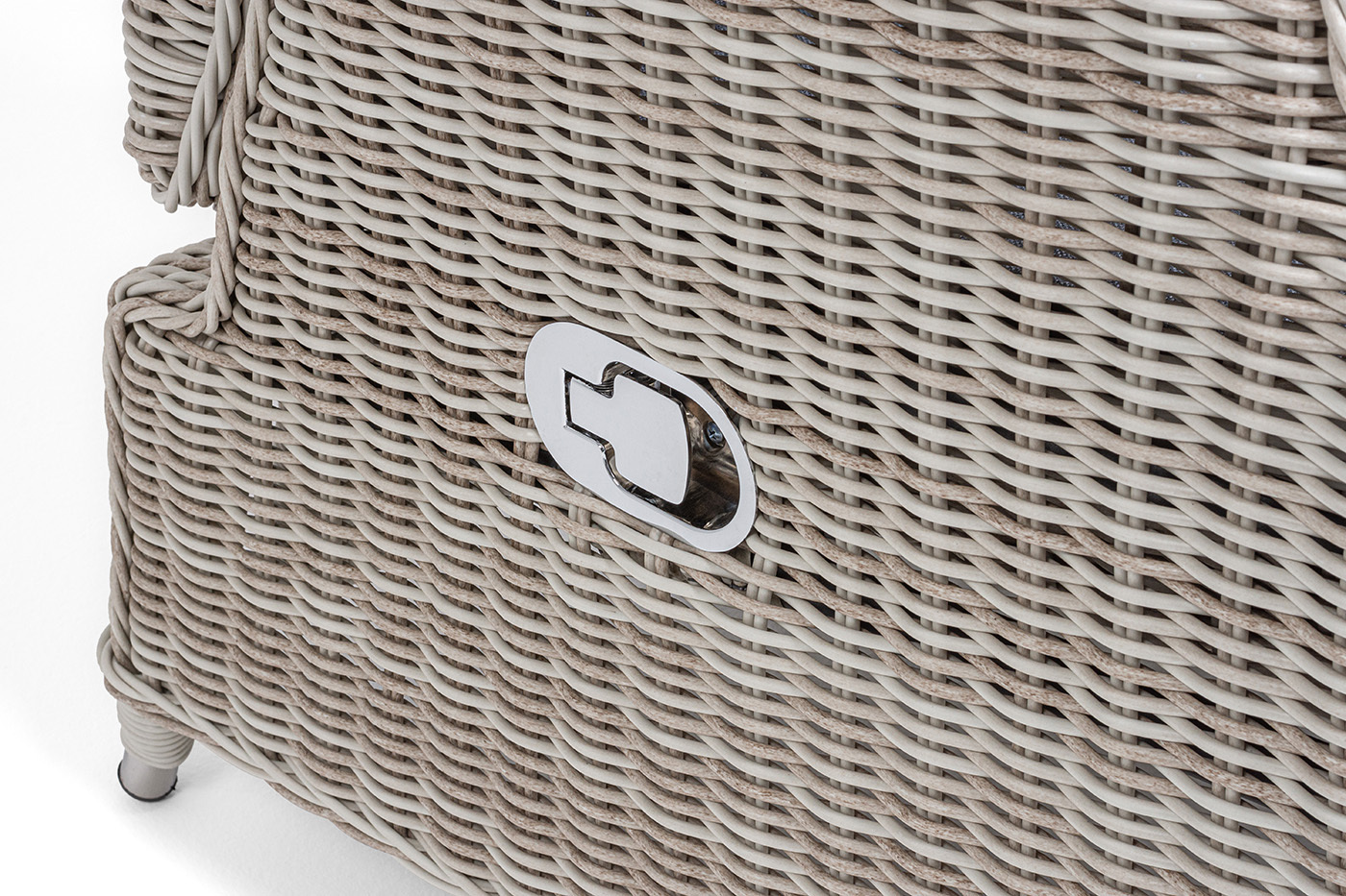 В основе мебели находится алюминиевый каркас высокой прочности, который оплетен круглым искусственным ротангом. Представлена в натуральном бежевом оттенке.