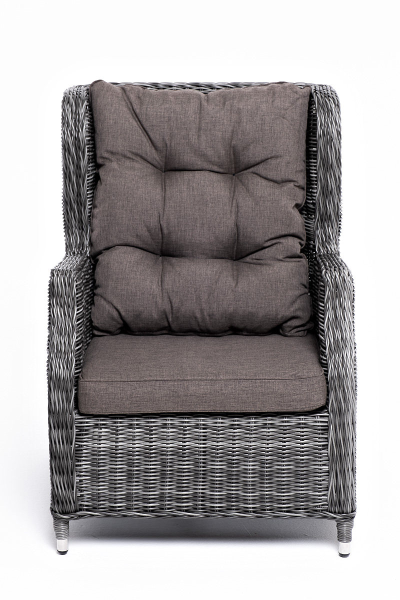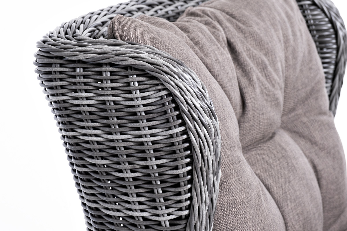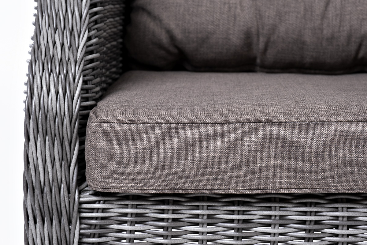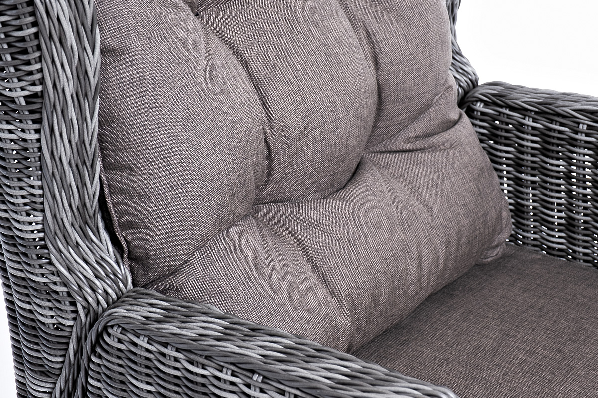 Садовое кресло дополнено практичными подушками для комфортного размещения. Они выполнены в сером цвете из полиэстера, плотность которого - 300гр/м2. Материал имеет влагоотталкивающую пропитку.