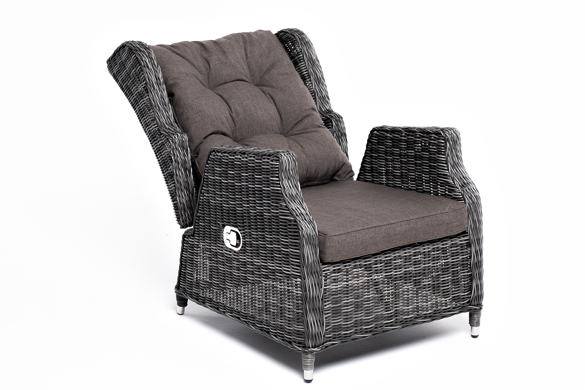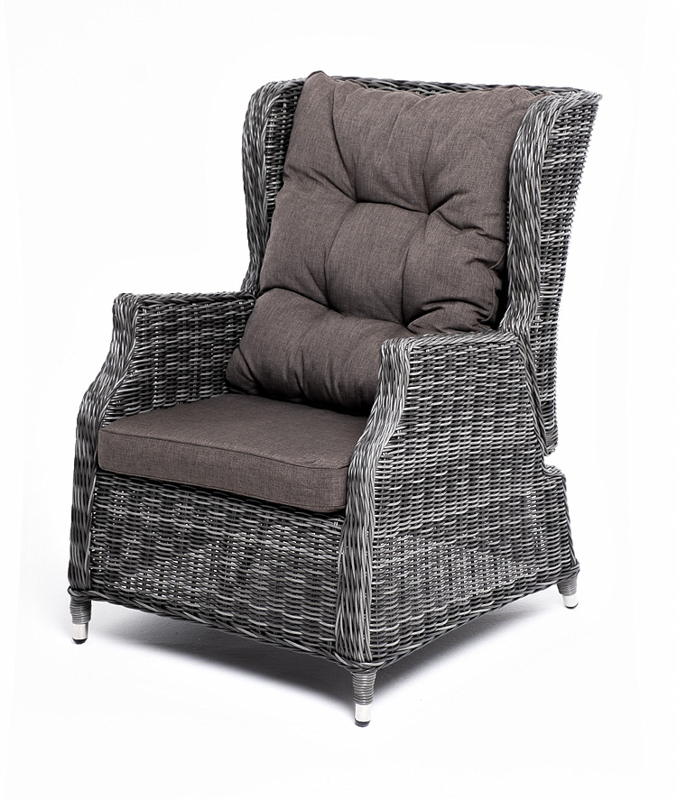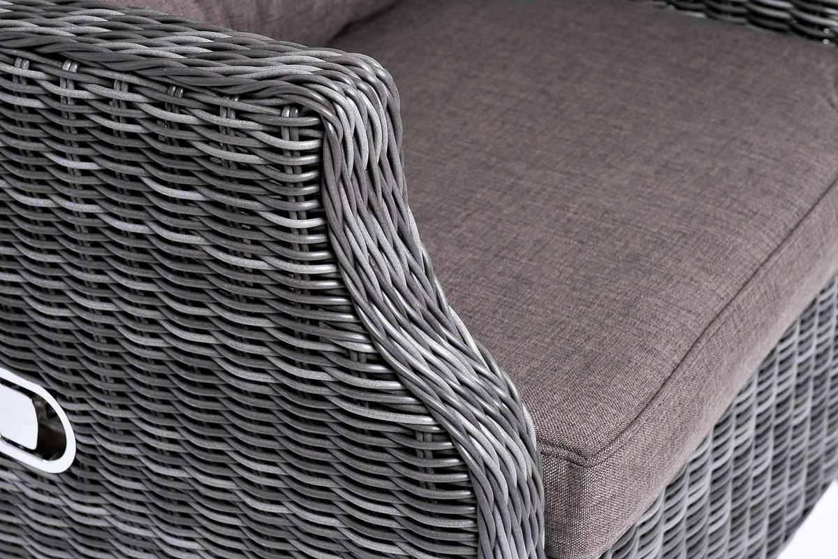 В основе мебели находится алюминиевый каркас высокой прочности, оплетенный круглым искусственным ротангом. Представлена в графитовом оттенке.