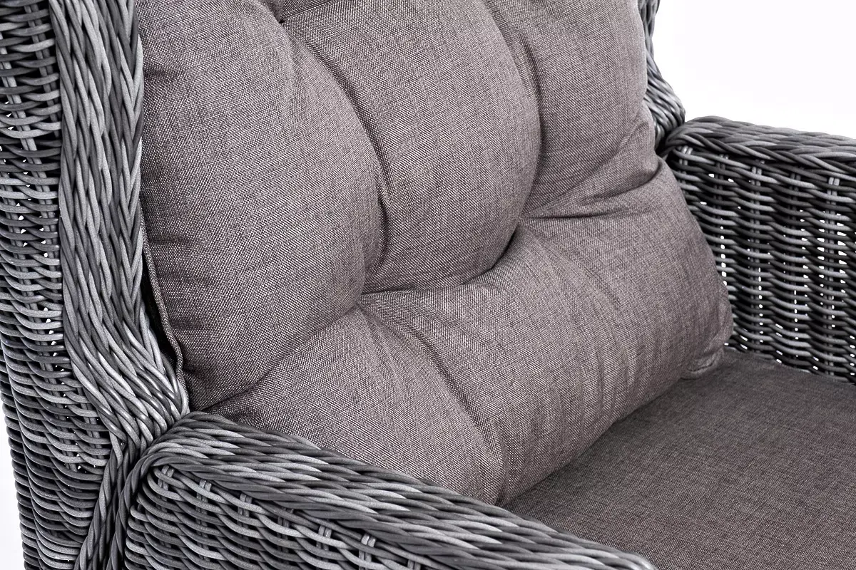 Садовое кресло дополнено практичными подушками для комфортного размещения. Они выполнены в серо-коричневом цвете из полиэстера, плотность которого - 230гр/м2. Материал имеет влагоотталкивающую пропитку.