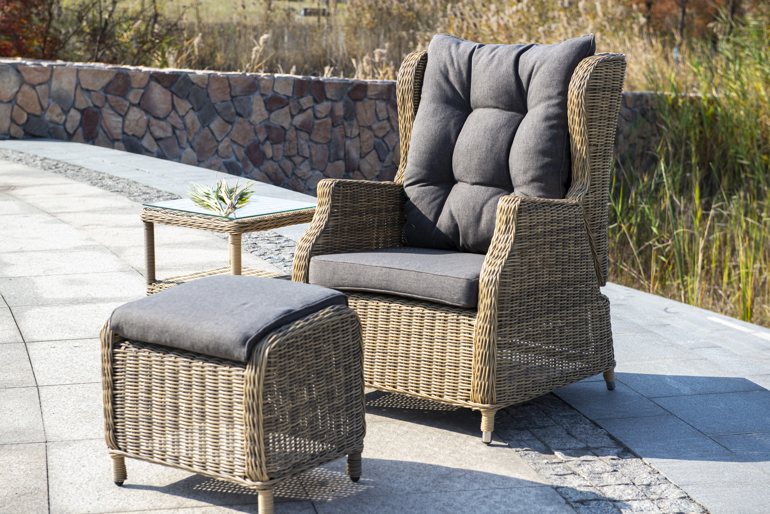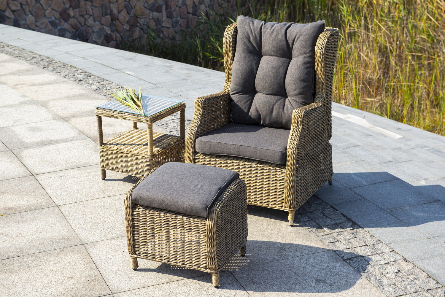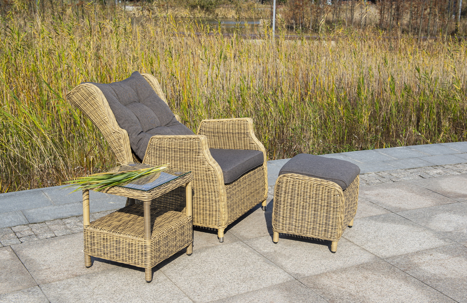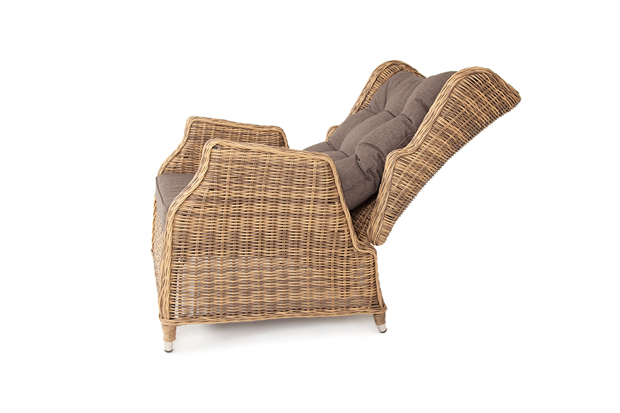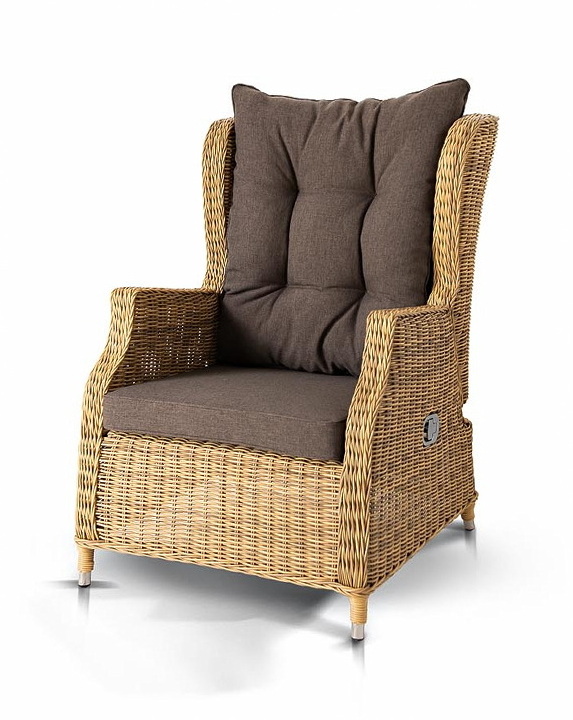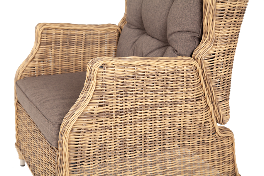 В основе мебели находится алюминиевый каркас высокой прочности, который оплетен круглым искусственным ротангом. Представлена в натуральном соломенном оттенке.