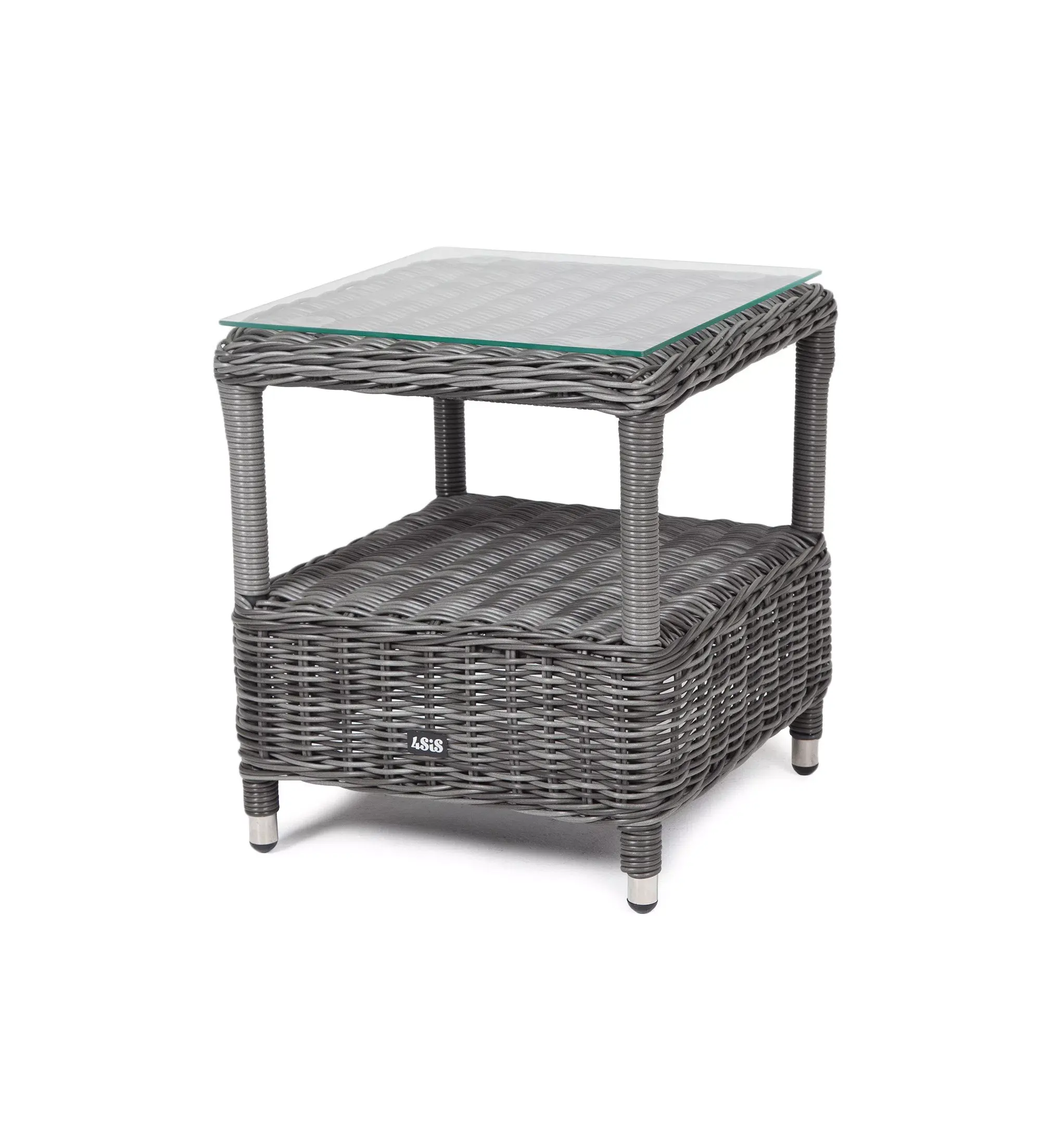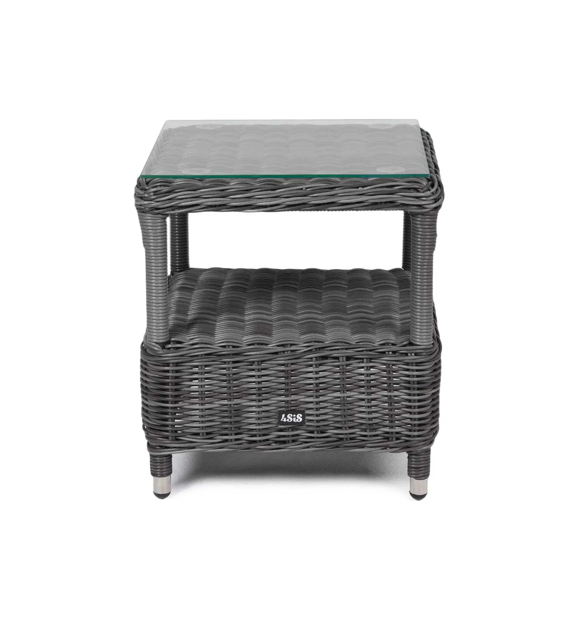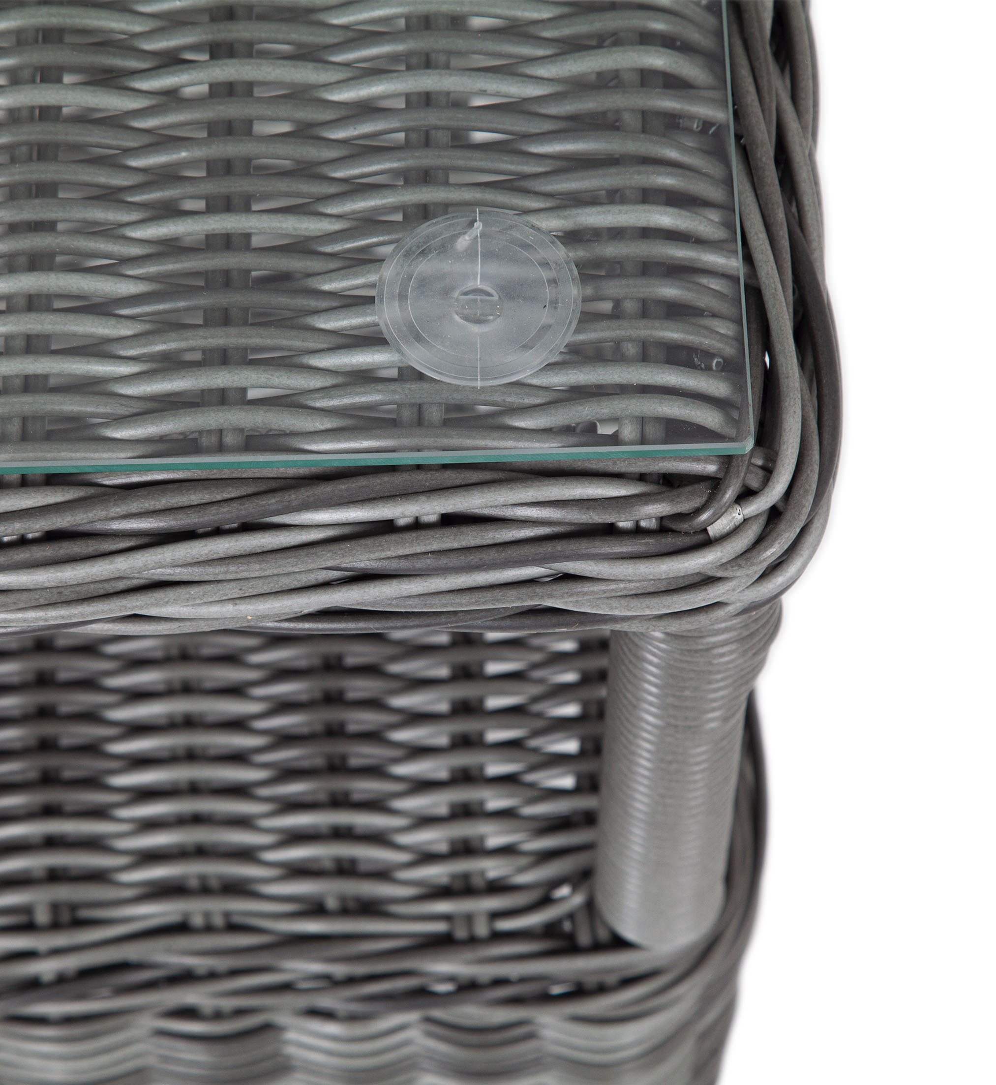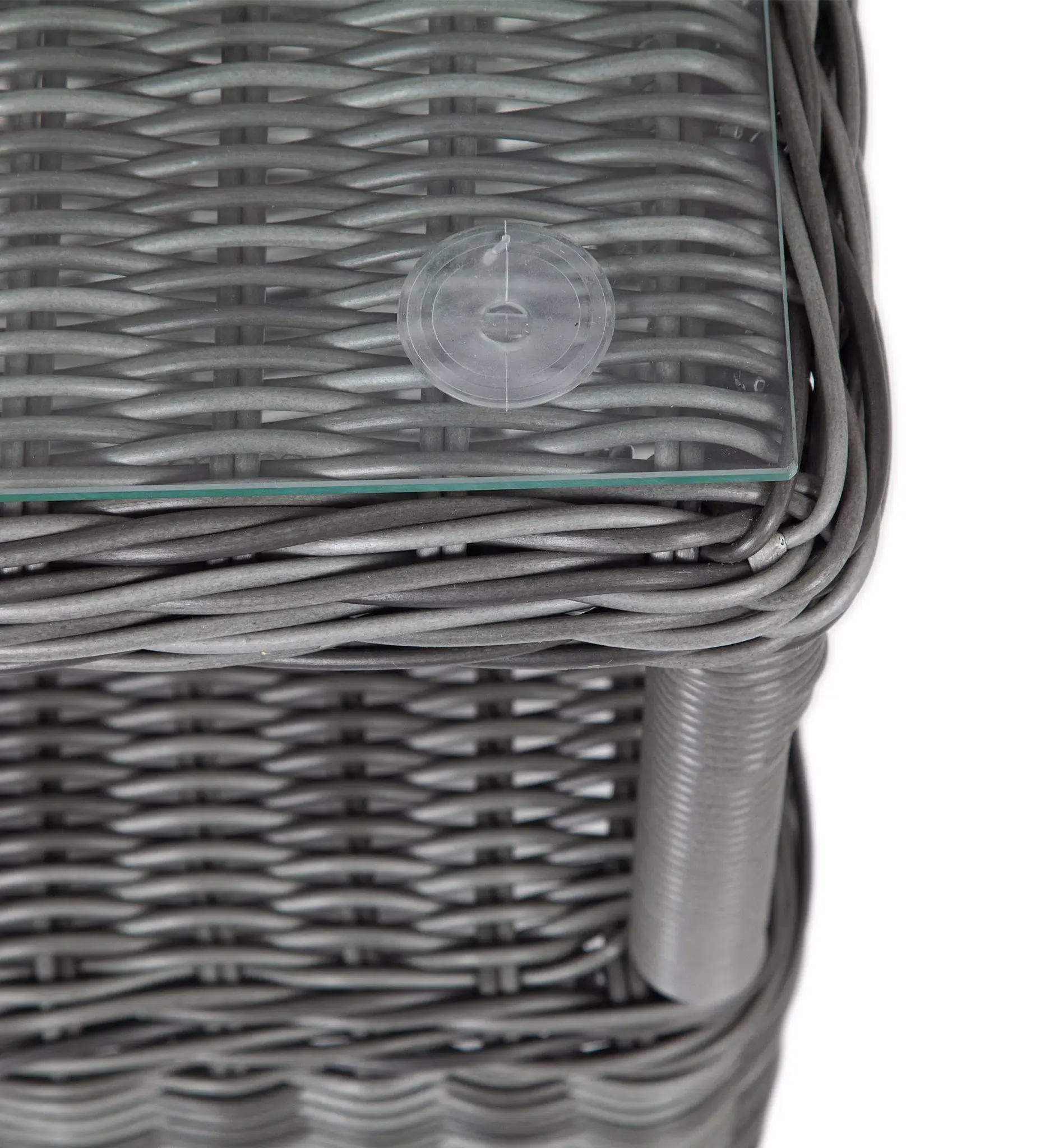 Модель состоит из каркаса, обвитого вручную ротангом графитового цвета. Данный образец обладает ударопрочной стеклянной 5 мм столешницей, конструкцией предусмотрена полочка для принадлежностей.