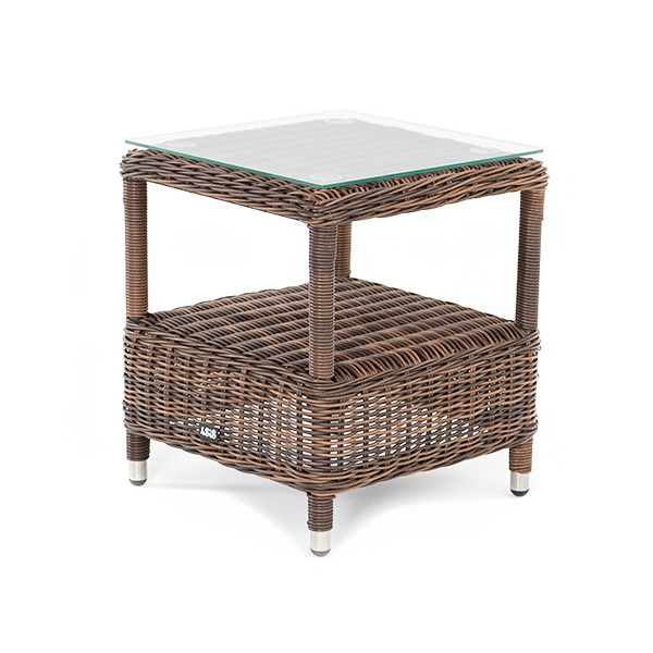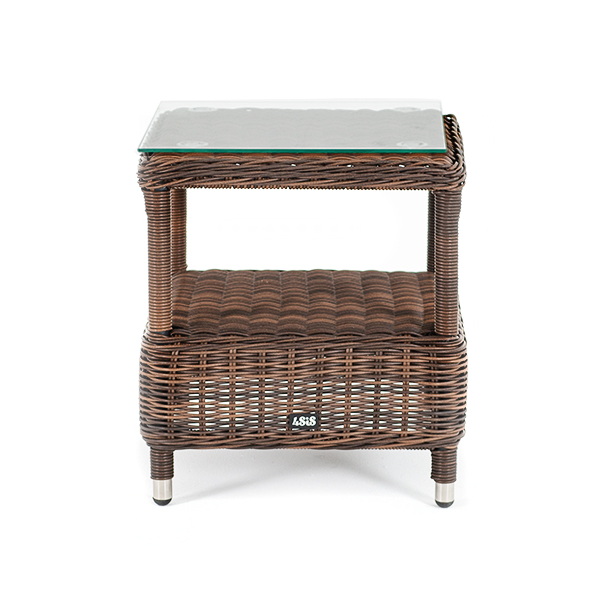 Модель состоит из каркаса, обвитого вручную ротангом коричневого цвета. Данный образец обладает ударопрочной стеклянной 5 мм столешницей, конструкцией предусмотрена полочка для принадлежностей.
