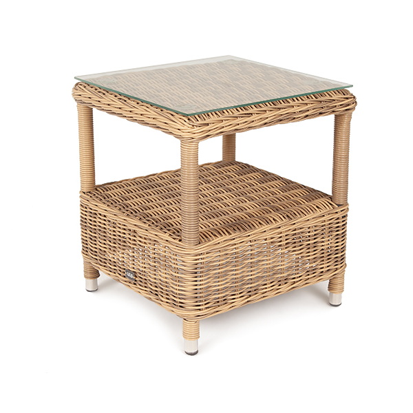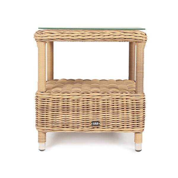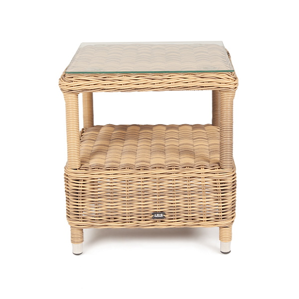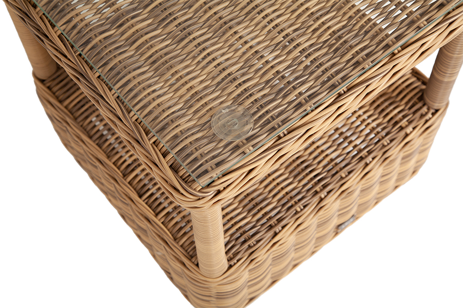 Размер модели – 450×450×520 мм. Ее основу составляет каркас из высококачественного алюминия. Ручное плетение выполнено из круглого искусственного ротанга. Столик имеет дополниельную полку.