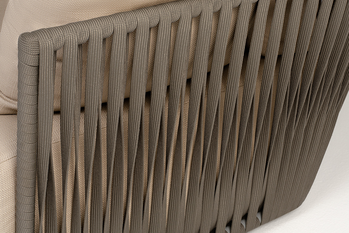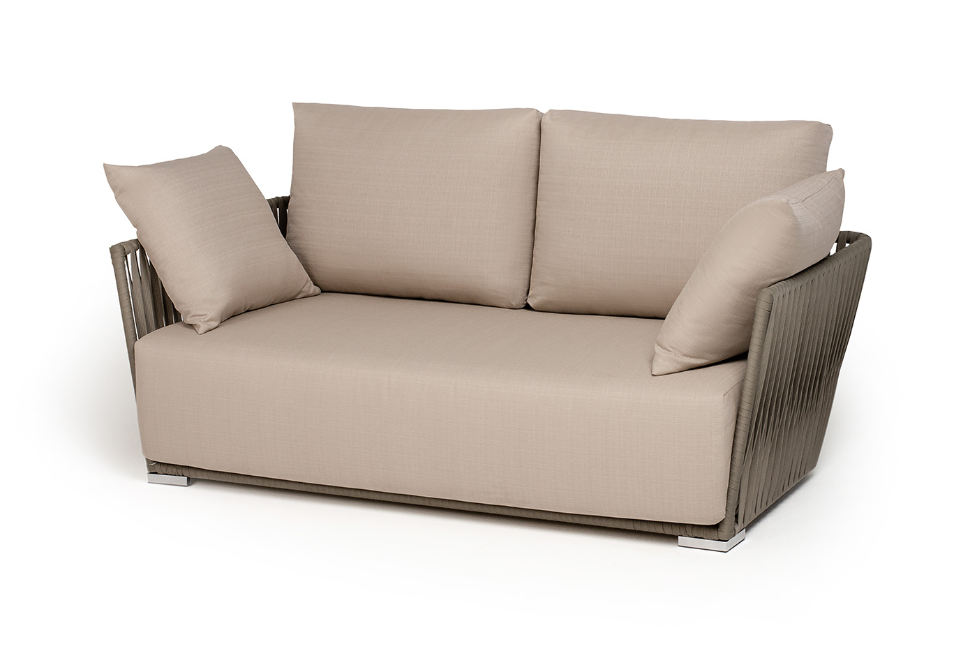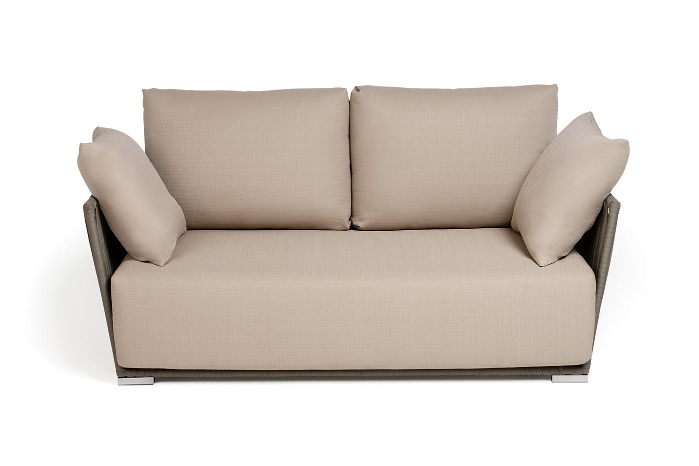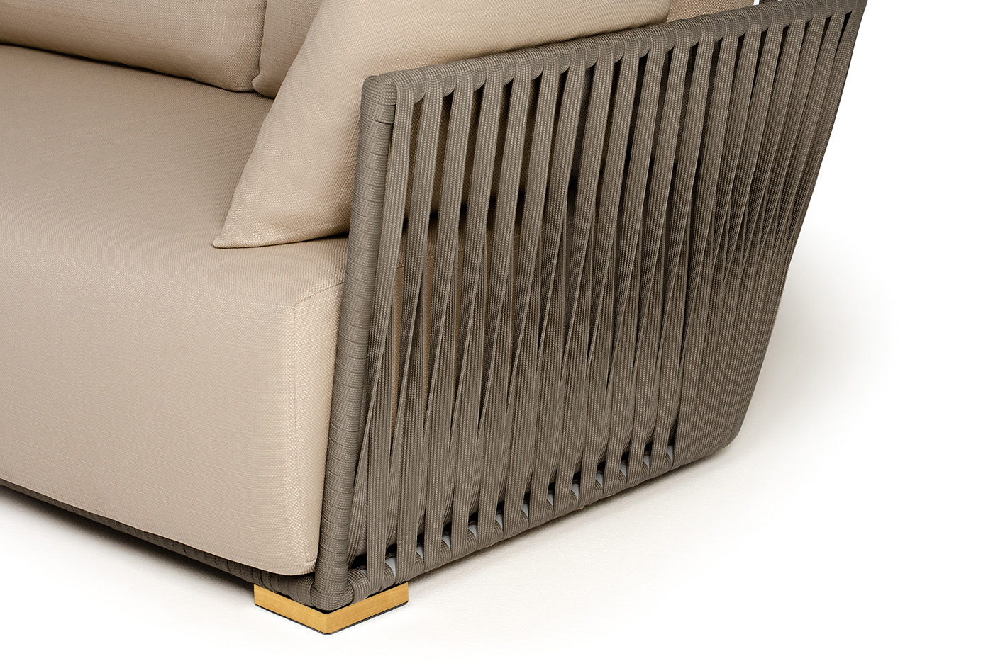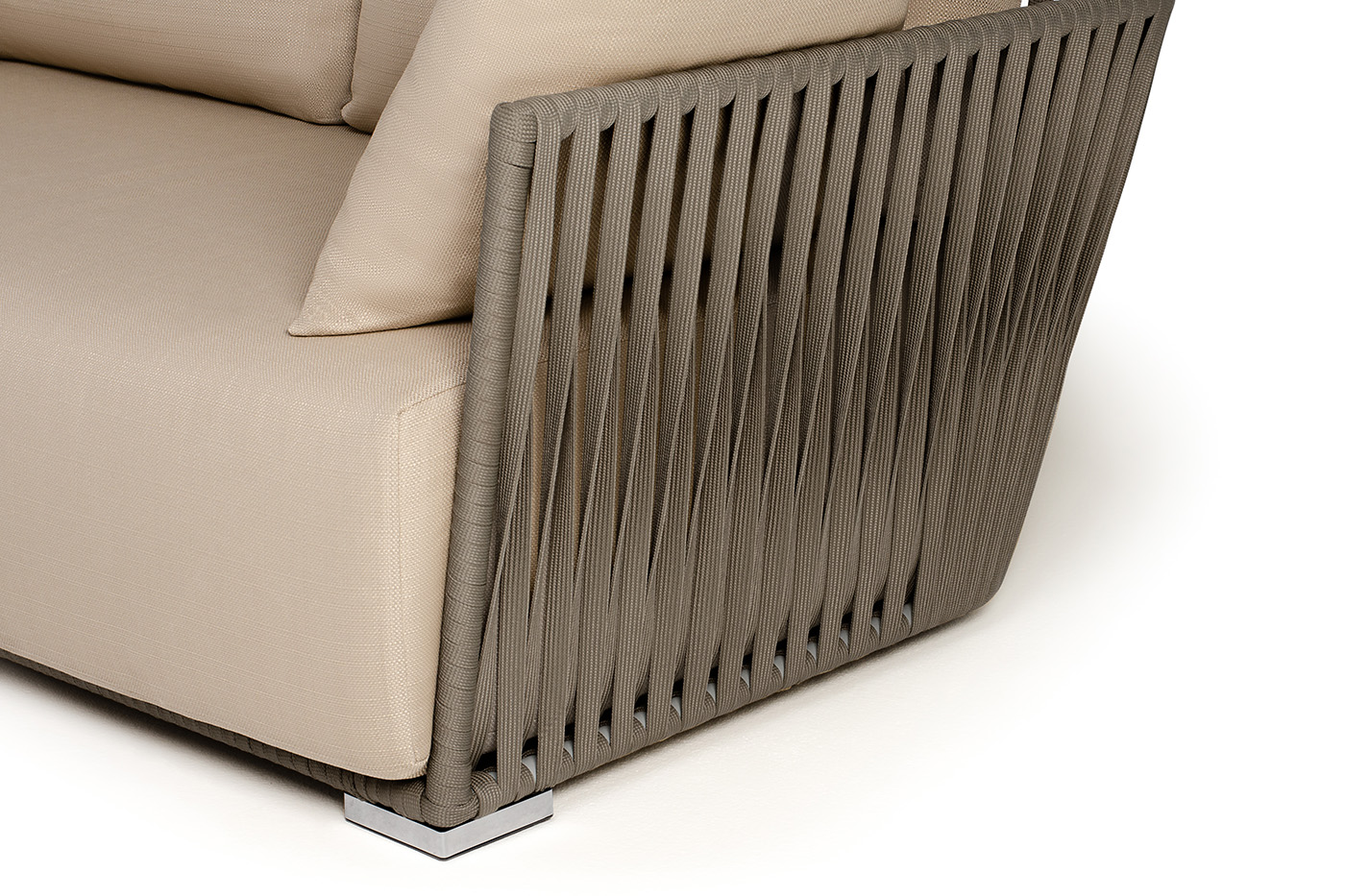 Диван имеет алюминиевый каркас, окрашенный порошковой краской в светло-серый (RAL7035) цвет. Боковины каркаса вручную оплетены роупом - эластичными синтетическими лентами, изготовленными из высокопрочных полиэфирных волокон. Цвет оплетки - серо-коричневый.