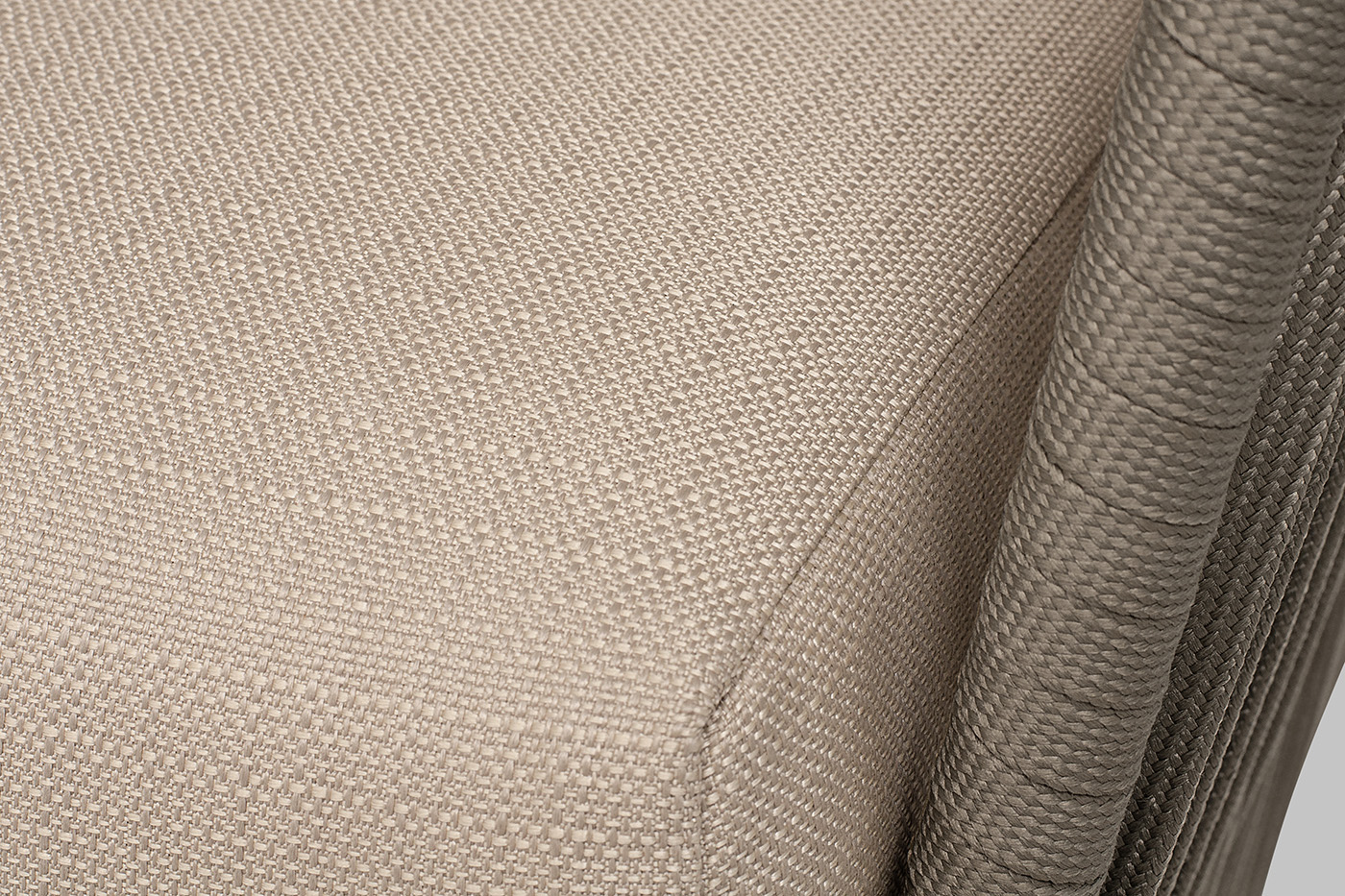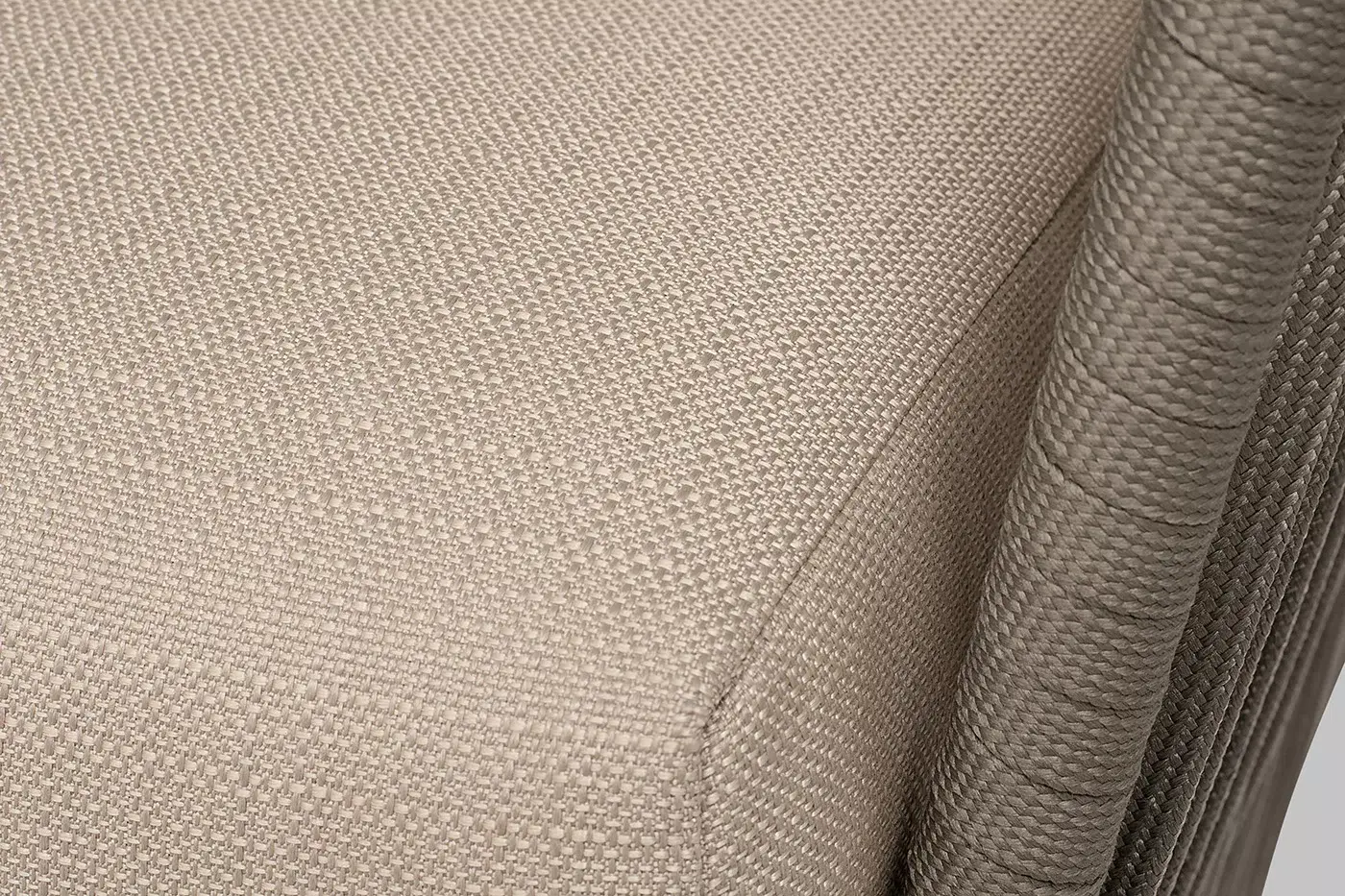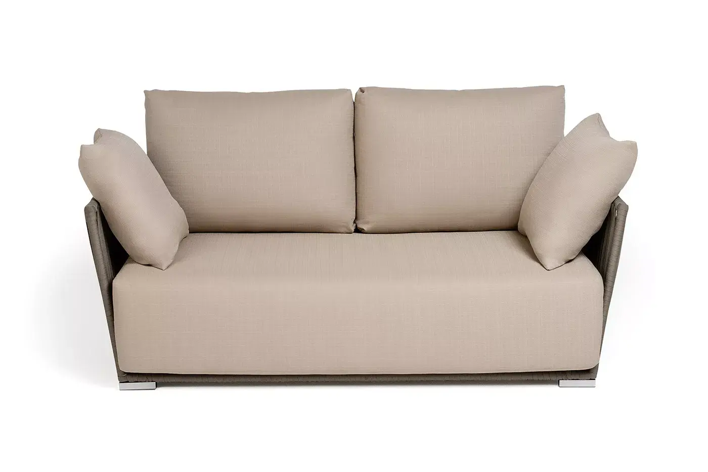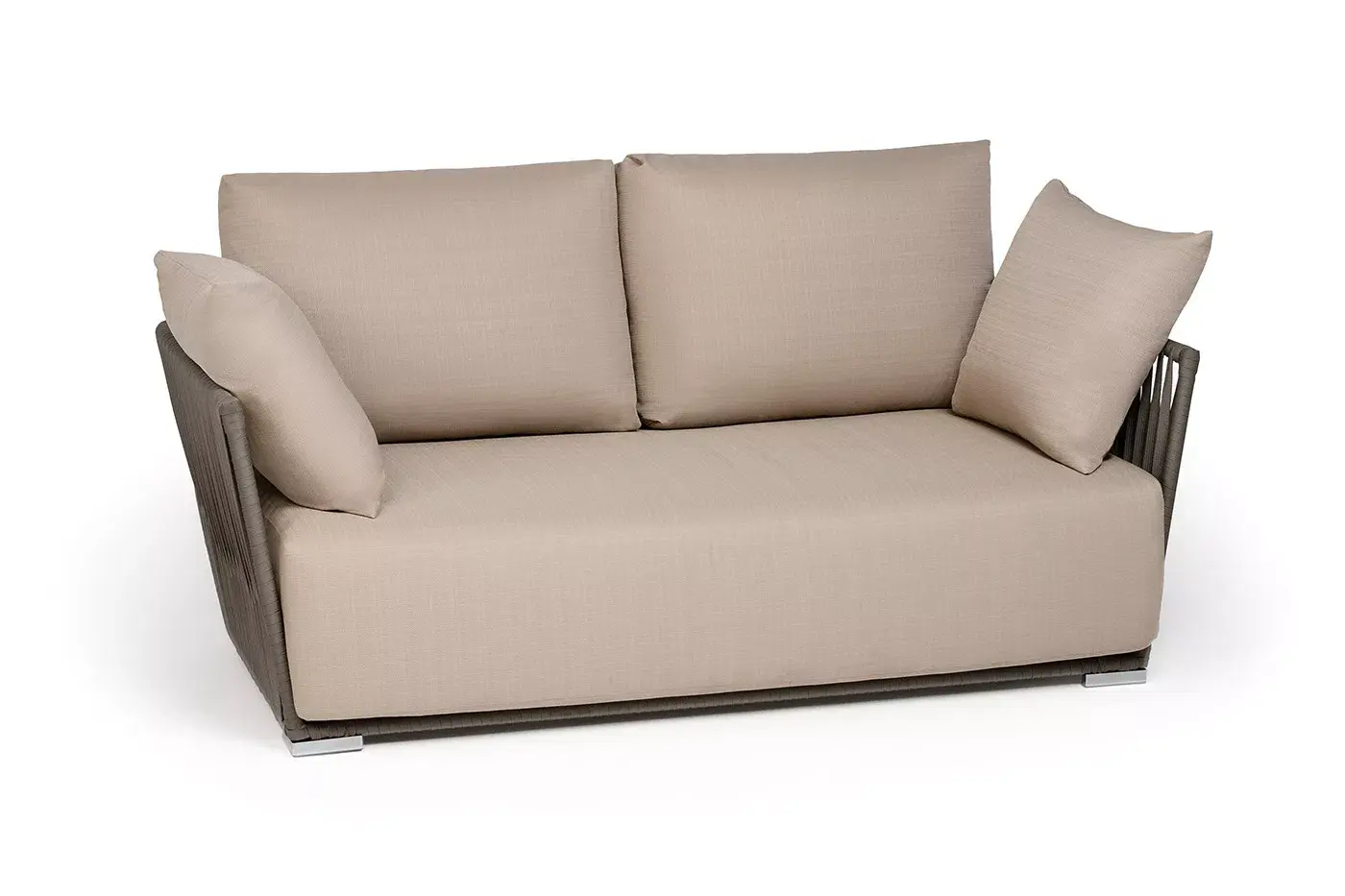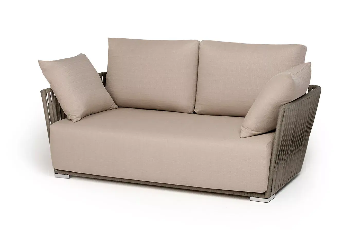 Диван имеет алюминиевый каркас, окрашенный порошковой краской в светло-серый (RAL7035) цвет. Боковины каркаса вручную оплетены роупом - эластичными синтетическими лентами, изготовленными из высокопрочных полиэфирных волокон. Цвет оплетки - серо-коричневый.