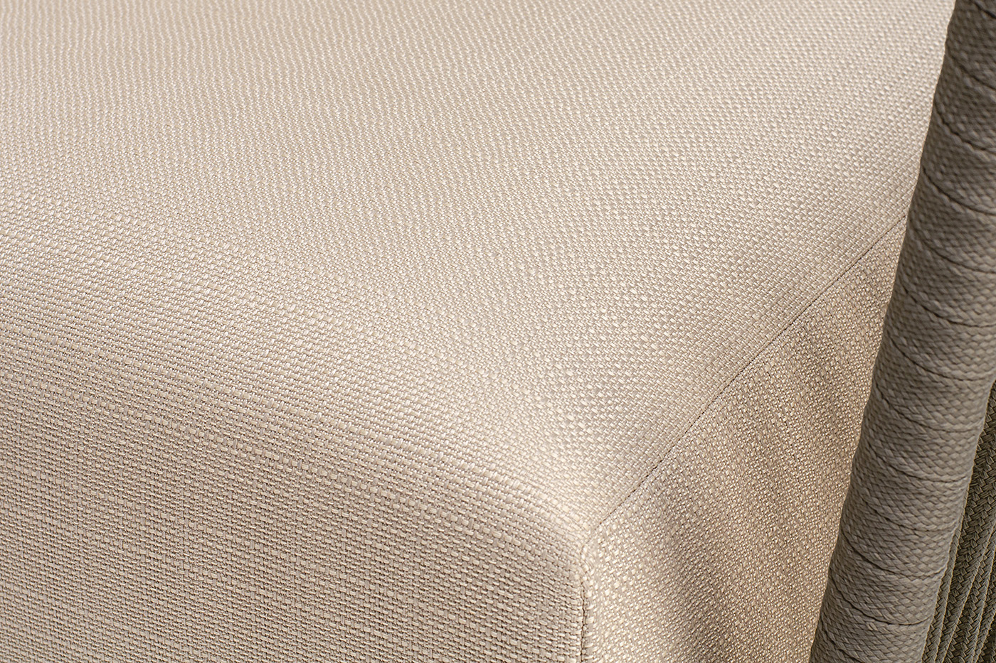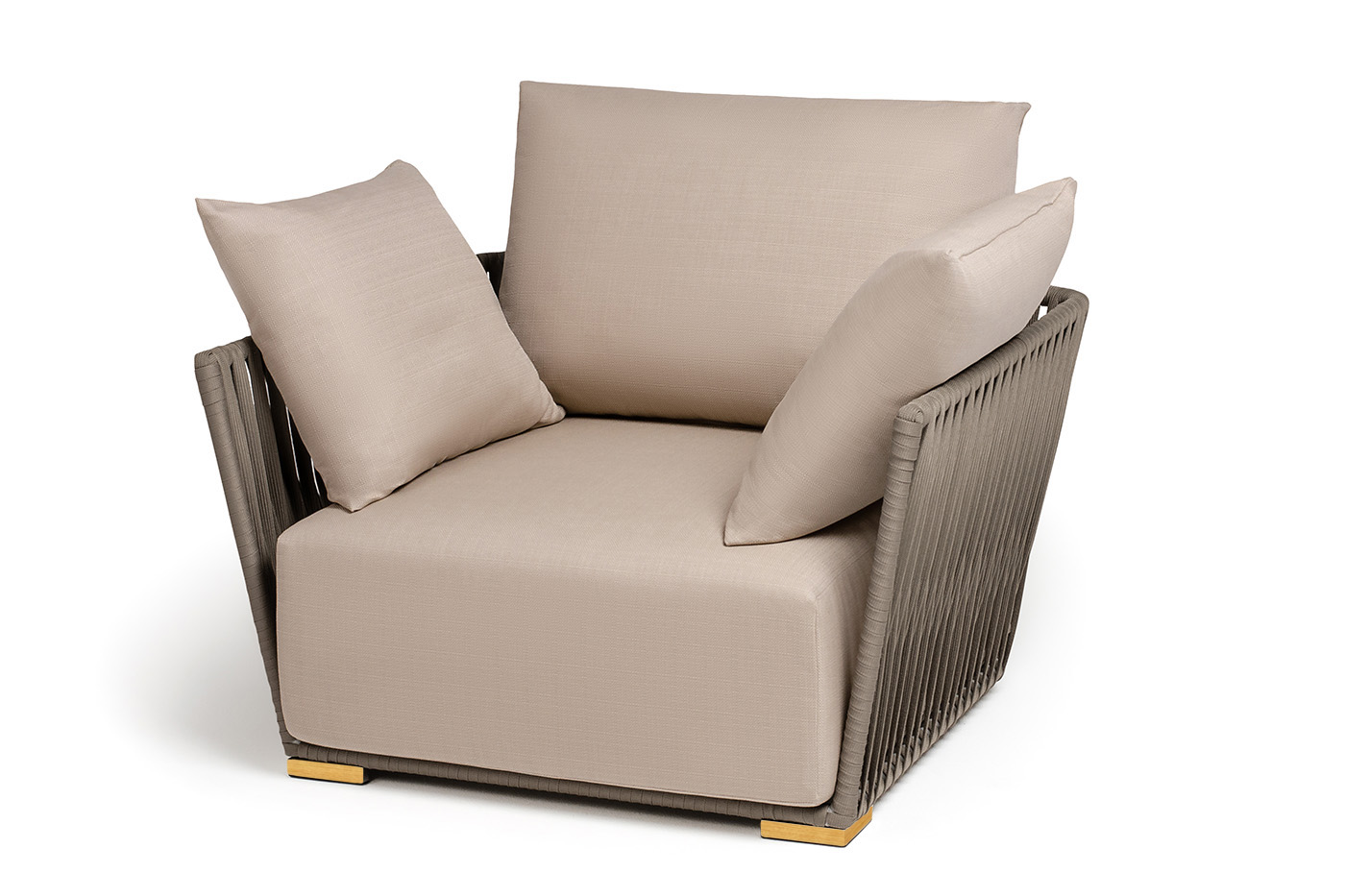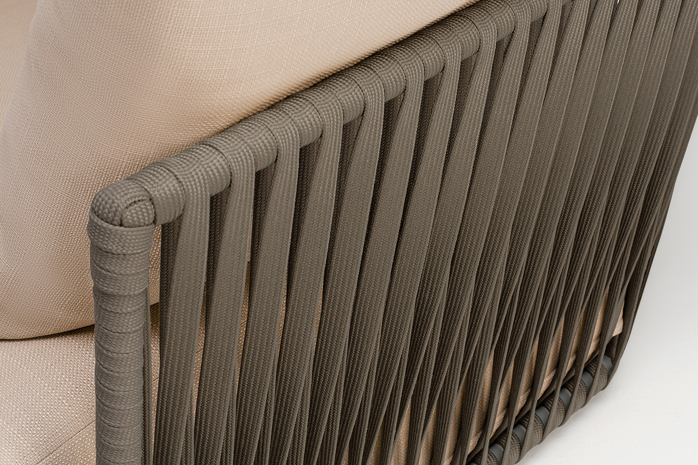 Кресло имеет алюминиевый каркас, окрашенный порошковой краской в светло-серый (RAL7035) цвет. Боковины каркаса вручную оплетены роупом - эластичными синтетическими лентами, изготовленными из высокопрочных полиэфирных волокон. Цвет оплетки - серо-коричневый.