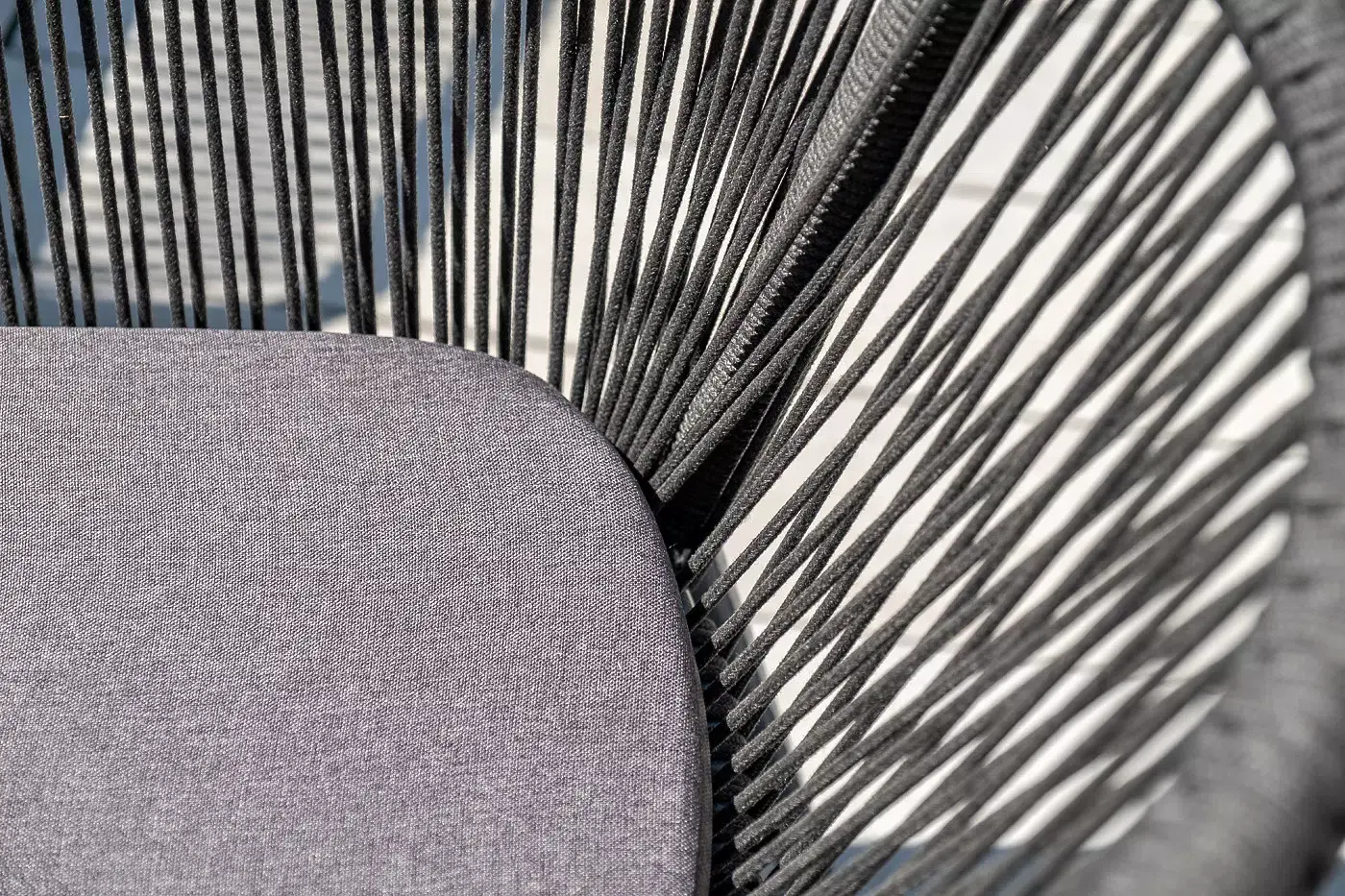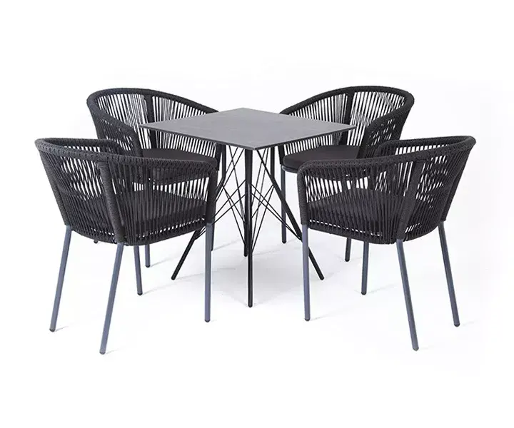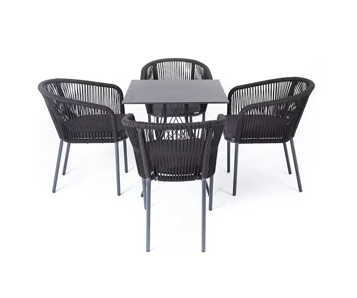 4 кресла из коллекции «Марсель», выполненных из алюминиевого каркаса и ручной оплетки роупом. Это эластичные синтетические ленты из высокопрочных полиэфирных волокон, представлены в темно-сером цвете.