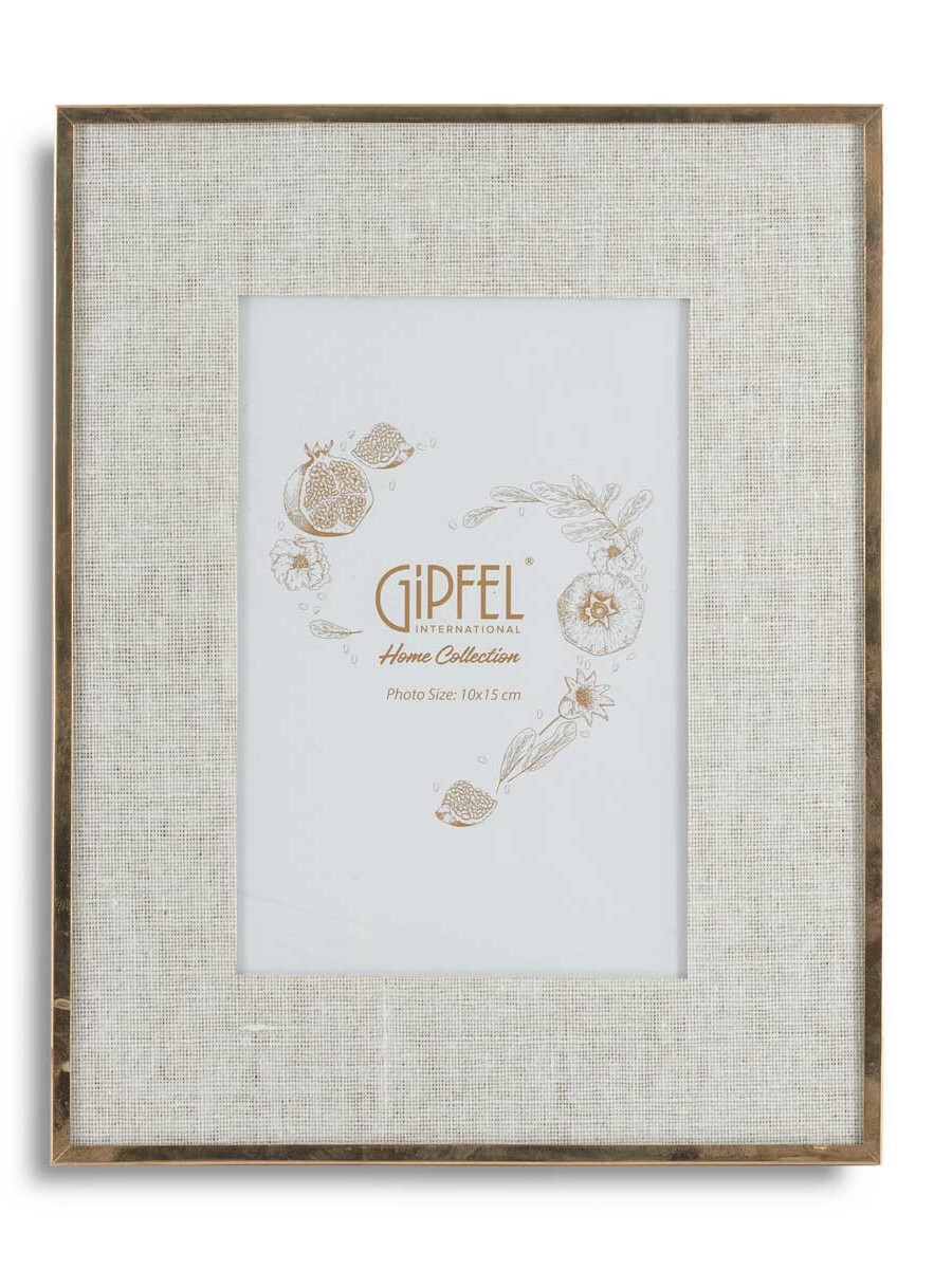 Фоторамка GIPFEL GRADUATO 40104. Для фото размером 10х15 см. Размер фоторамки 23х18х1см. Рамка золотистого цвета, внутри имеет отделку из бежевого льна. Материал: стекло, медь, лён, бумага.