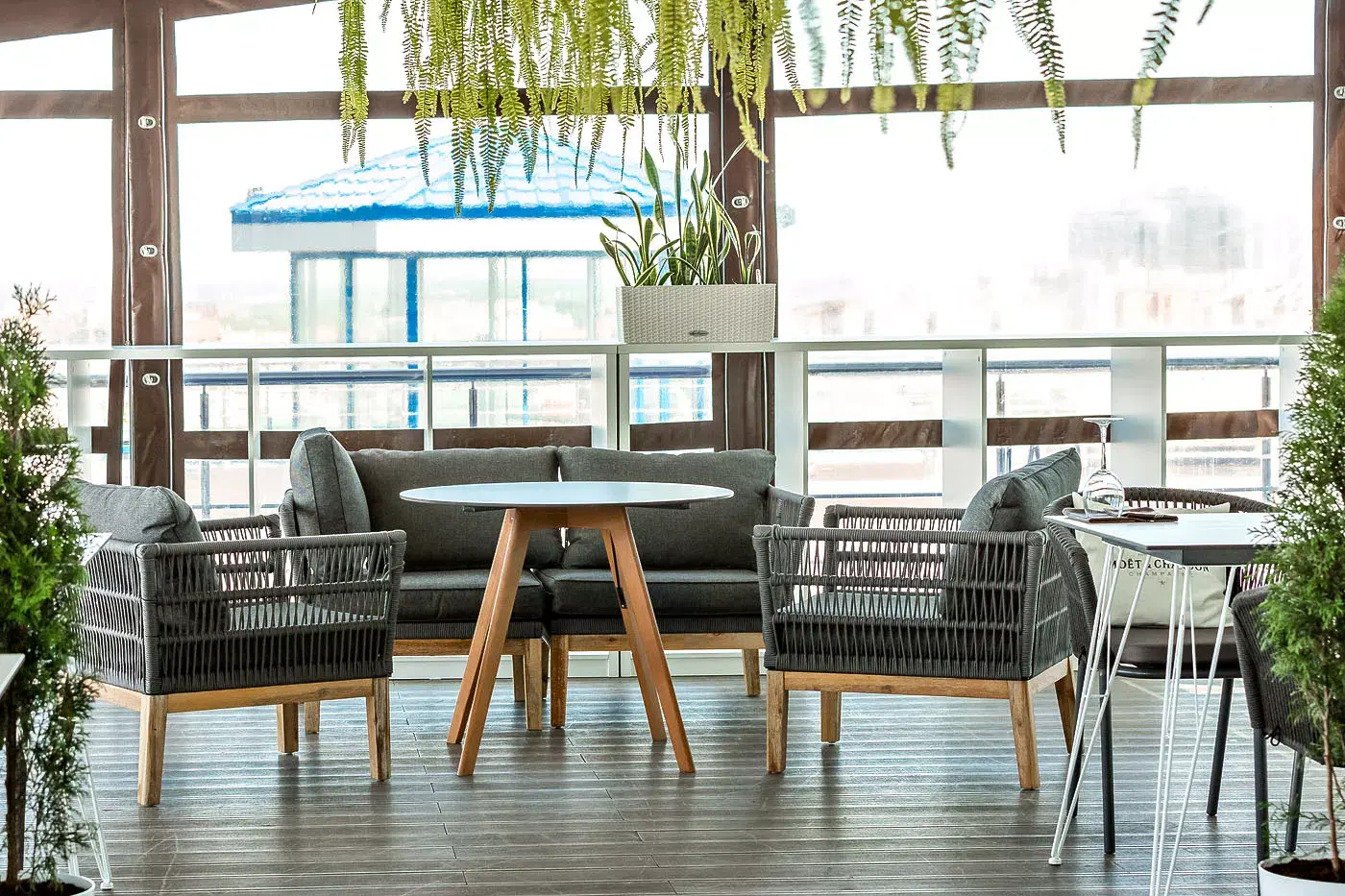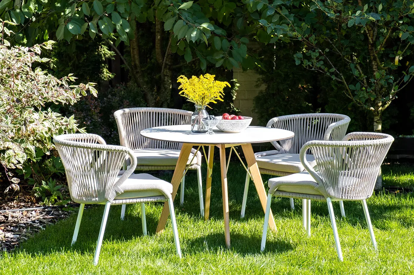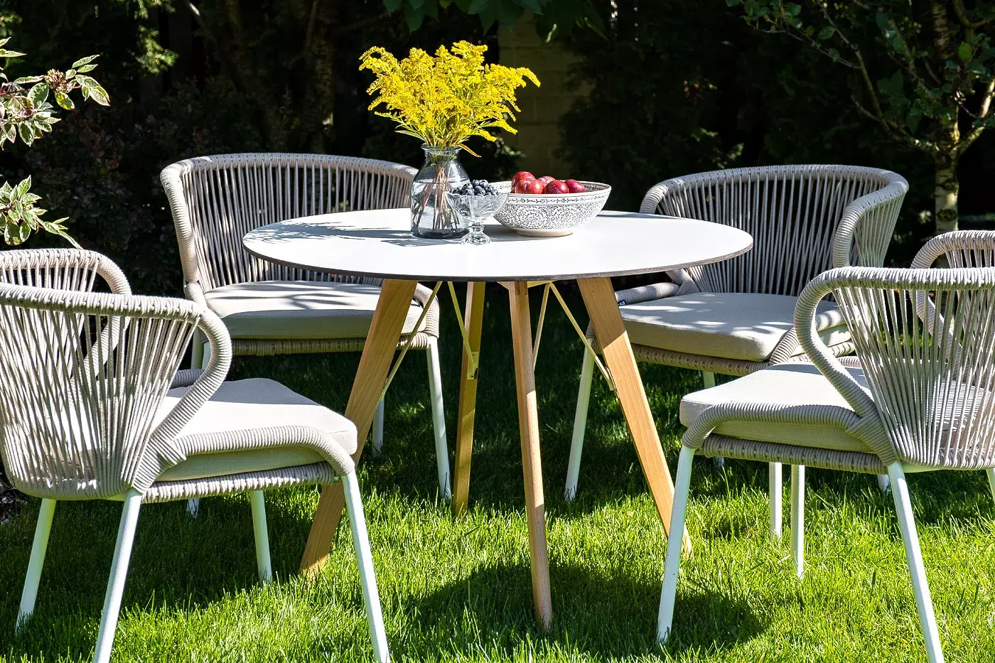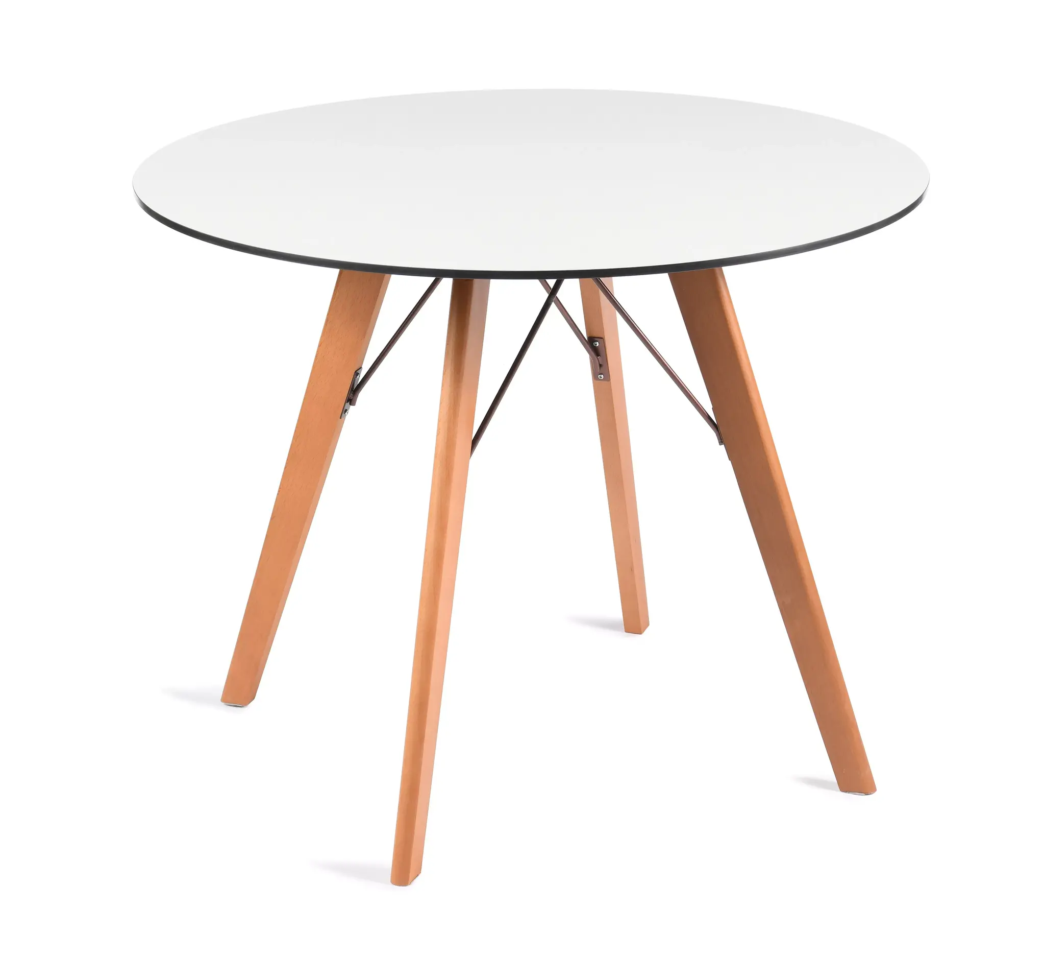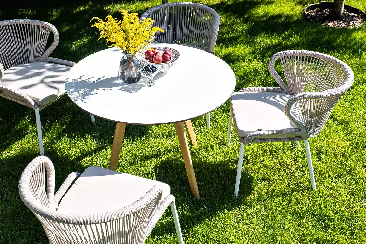Подстолье выполнено из натурального дерева, с сохранением цвета и фактуры. Столешница - высококачественный монолитный компакт-пластик HPL молочного оттенка. Материал устойчив к механическим повреждениям, попаданию влаги, высоким температурам и пригоден для использования на открытом пространстве.