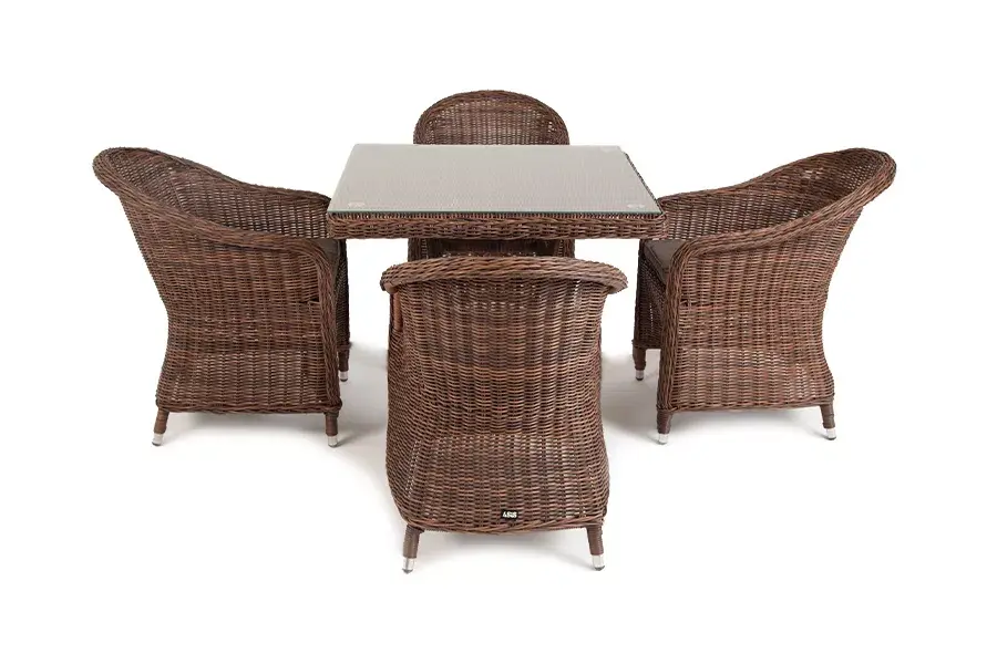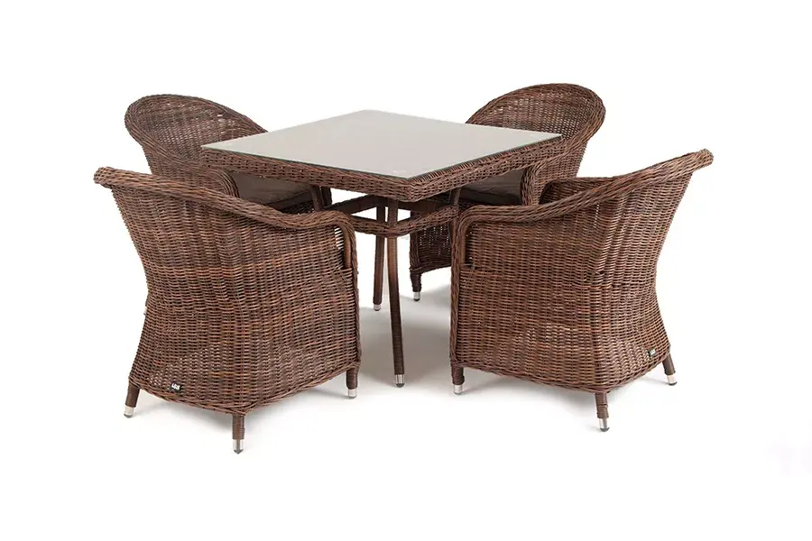 Обеденная группа «Фредо» для сада, веранды, летней площадки ресторана. В набор входит квадратный стол «Айриш» (900×900×750 мм) и 4 кресла «Равенна» (570×680×810 мм) в насыщенном коричневом оттенке.