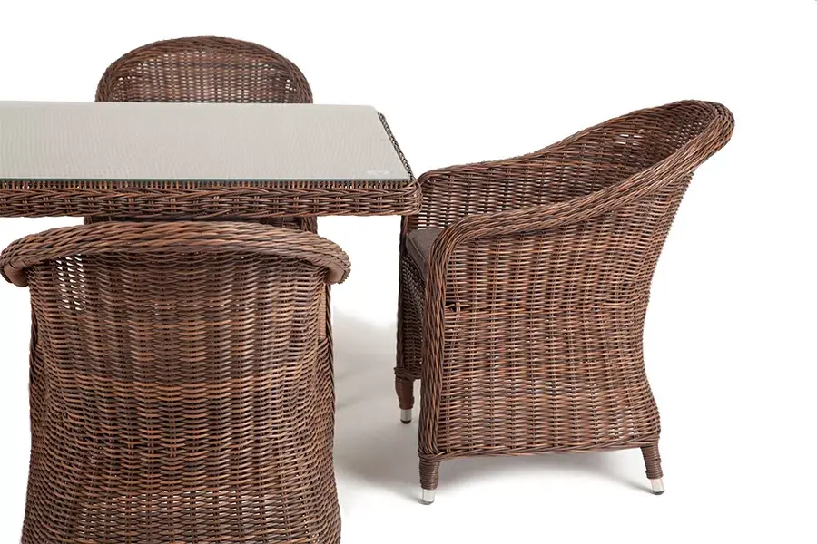Каркас мебели выполнен из легкого и долговечного алюминия, оплетенного вручную синтетической ротанговой лозой. Кресла идут с подушками в комплекте. Материал столешницы – ударопрочное стекло 5 мм.
