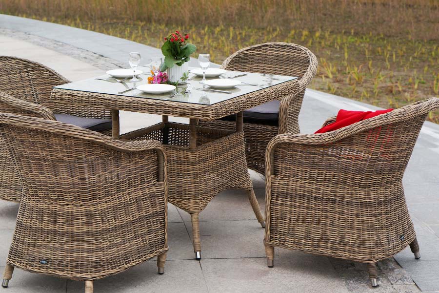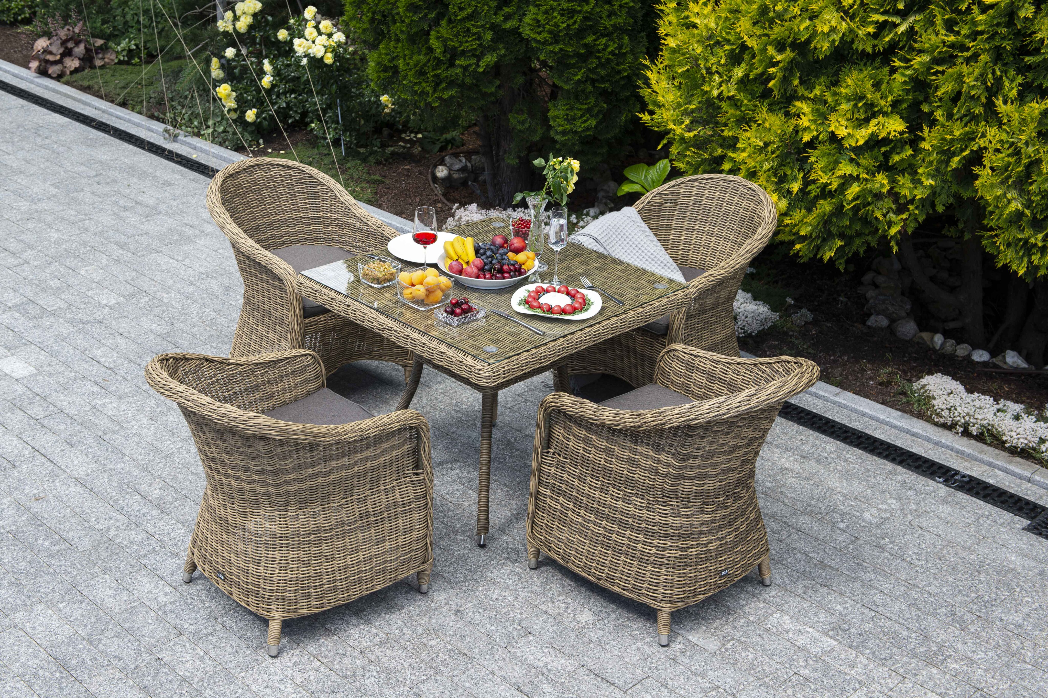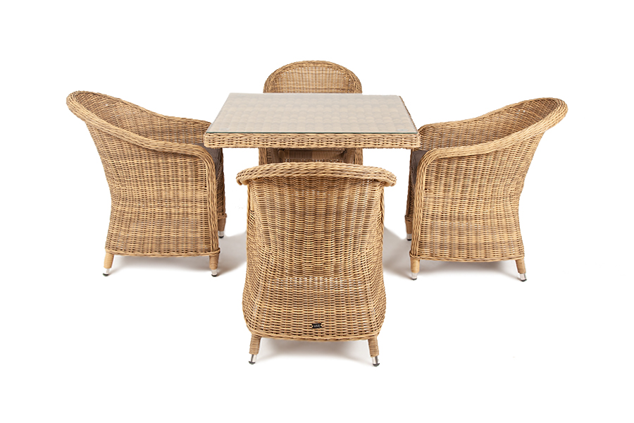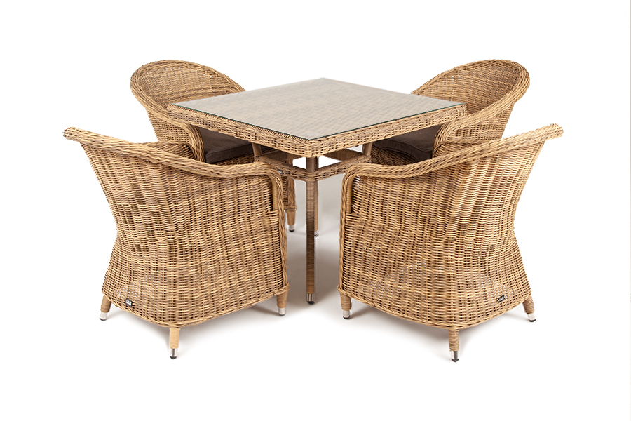 Уличная обеденная группа «Фредо» для обустройства зоны отдыха. Комплект состоит из: квадратного обеденного стола «Айриш» - 900×900×750 мм и 4 кресел «Равенна» - 570×680×810 мм в натуральном соломенном цвете.