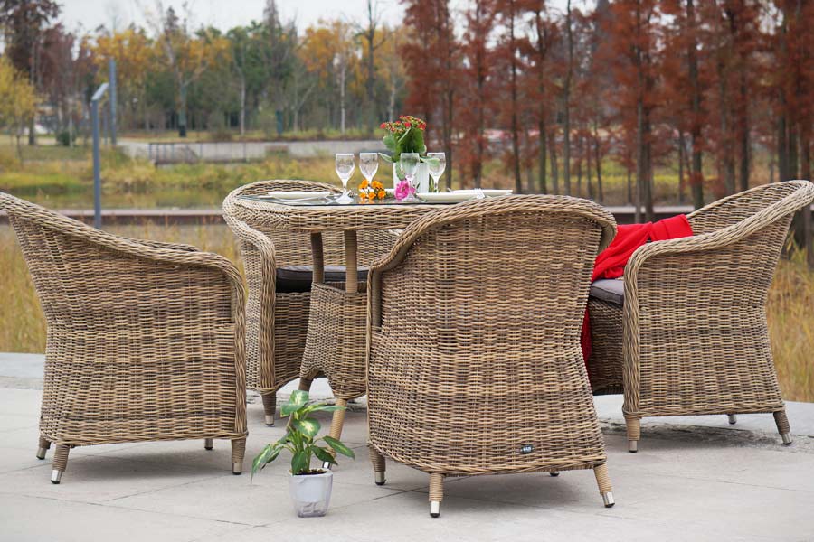 Вся мебель изготовлена из алюминия, поэтому ее очень легко перемещать. Декоративное покрытие выполнено из долговечного искусственного ротанга, устойчивого к перепадам температур и переменам погоды. Столешница изготовлена из прочного закаленного стекла 5 мм, кресла укомплектованы подушками серого цвета со съёмными чехлами.