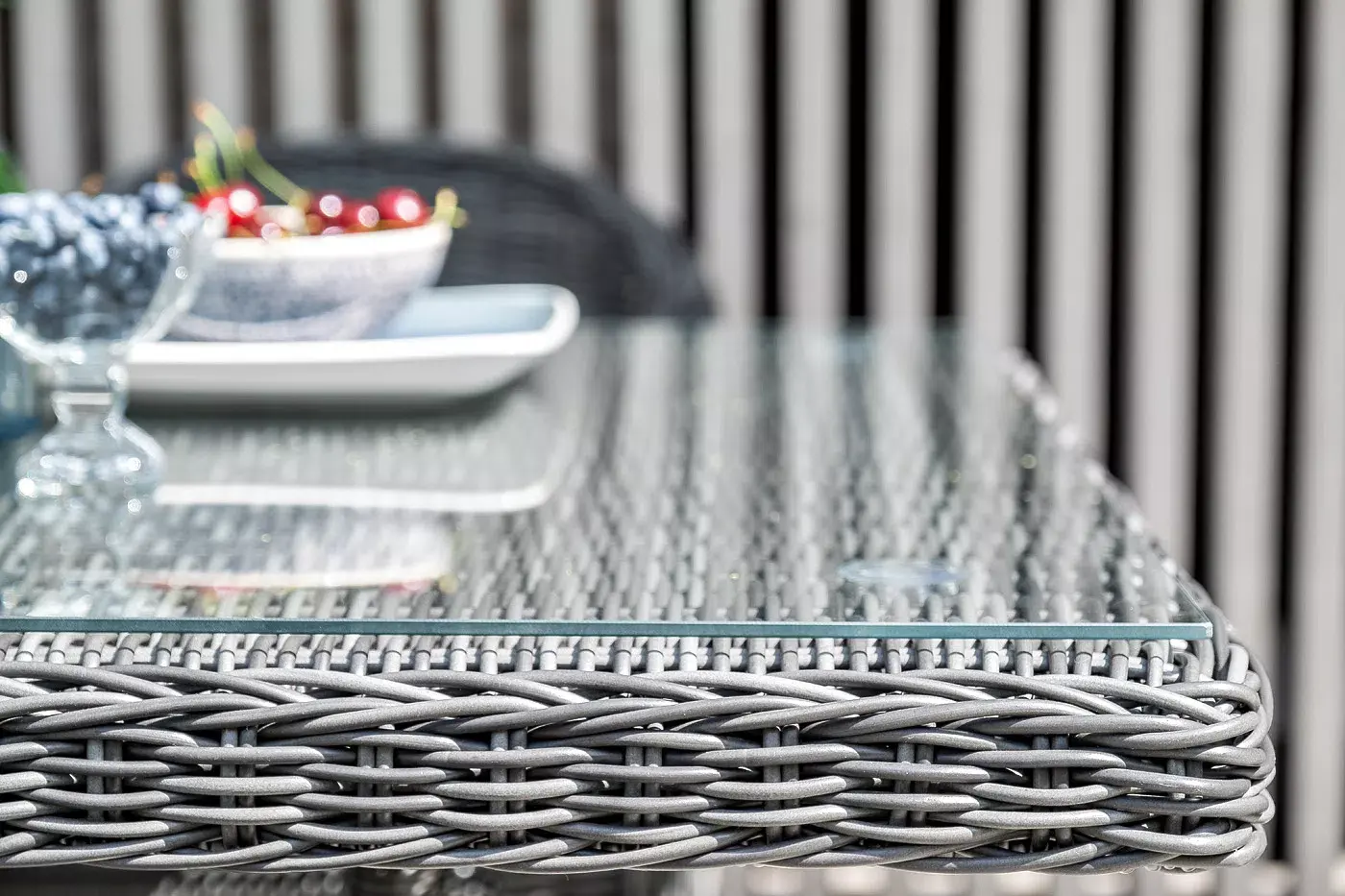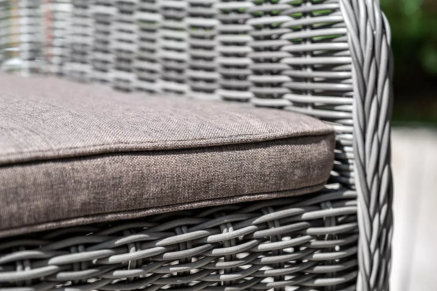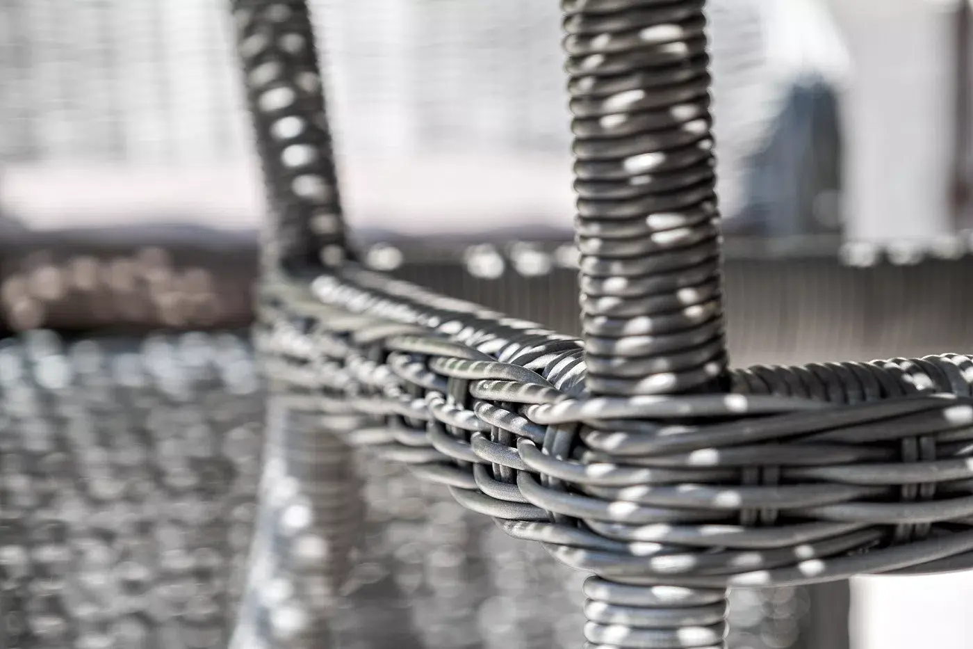 Вся мебель изготовлена из алюминия, поэтому ее очень легко перемещать. Декоративное покрытие выполнено из долговечного искусственного ротанга, устойчивого к перепадам температур и переменам погоды. Столешница изготовлена из прочного закаленного стекла 5 мм, кресла укомплектованы подушками серого цвета со съёмными чехлами.