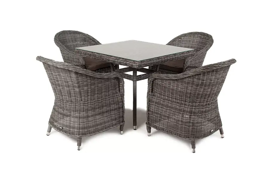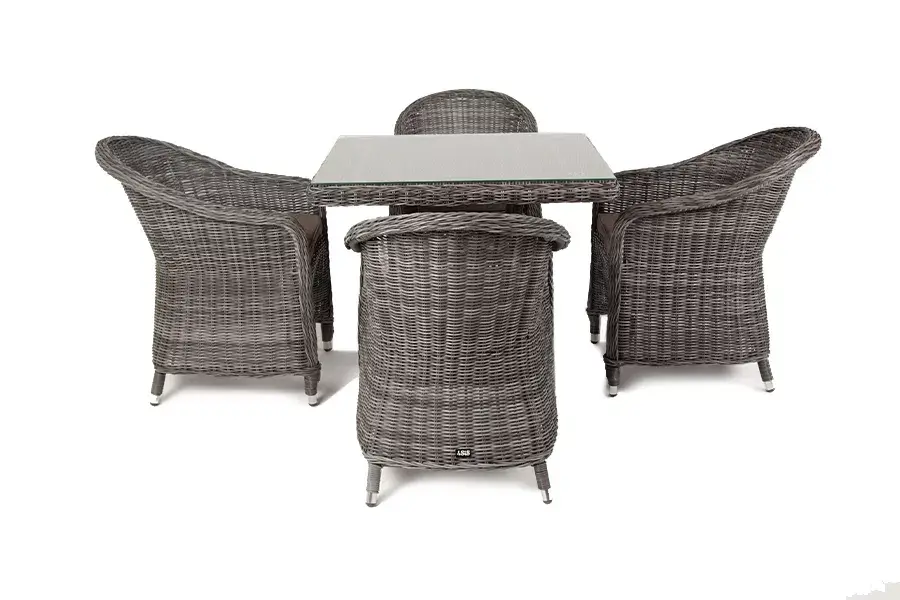 Уличная обеденная группа «Фредо» для обустройства зоны отдыха. Комплект состоит из: квадратного обеденного стола «Айриш» - 900×900×750 мм и 4 кресел «Равенна» - 570×680×810 мм в графитовом цвете.