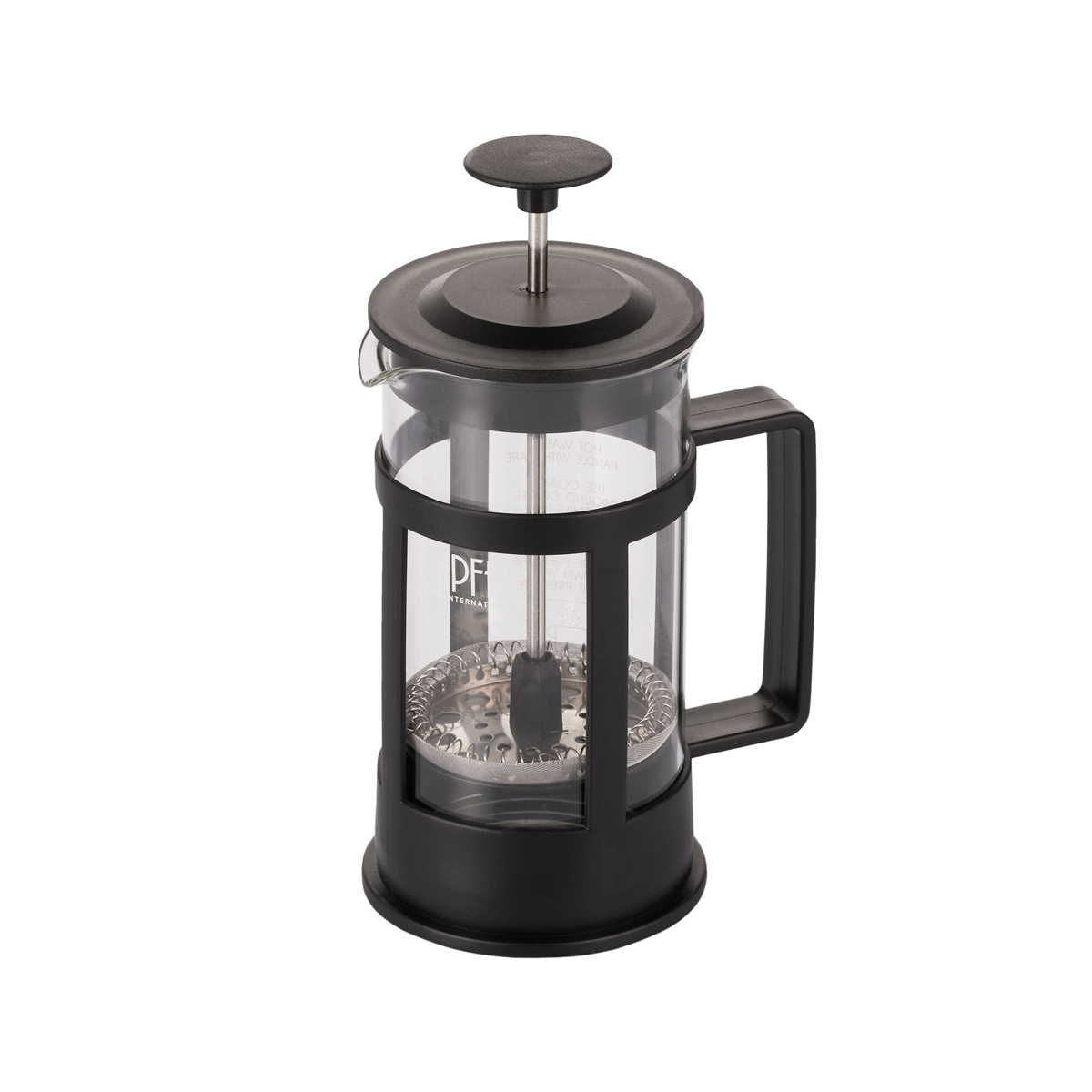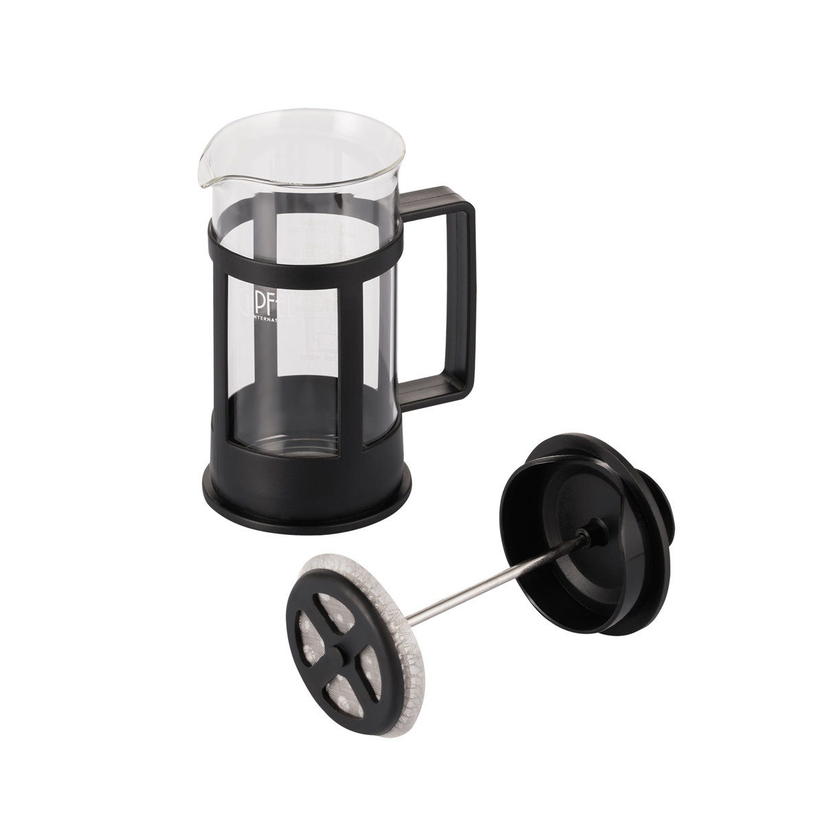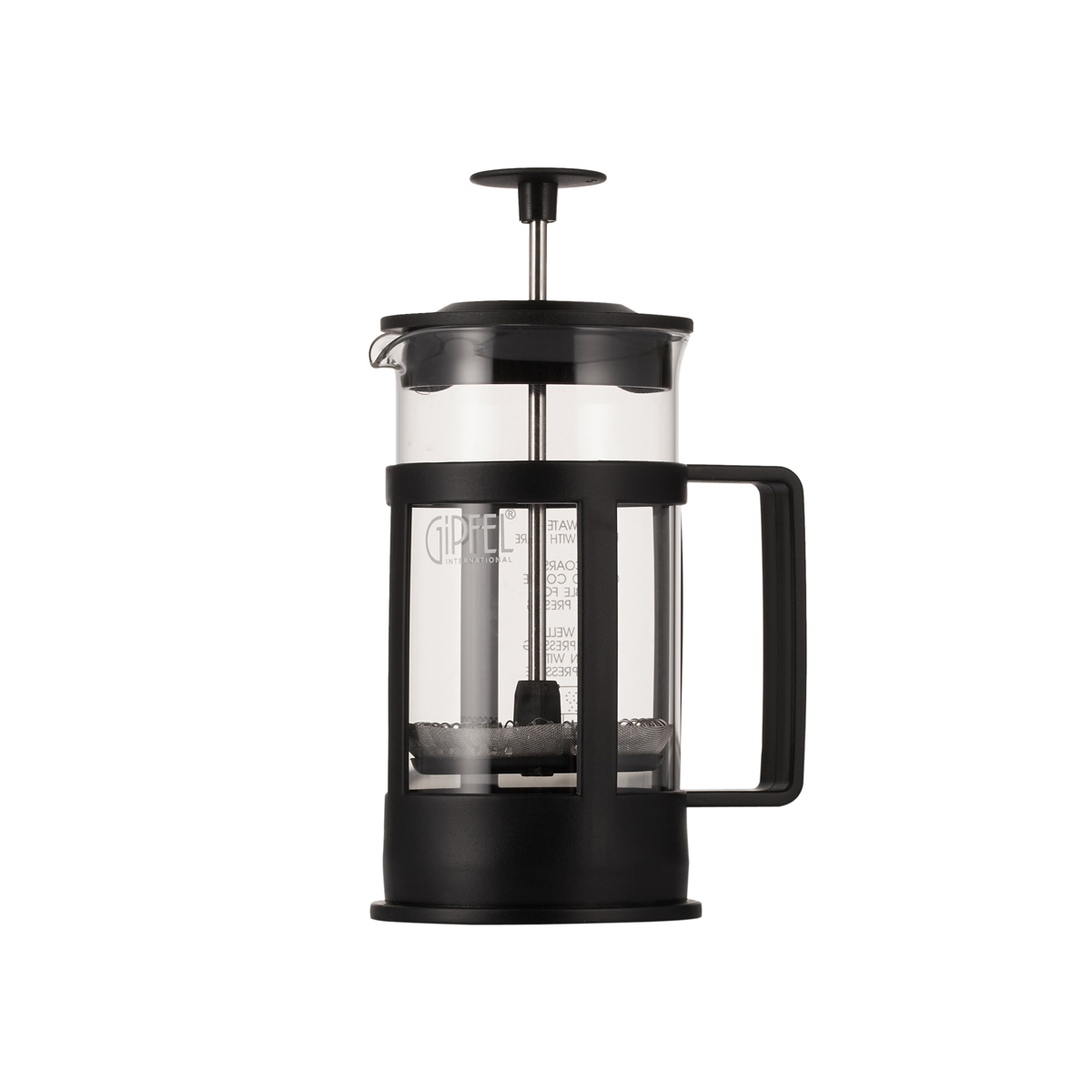 Френч-пресс GLACIER-SEVILLA GIPFEL 7443. Объем составляет 350мл. Френч-пресс сделан из жаропрочного боросиликатного стекла. Внутренние элементы сделаны из хирургической стойкой к коррозии стали 18/10. Крышка, каркас и ручка выполнены из черного пластика. Стильный минималистичный дизайн позволяет ему сочетаться в любыми предметами сервировки. Ручка удобна даже для большой ладони.