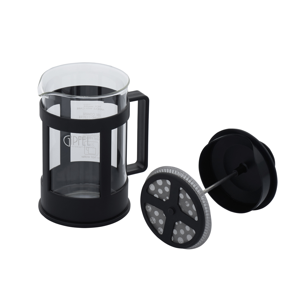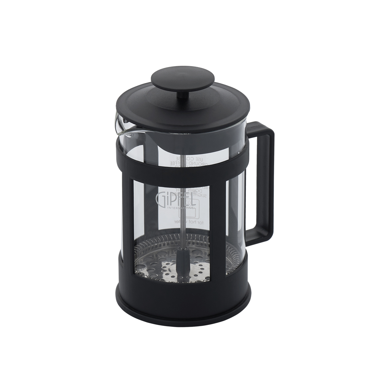 Френч-пресс GIPFEL GLACIER-SEVILLA 7444. Объем составляет 800 мл. Френч-пресс сделан из жаропрочного боросиликатного стекла. Внутренние элементы сделаны из хирургической стойкой к коррозии стали 18/10. Крышка, каркас и ручка выполнены из черного пластика. Стильный минималистичный дизайн позволяет ему сочетаться в любыми предметами сервировки. Ручка удобна даже для большой ладони. Диаметр 10 см, высота 16 см, высота с крышкой 17,5 см.