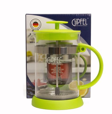 Френч-пресс GIPFEL LUMINOSSI 7139 объемом 800мл. Френч-пресс сделан из жаропрочного боросиликатного стекла, внутренние элементы из нержавеющей стали 18/10. Ручка, крышка и нижняя часть из пластика зеленого цвета.