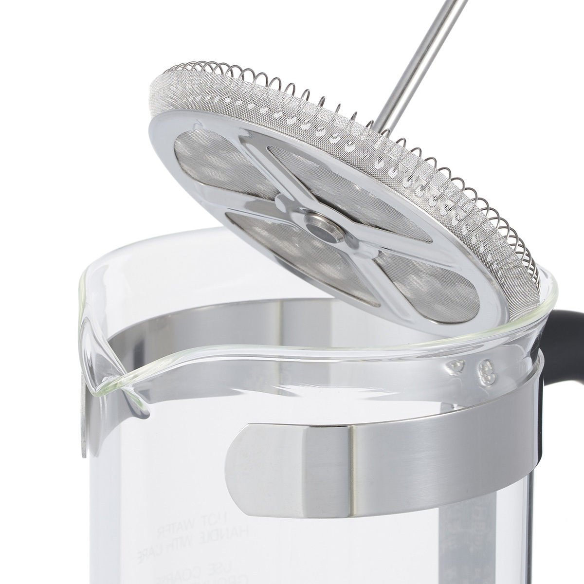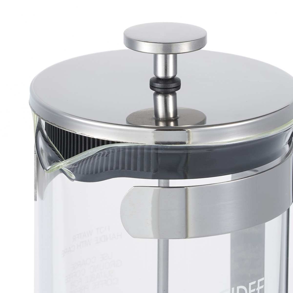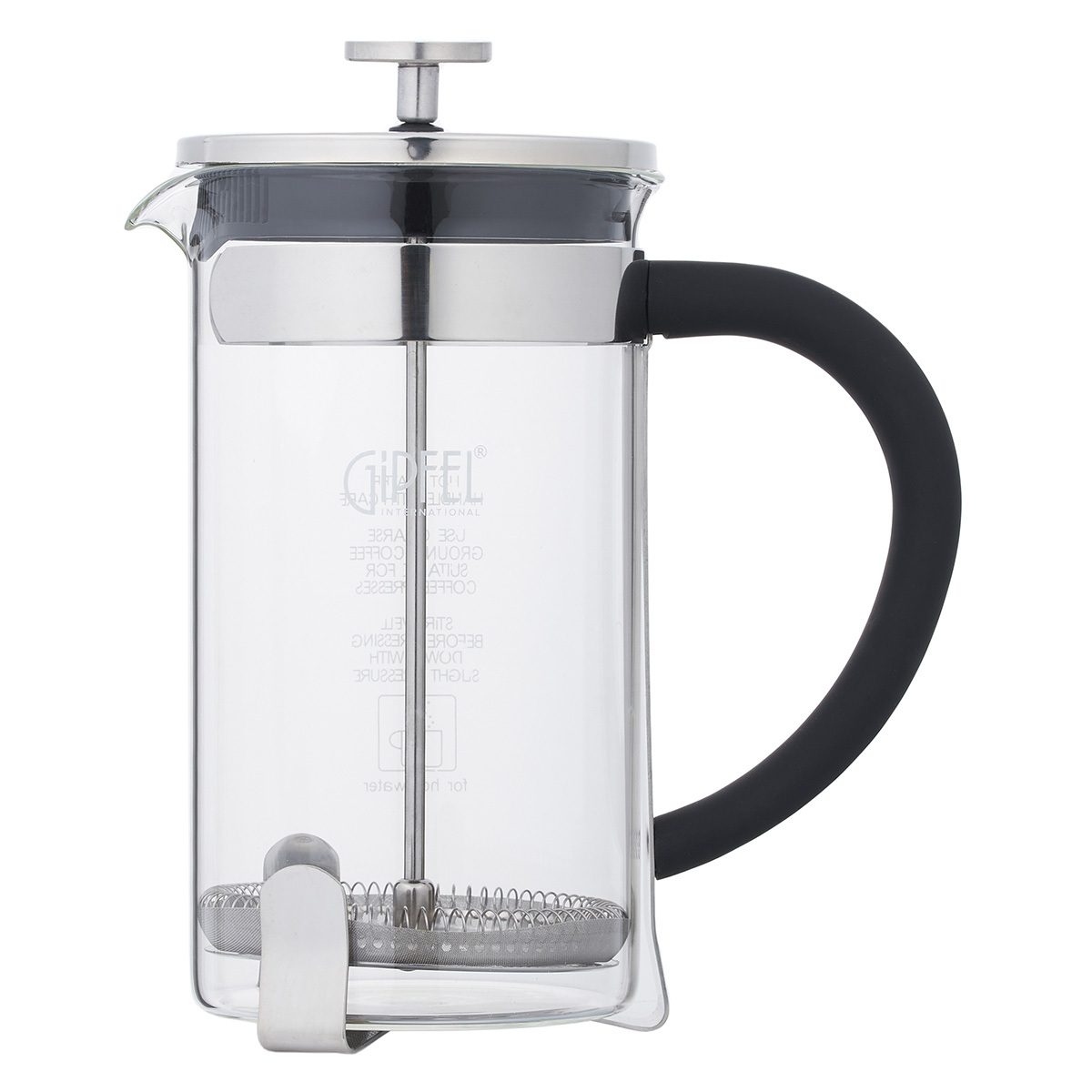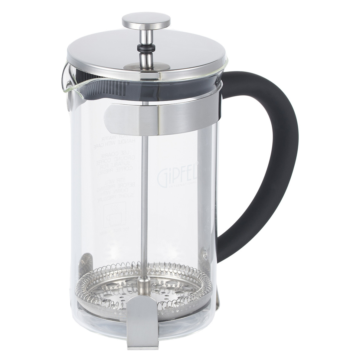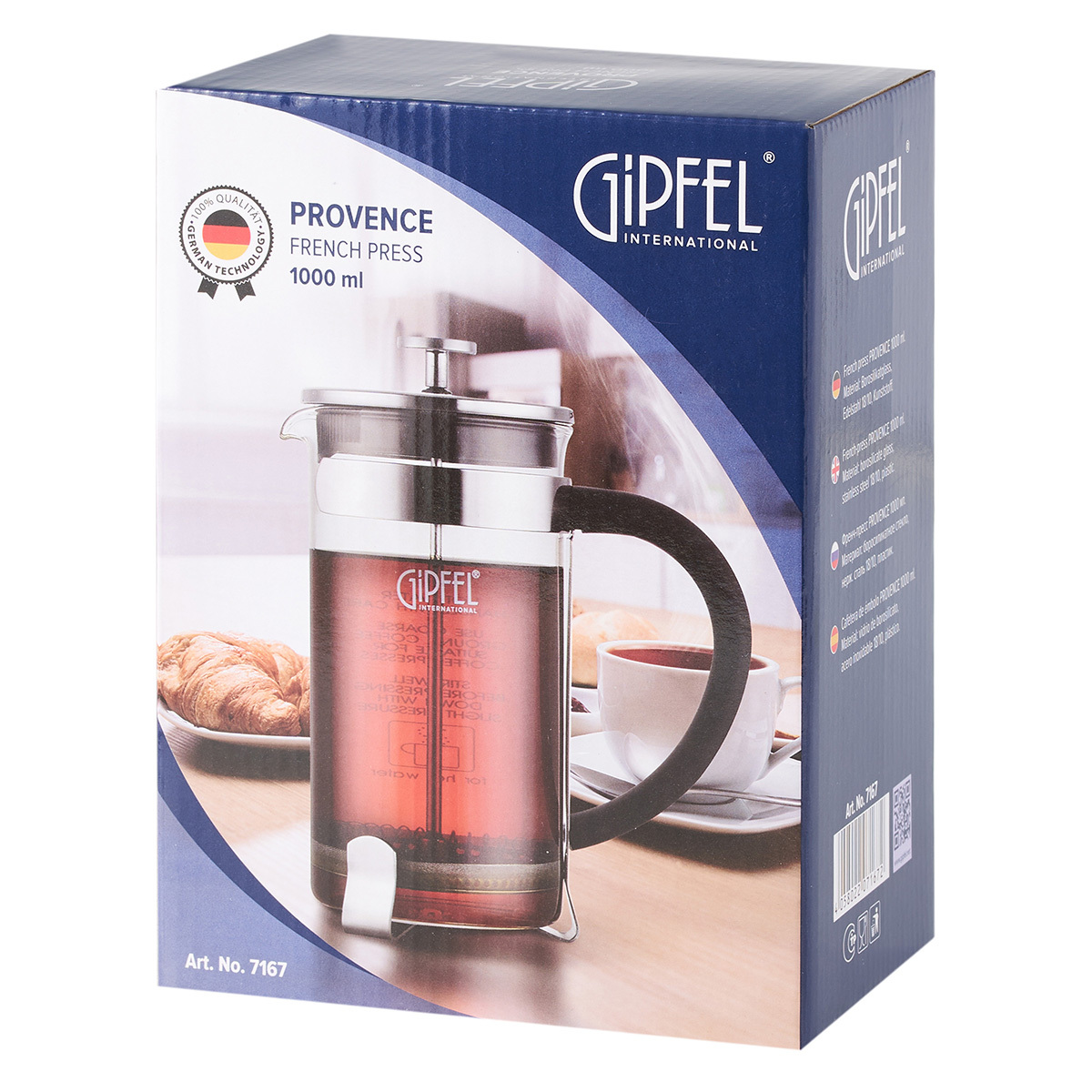 Френч-пресс Gipfel Provence 7167. Объем 1000 мл. Изготовлен из боросиликатного стекла. Ножки и фильтр изготовлены из нержавеющей стали 18/10. Ручка пластиковая.