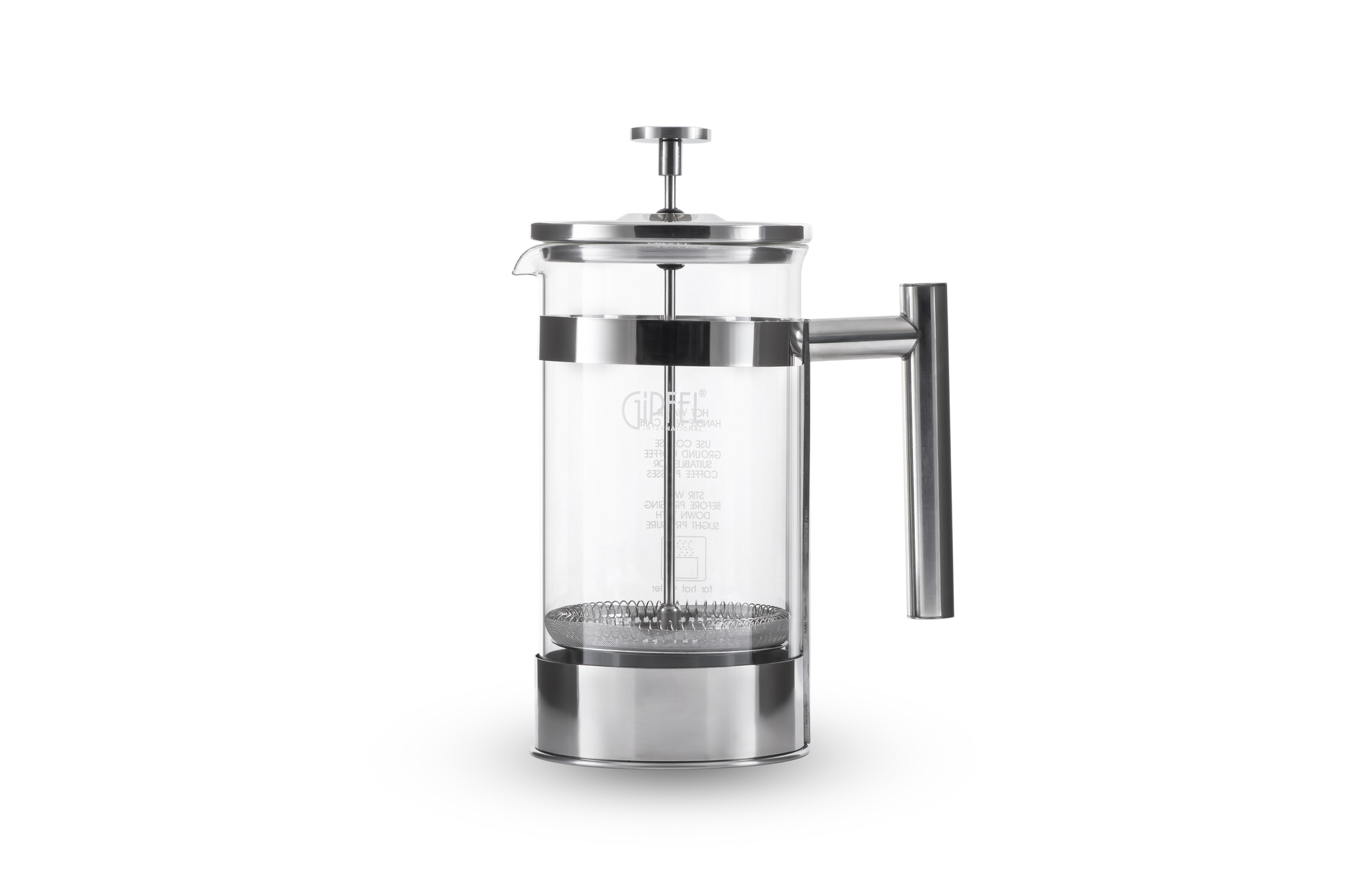 Френч-пресс GIPFEL VIENNE 7166. Объем составляет 600мл. Френч-пресс сделан из жаропрочного боросиликатного стекла. Крышка, ручка, внутренние элементы и каркас френч-пресса сделаны из хирургической стойкой к коррозии стали 18/10. Стильный минималистичный дизайн позволяет ему сочетаться в любыми предметами сервировки. Ручка удобна даже для большой ладони. Фильтр с пружинкой можно также использовать для взбивания молока.