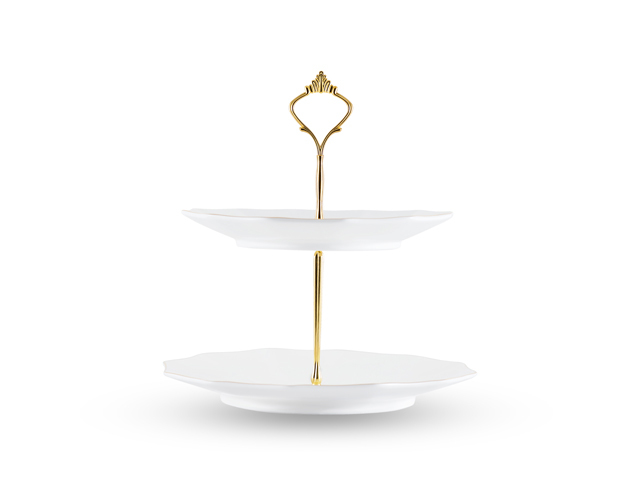 Этажерка двухъярусная Gipfel AFRODITA 3891. Диаметр нижнего яруса 24 см, верхнего 20 см. Высота: 25 см. Этажерку можно использовать для красивой подачи на стол фруктов, сладостей, канапе. Тарелки выполнены из белого фарфора с рельефными лучами, расходящимися от центра к краям.