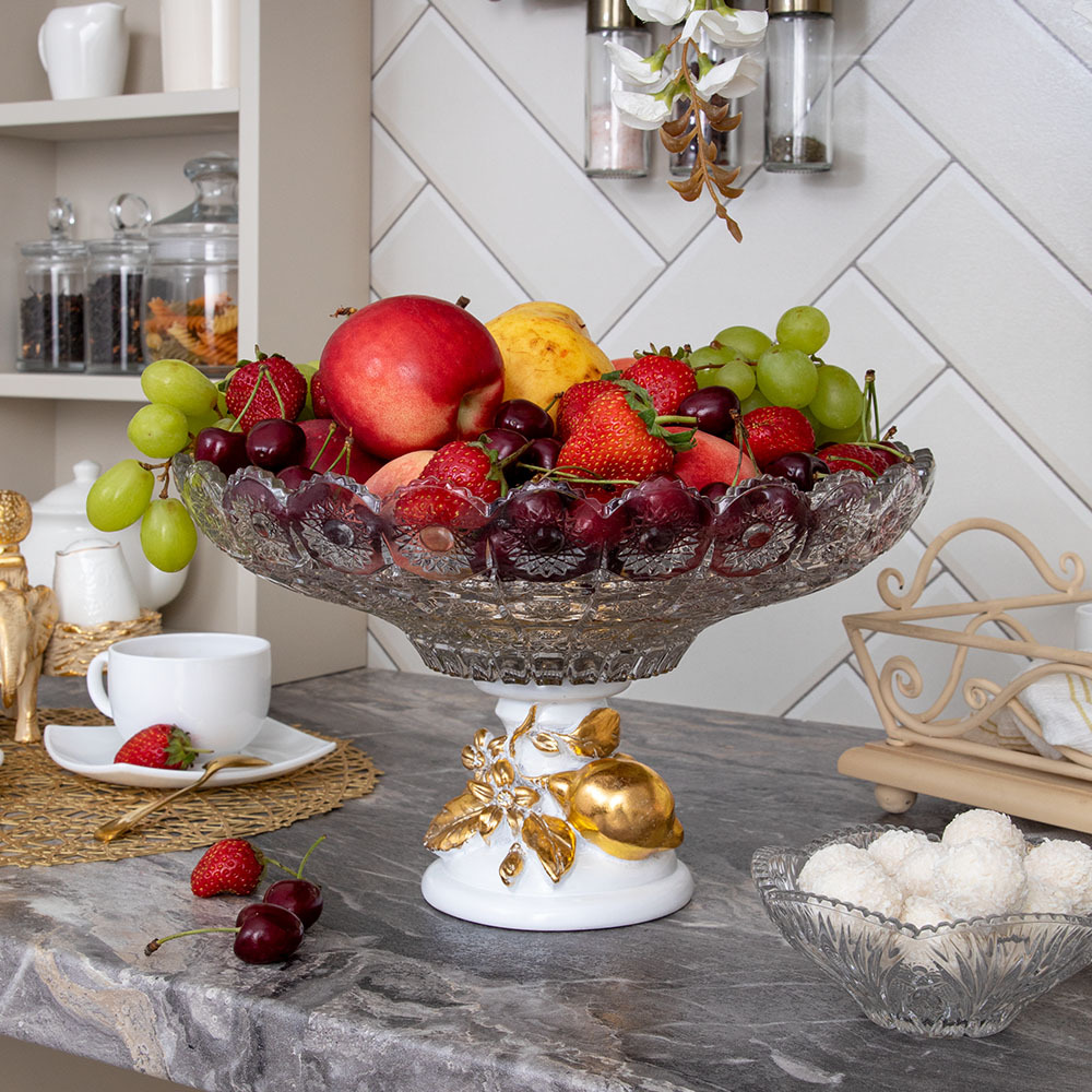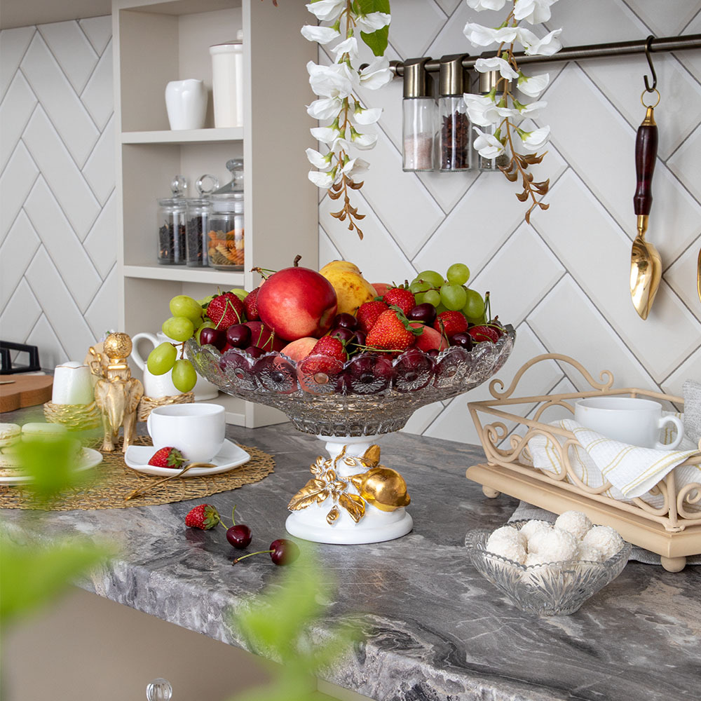 Фруктовница BOGACHO - поистине царское украшение вашего стола. Изящная ваза для фруктов отлично подойдет для конфет, печенья, пирожных, блинов и других десертов. Конфетница без крышки выглядит настолько роскошна, что ее сложно отнести к просто разряду кухонных принадлежностей, инвентарь для кухни, скорее это изысканный декор для кухни или столовой, праздничное сервировочное блюдо, которое наверняка обратит на себя внимание ваших гостей.Фруктовница - это оригинальный подарок на любой праздник.Основание фруктовницы выполнено из натурального материала – литьевого мрамора. Данный аксессуар для дома подойдет для интерьеров в стиле лофт, сканди, минимализм, эклектика, романтизм. Посуда и текстиль могут быть любыми, ведь главное украшение стола всегда у вас под рукой!Для защиты стола от царапин, мы установили накладки из мягкой ткани, препятствующая истиранию поверхности.Фруктовница на ножке завернута в воздушно - пузырчатую пленку, ложемент и надежно упакована в коробку из гофрированного картона, поэтому данный аксессуар для интерьера приедет к вам не поврежденным. Любите, чтобы интерьер был в едином стиле? Присмотритесь к продукции BOGACHO, которая будет гармонично сочетаться друг с другом.