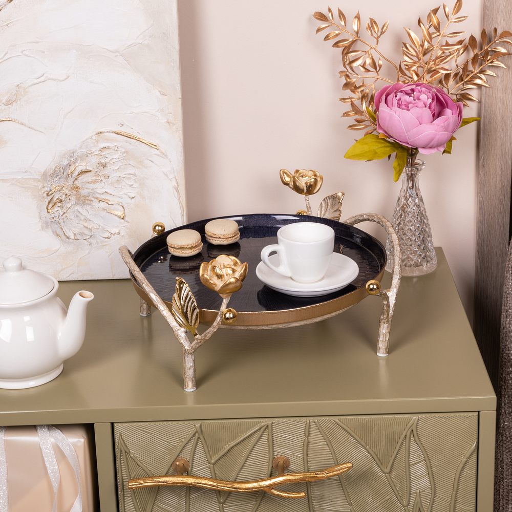 Стеклянный сервировочный поднос с металлическими ручками и ножками бренда BOGACHO— это отличное решение для тех, кто ищет стильный и практичный предмет интерьера. Выполненный из стекла, он гарантирует прочность и долговечность. Благодаря золотистым металлическим ручкам и ножкам, поднос декоративный выглядит очень элегантно и привлекательно. Имея круглую форму, он подойдет для подачи еды и напитков на завтрак в постель, а также в качестве подставки под горячее или для сервировки стола во время обеда и ужина. Этот элемент посуды идеально подходит для хранения различных предметов, таких как косметика и парфюмерия. С его помощью вы можете организовать удобное хранение в спальне, создавая прекрасное место для размещения свечей и других мелких предметов. Поднос от фирмы Богачо также подходит для подачи закусок и напитков, а его использование как фруктовницы или конфетницы добавит уют в ваш кухонный декор. Его дизайн и практичность делают его отличным выбором для подарка на день рождения, юбилей, свадьбу или новоселье — он станет настоящим украшением любого декора для дома и порадует девушек, женщин и мам! Аксессуары от бренда Богачо - сделайте свой дом не только утонченней, но и богаче! Диаметр стеклянного подноса 275мм