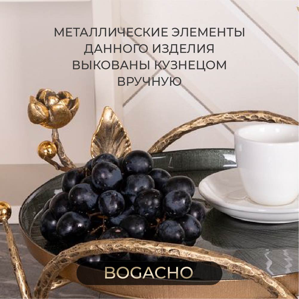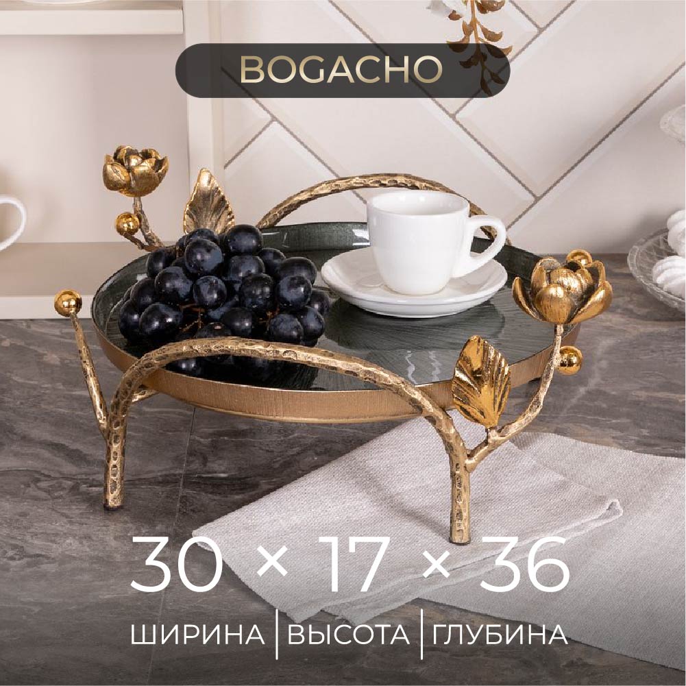 Стеклянный сервировочный поднос с металлическими ручками и ножками бренда BOGACHO— это отличное решение для тех, кто ищет стильный и практичный предмет интерьера. Выполненный из стекла, он гарантирует прочность и долговечность. Благодаря золотистым металлическим ручкам и ножкам, поднос декоративный выглядит очень элегантно и привлекательно. Имея круглую форму, он подойдет для подачи еды и напитков на завтрак в постель, а также в качестве подставки под горячее или для сервировки стола во время обеда и ужина. Этот элемент посуды идеально подходит для хранения различных предметов, таких как косметика и парфюмерия. С его помощью вы можете организовать удобное хранение в спальне, создавая прекрасное место для размещения свечей и других мелких предметов. Поднос от фирмы Богачо также подходит для подачи закусок и напитков, а его использование как фруктовницы или конфетницы добавит уют в ваш кухонный декор. Его дизайн и практичность делают его отличным выбором для подарка на день рождения, юбилей, свадьбу или новоселье — он станет настоящим украшением любого декора для дома и порадует девушек, женщин и мам! Аксессуары от бренда Богачо - сделайте свой дом не только утонченней, но и богаче! Диаметр стеклянного подноса 275мм