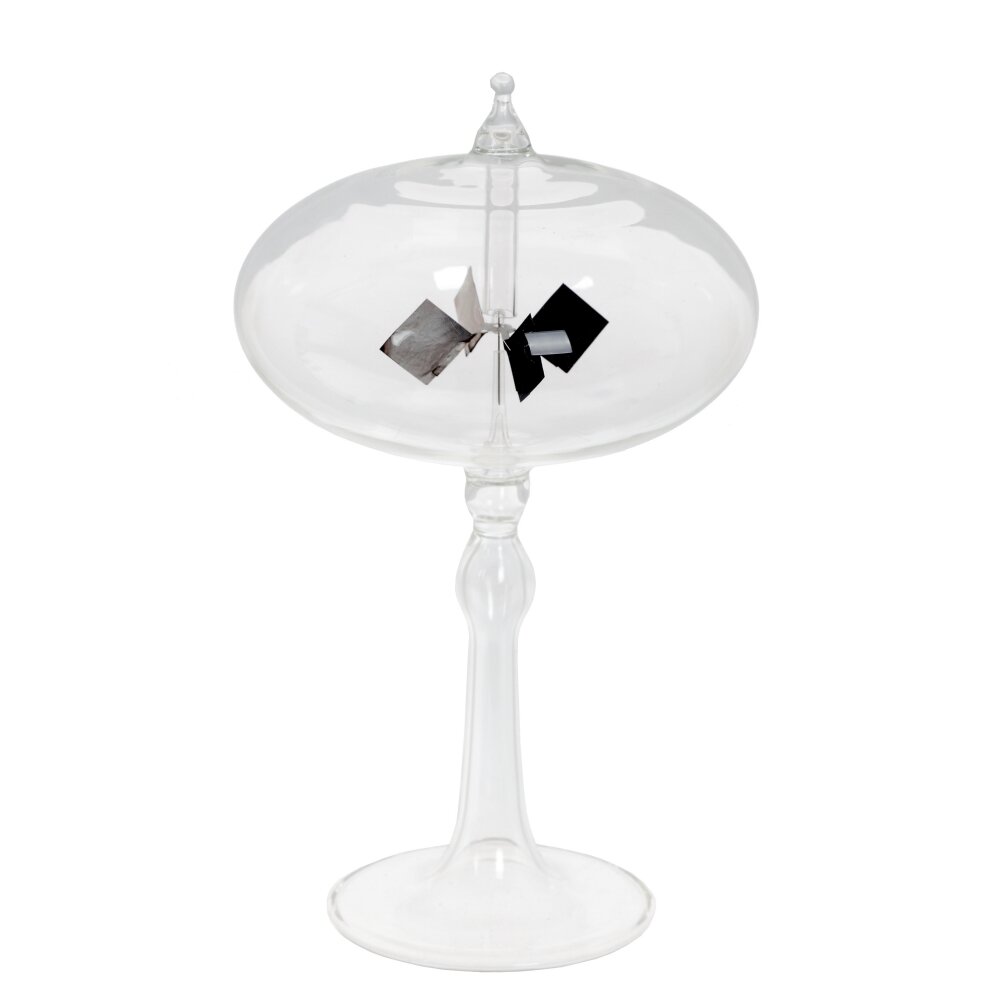 Антистресс - Радиометр состоит из стеклянной колбы с вакуумом внутри. Внутри колбы установлено несколько вертикальных металлических лопастей из металла. При воздействии солнечного света, искусственного освещения или инфракрасного излучения (даже тепла рук может быть достаточно) лопасти начинают вращаться без видимой движущей силы: тёмные стороны удаляются от источника излучения, а светлые стороны приближаются. Охлаждение вызывает вращение в обратном направлении.